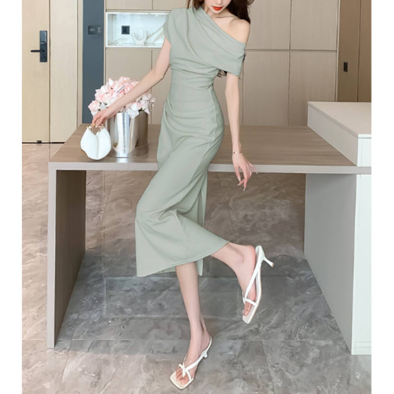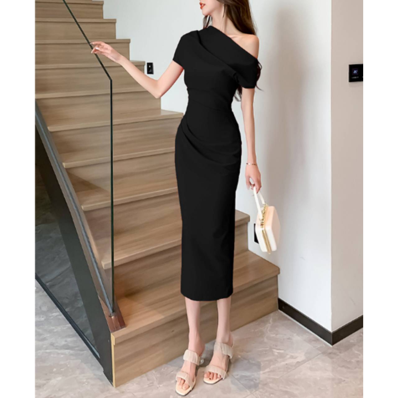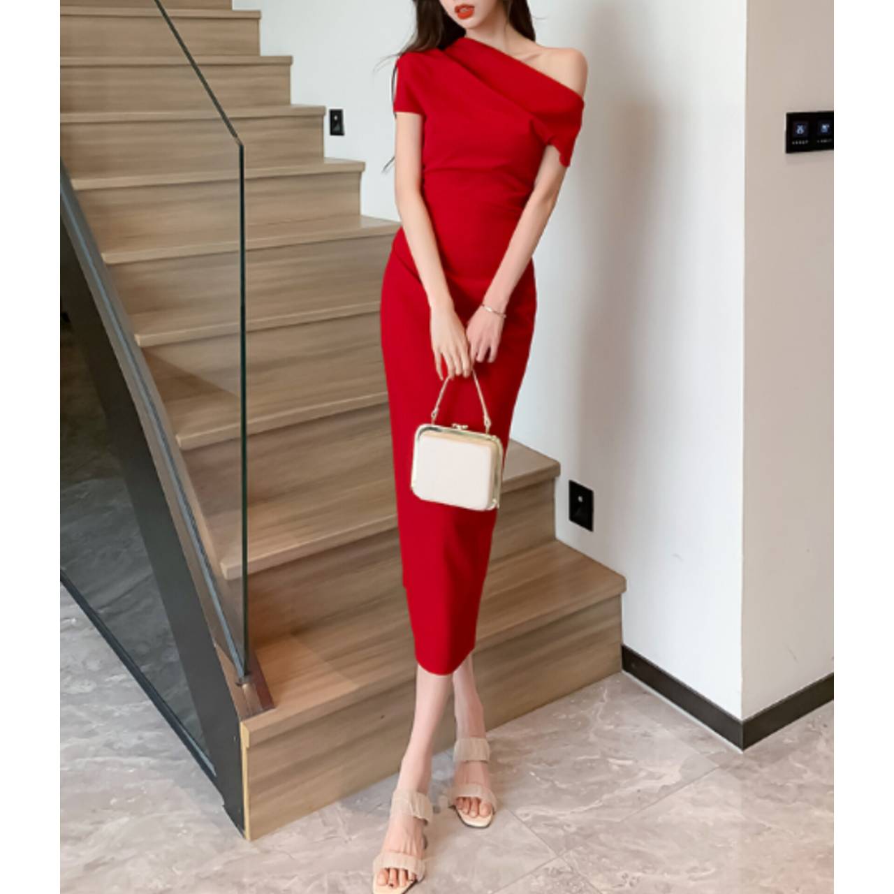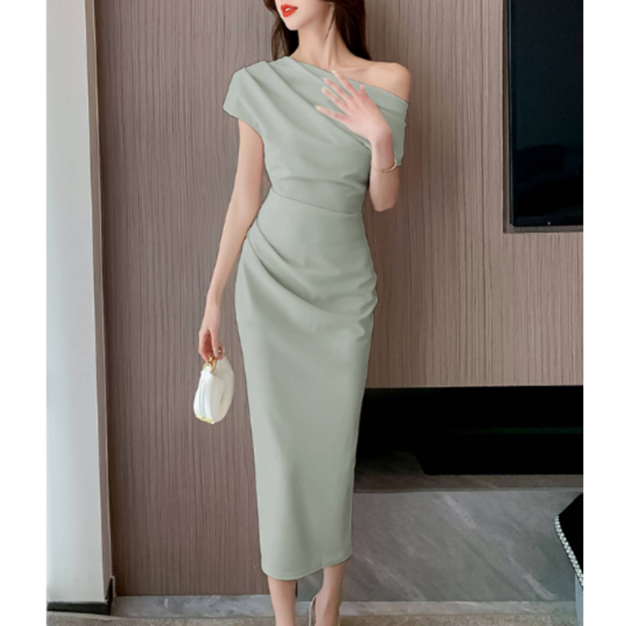 全4色 ドレス イブニングドレス 韓国ドレス ワンショルダー ワンショル ルーズショルダー ハイウエスト ミモレ丈 タイト バックスリット 美シルエット スタイルアップ S/XL 韓国 【K7636】