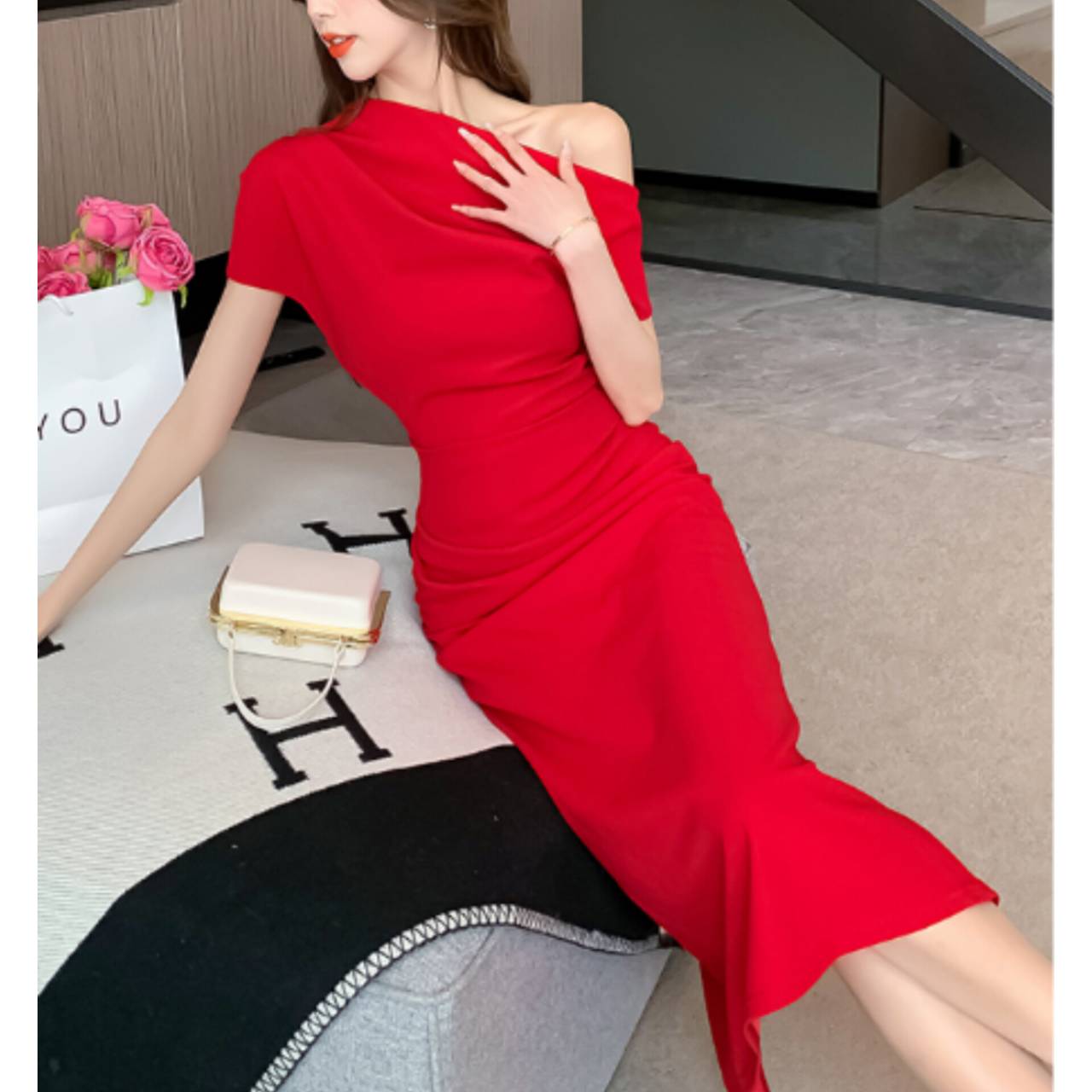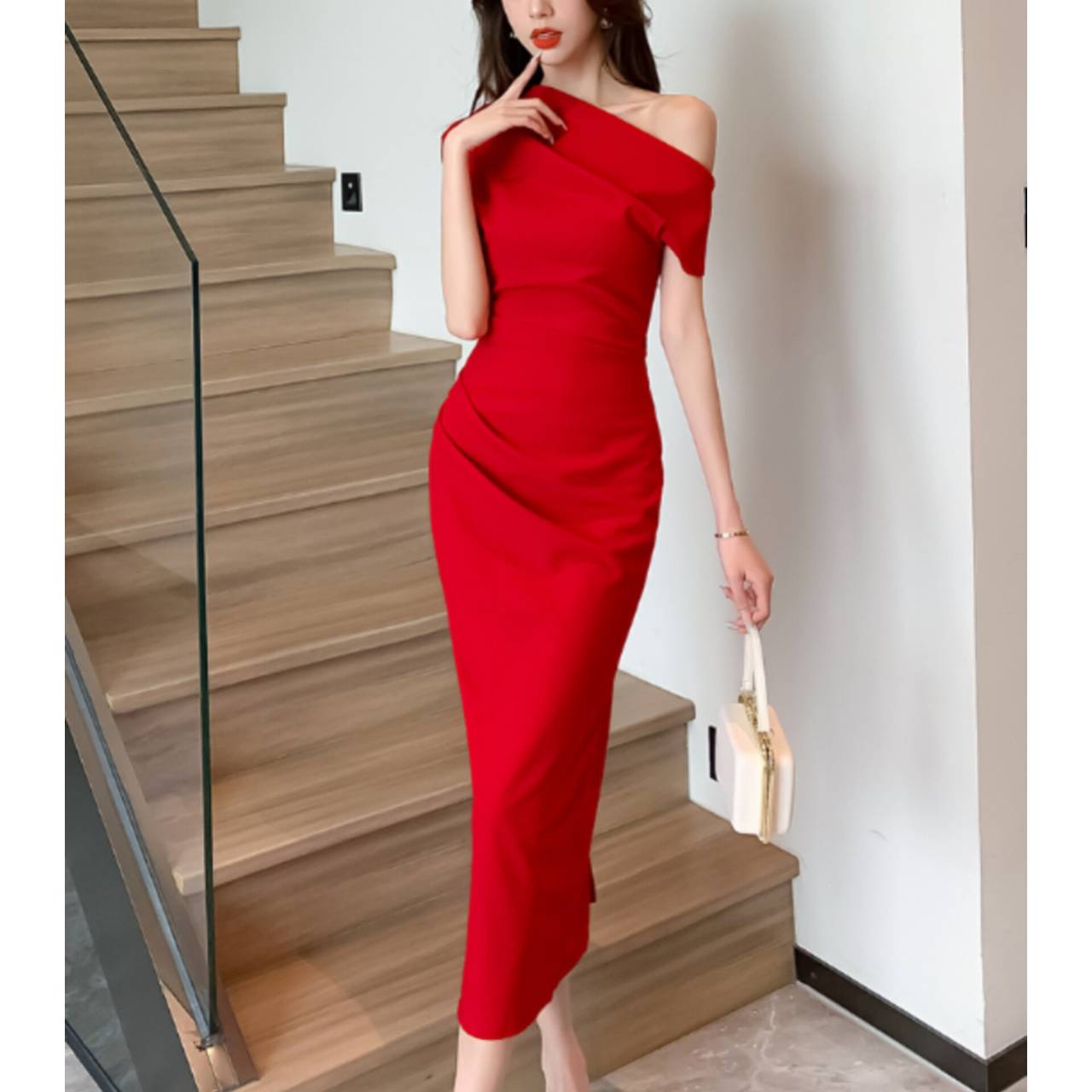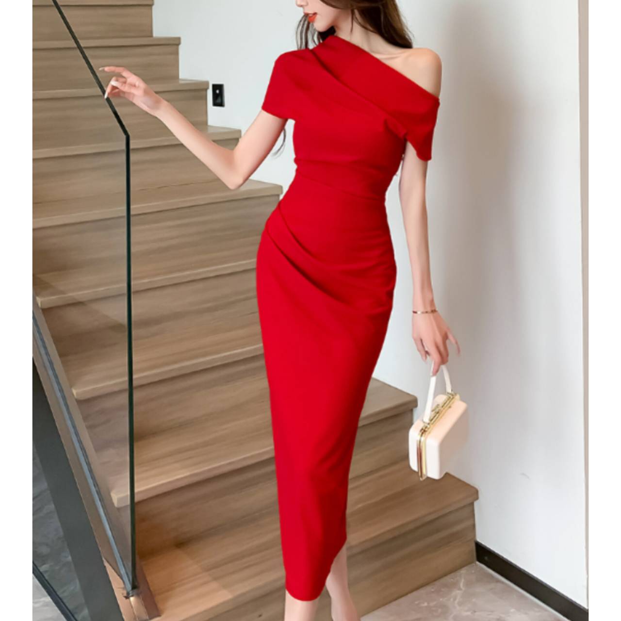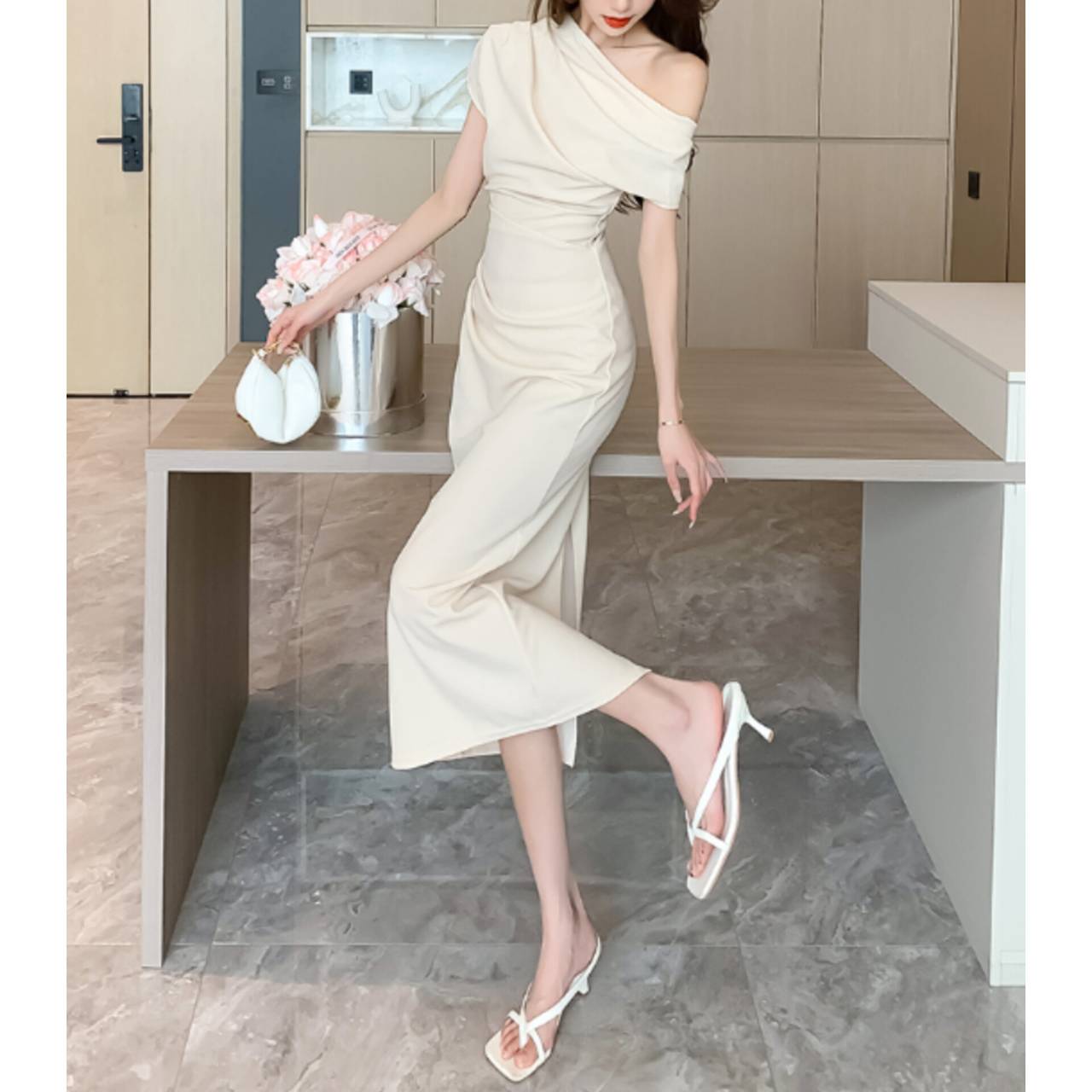 全4色 ドレス イブニングドレス 韓国ドレス ワンショルダー ワンショル ルーズショルダー ハイウエスト ミモレ丈 タイト バックスリット 美シルエット スタイルアップ S/XL 韓国 【K7636】