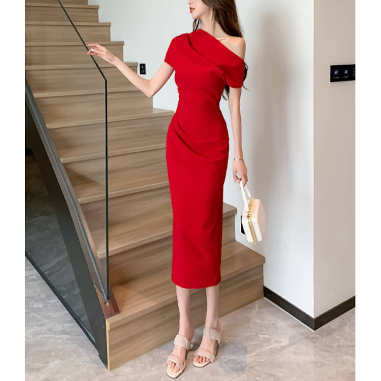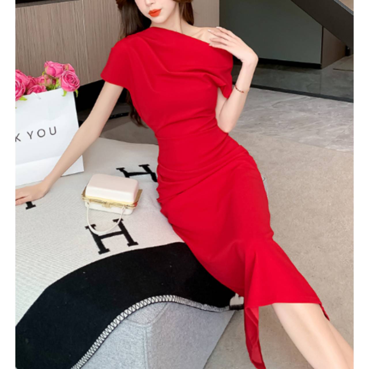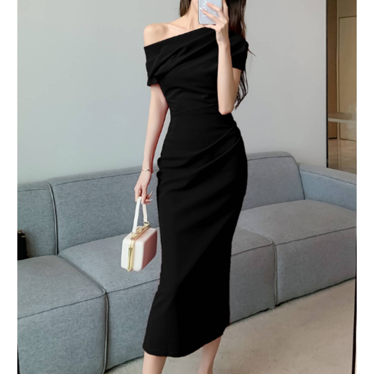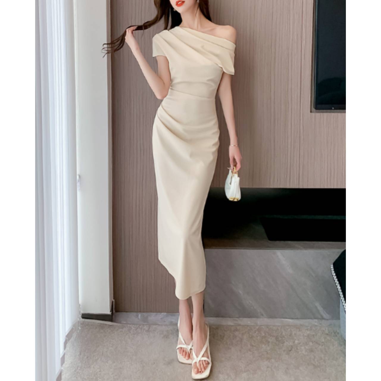 全4色 ドレス イブニングドレス 韓国ドレス ワンショルダー ワンショル ルーズショルダー ハイウエスト ミモレ丈 タイト バックスリット 美シルエット スタイルアップ S/XL 韓国 【K7636】