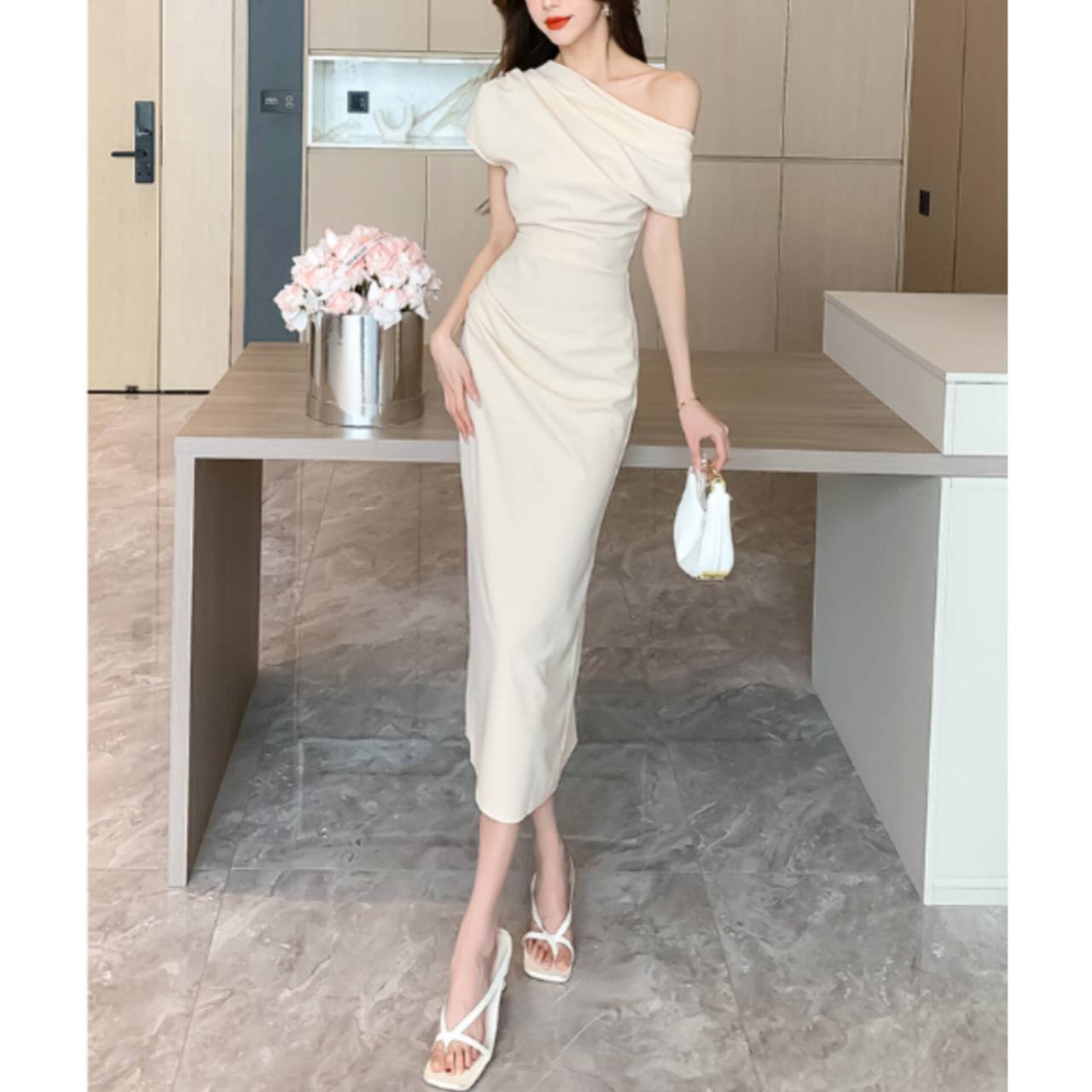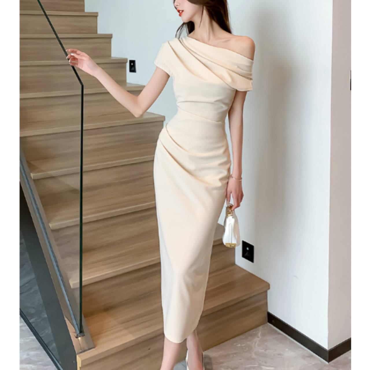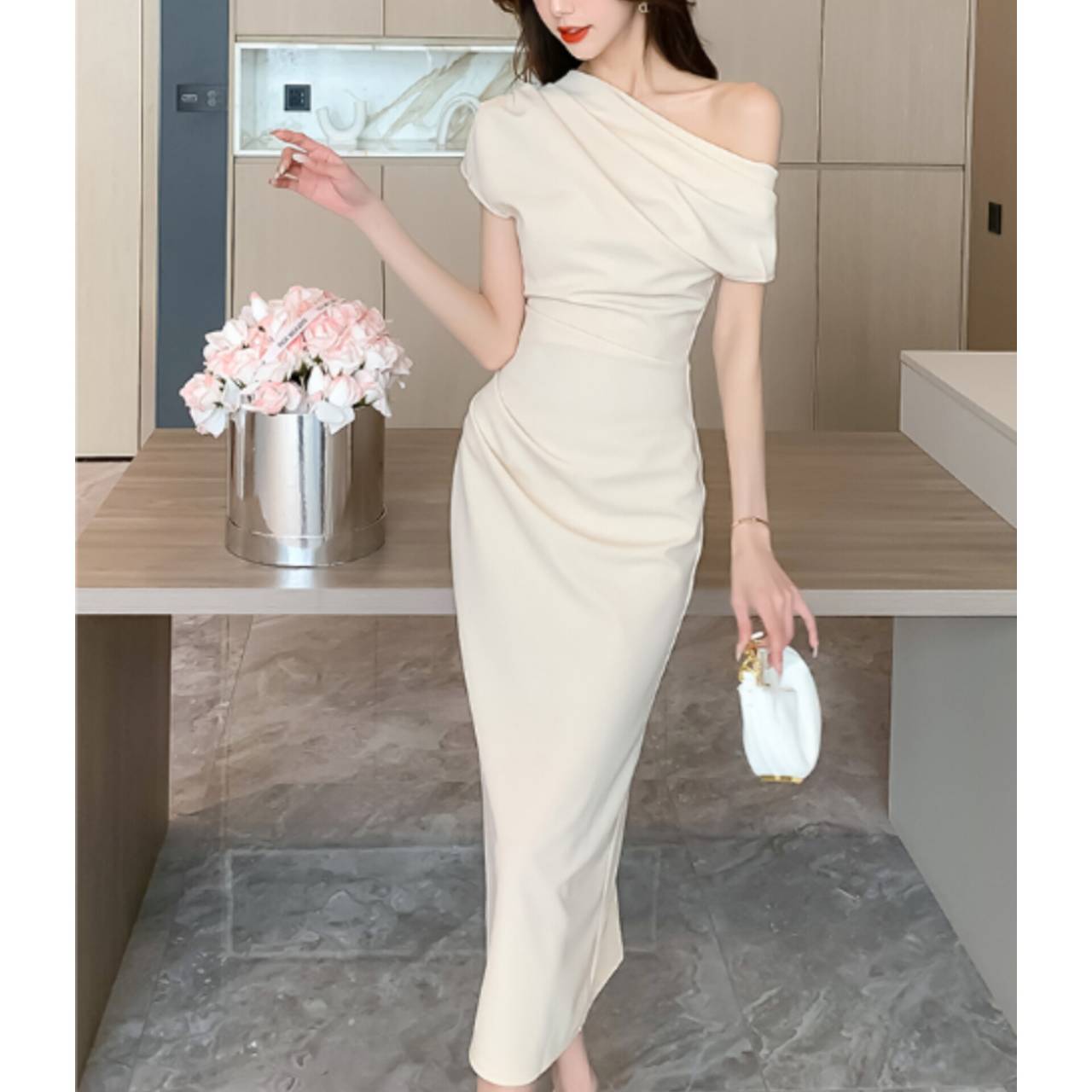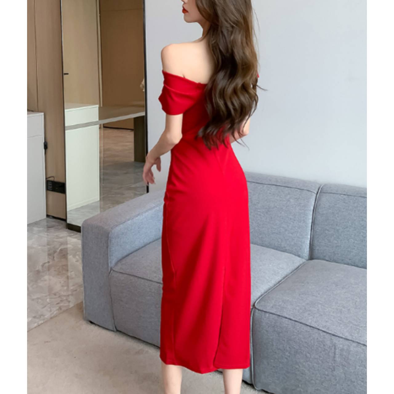 全4色 ドレス イブニングドレス 韓国ドレス ワンショルダー ワンショル ルーズショルダー ハイウエスト ミモレ丈 タイト バックスリット 美シルエット スタイルアップ S/XL 韓国 【K7636】