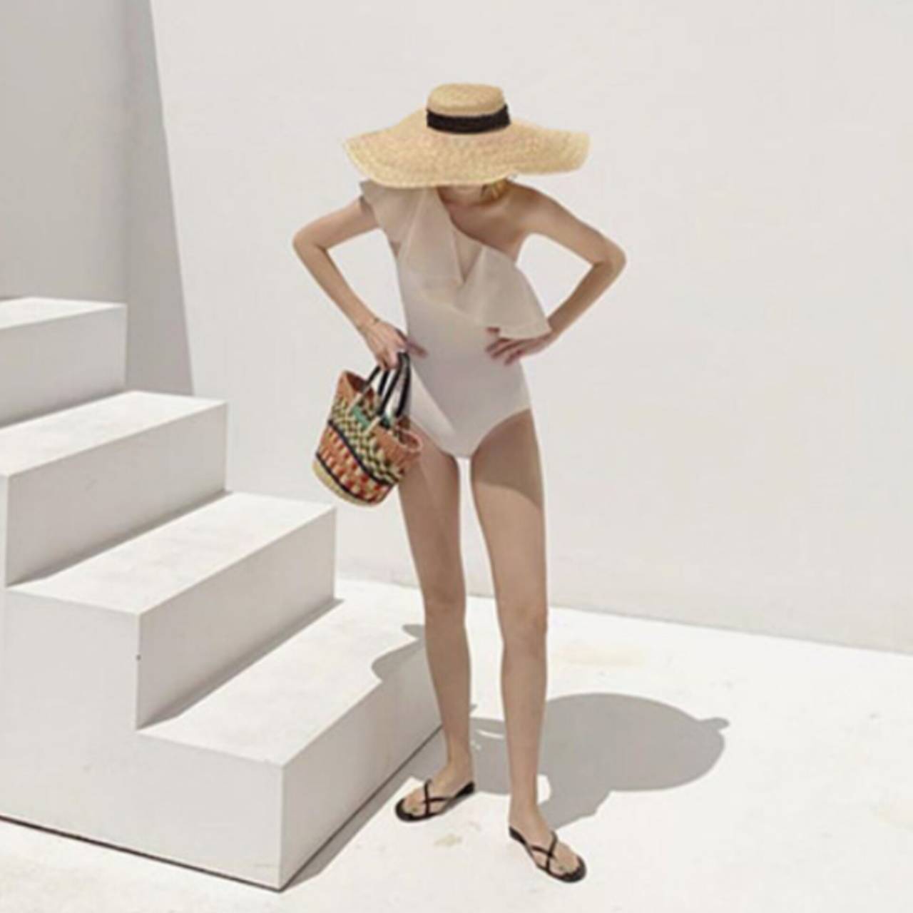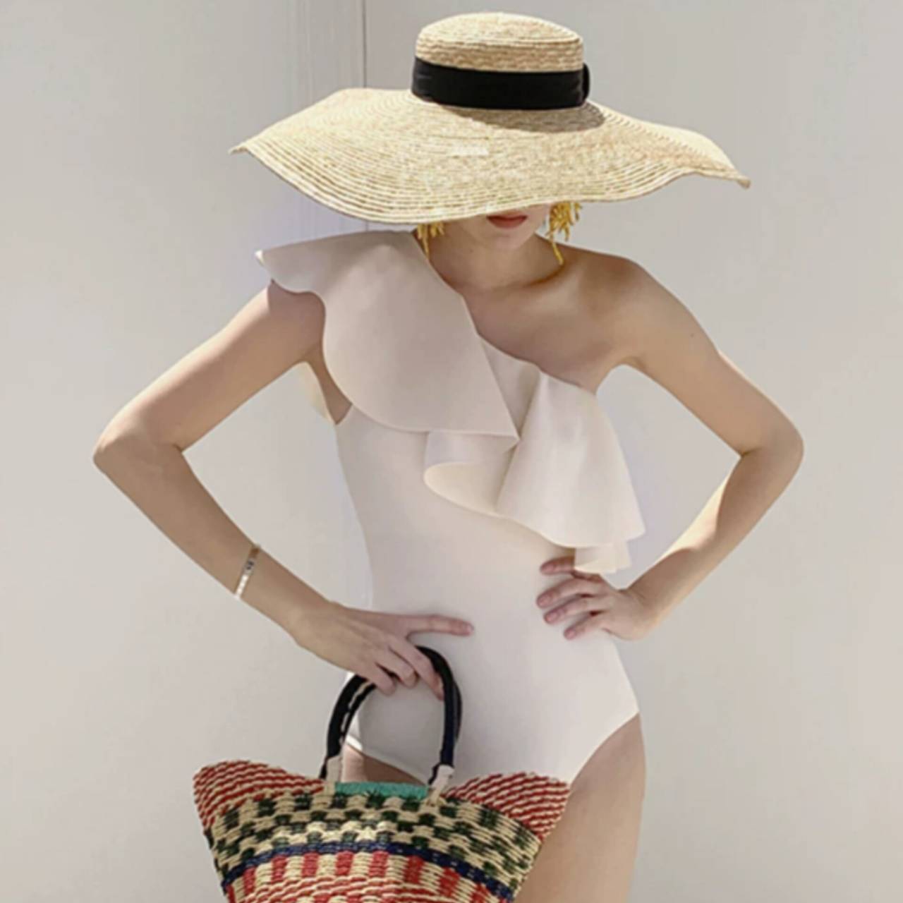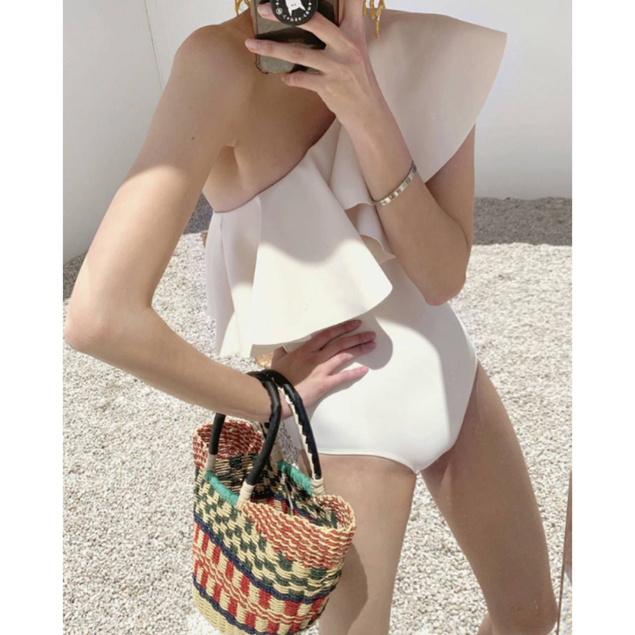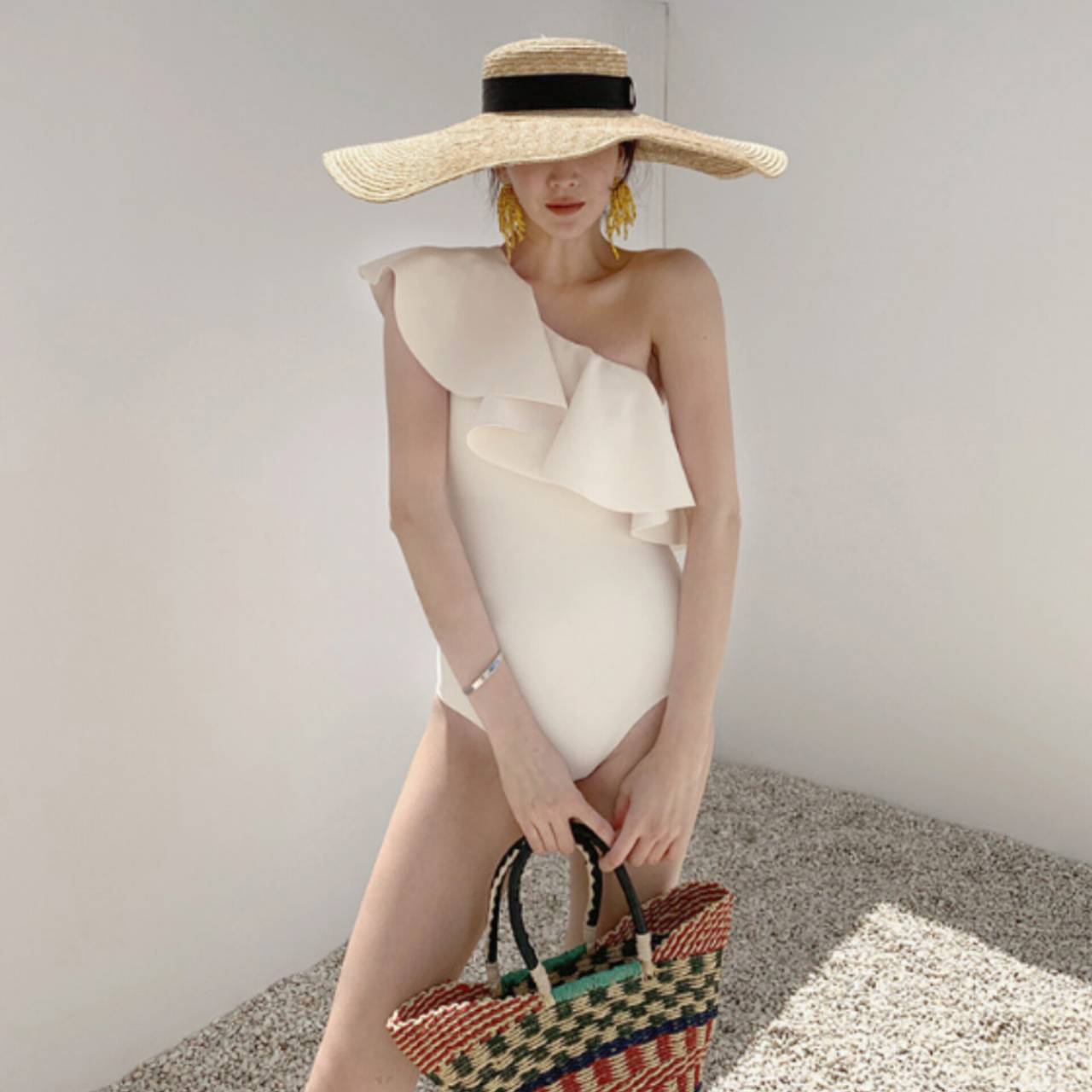 大人の余裕をまとうワンショルダーフリルスイムウェア――ただの白では終わらない。