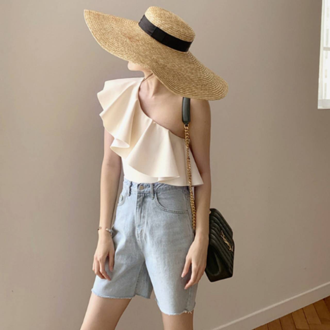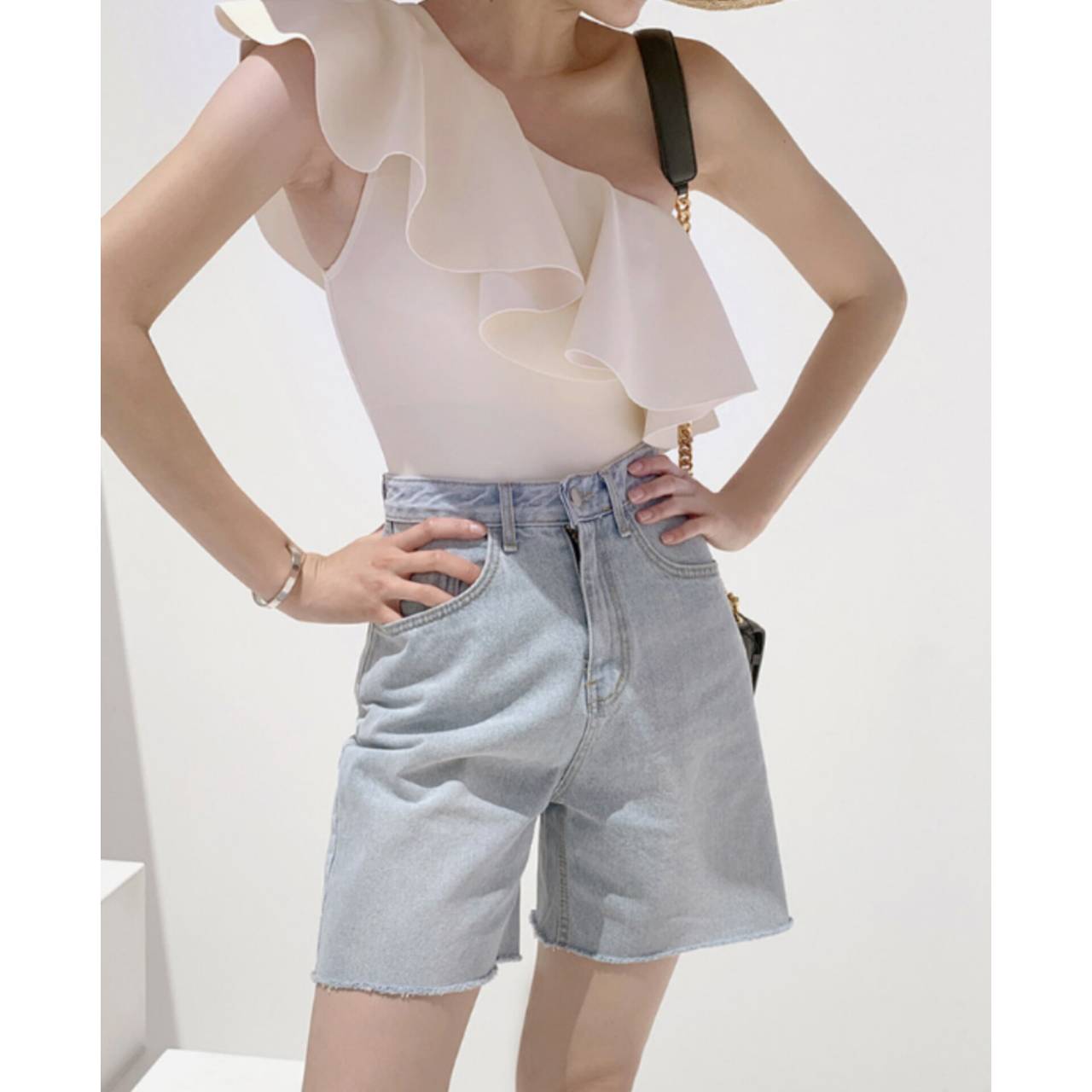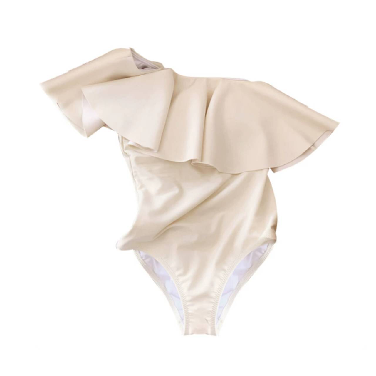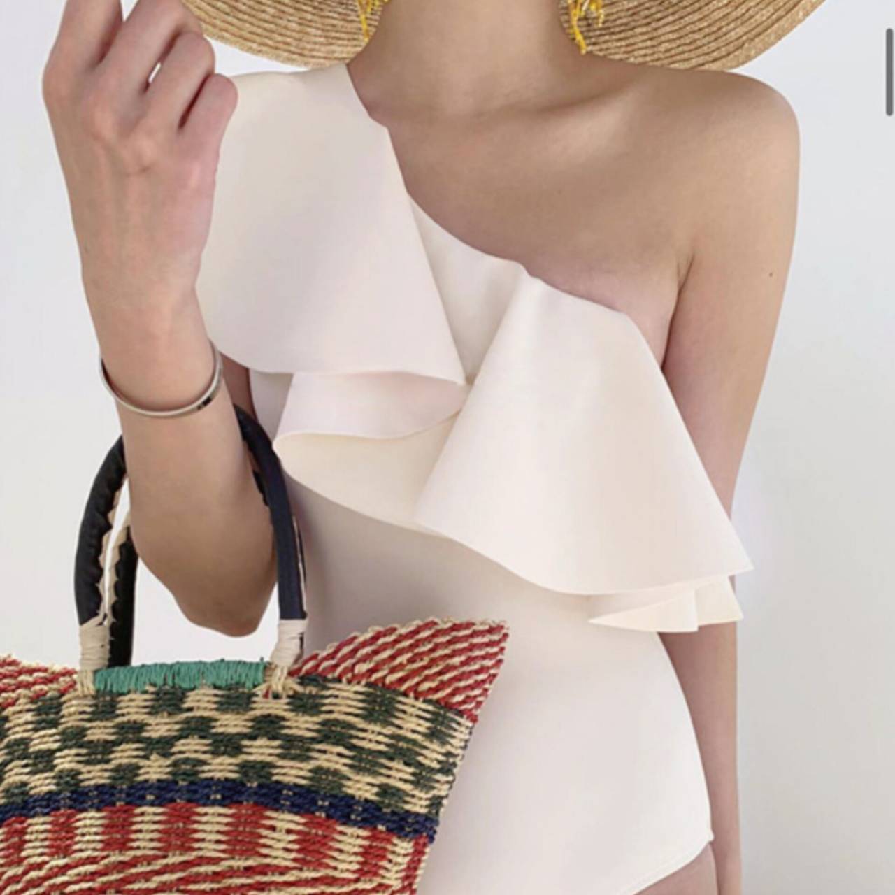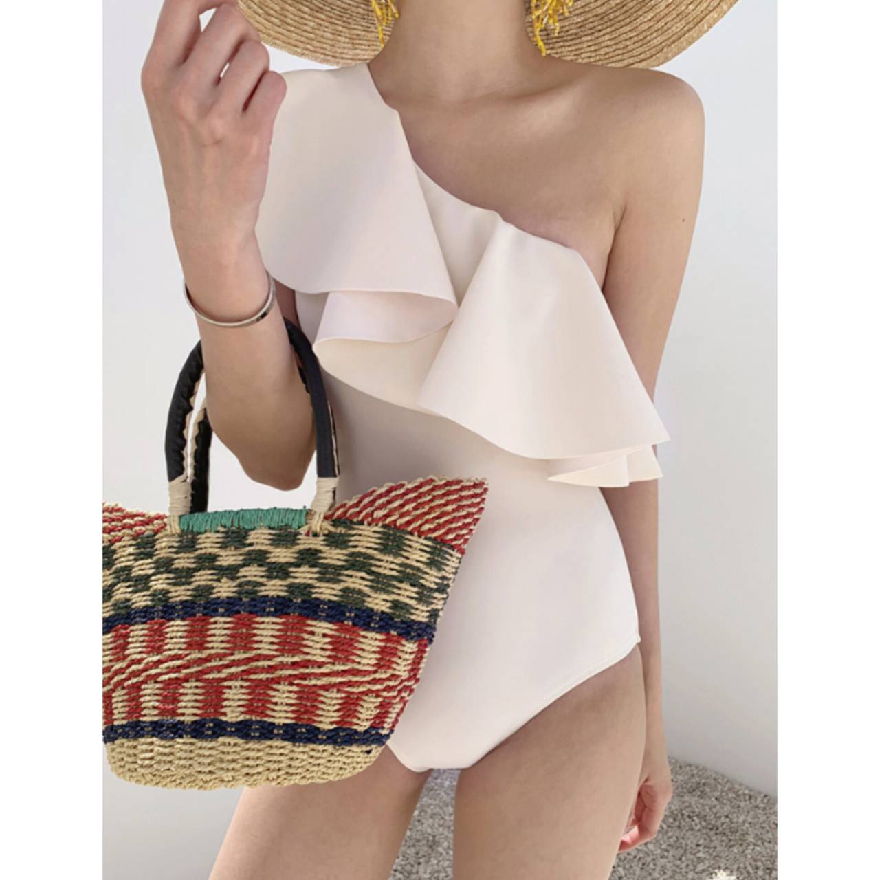 大人の余裕をまとうワンショルダーフリルスイムウェア――ただの白では終わらない。