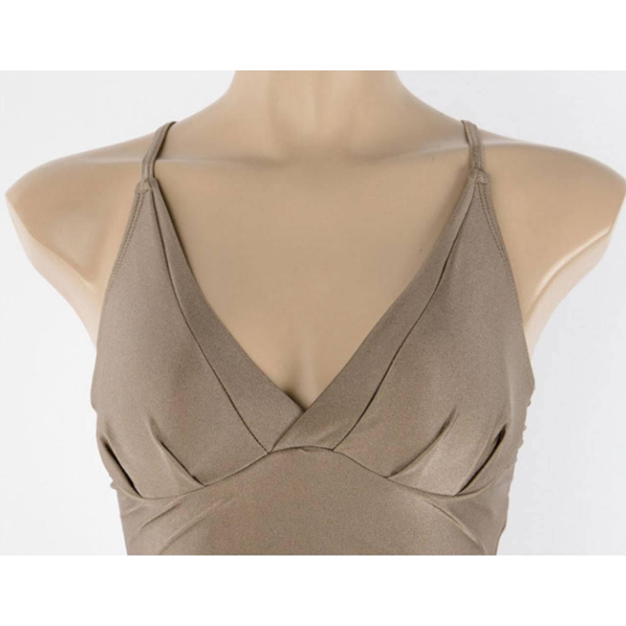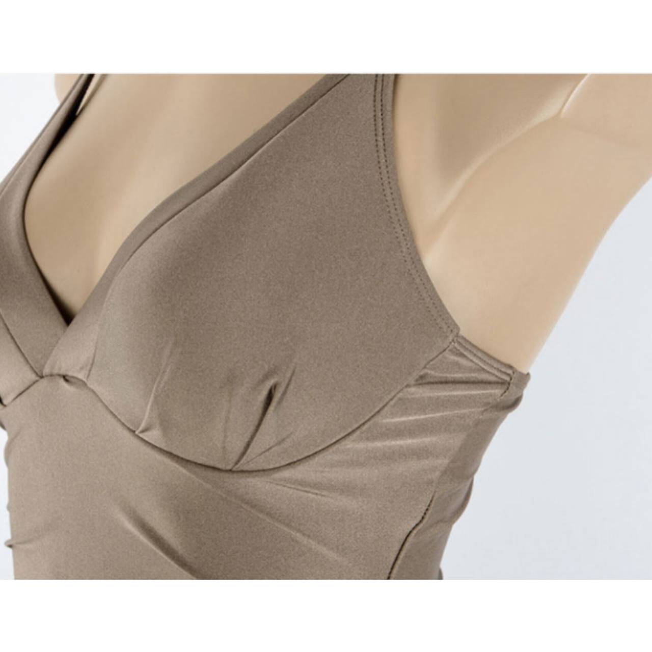 胸元からウエストへ視線を流し、くびれを強調します。カラー:カーキブラウン(大人肌に馴染む高級カラー)