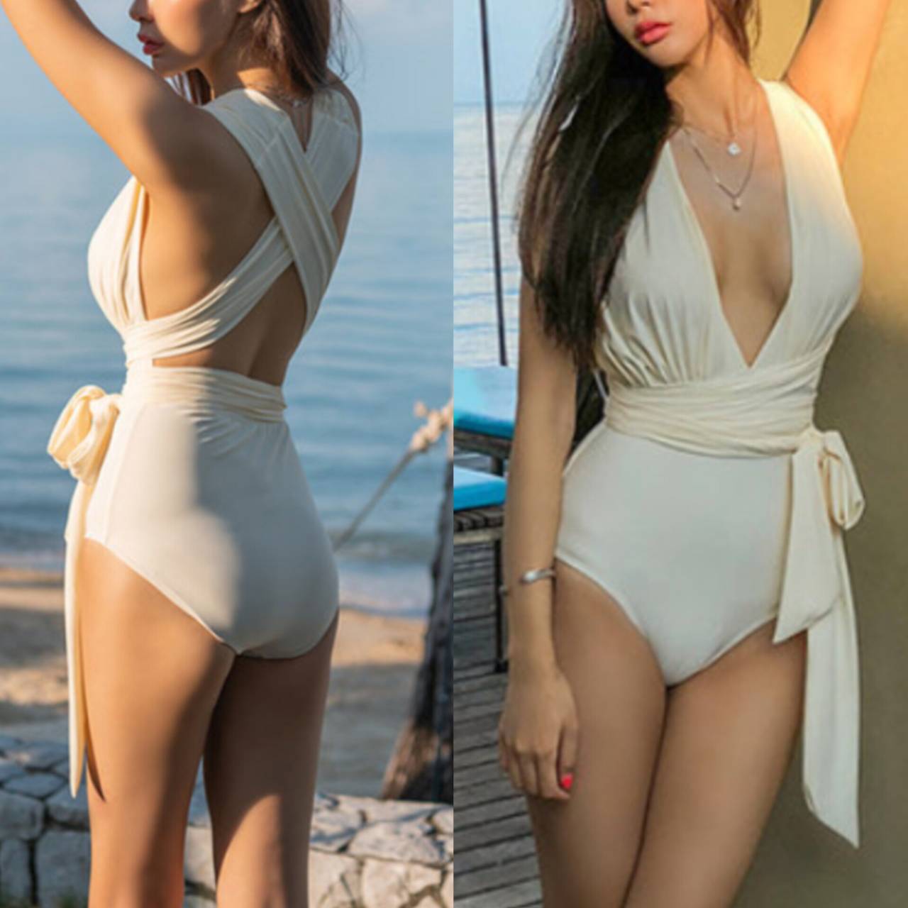 水着 ワンピース水着 韓国水着 深Vネック バッククロス バックコンシャス バックシャン ウエストマーク リボンマーク リボン ハイウエスト 肌見せ スタイルアップ 盛れる水着 脚長効果 ホワイト M/XL 韓国【B9698】