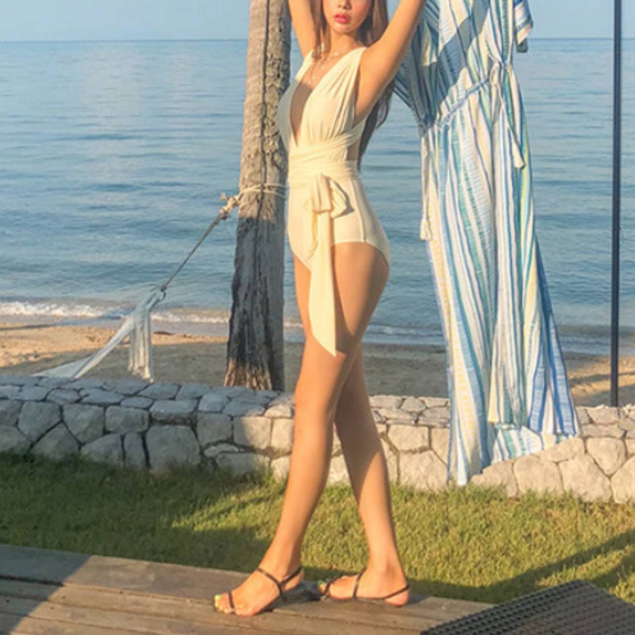 さらりと肌に吸い付き、水辺でも重たく見えないマットな質感が大人の高級感を演出します。