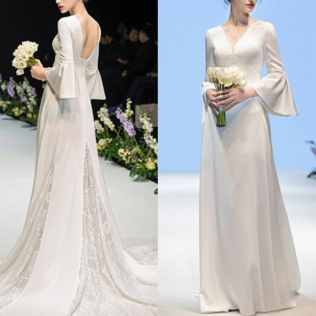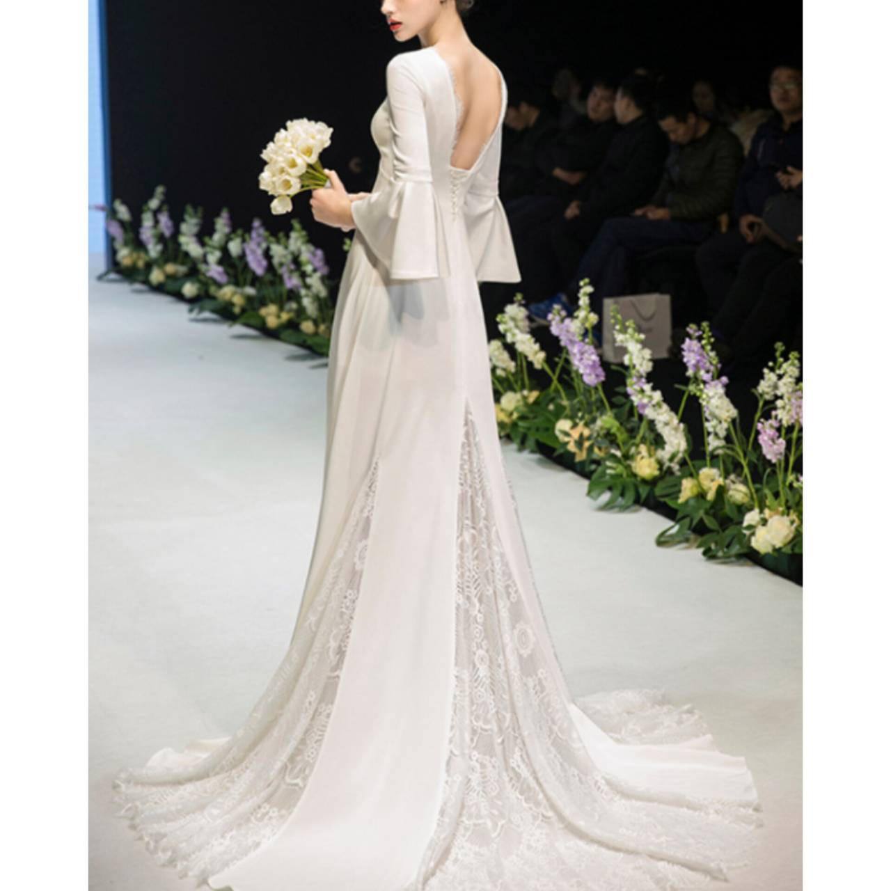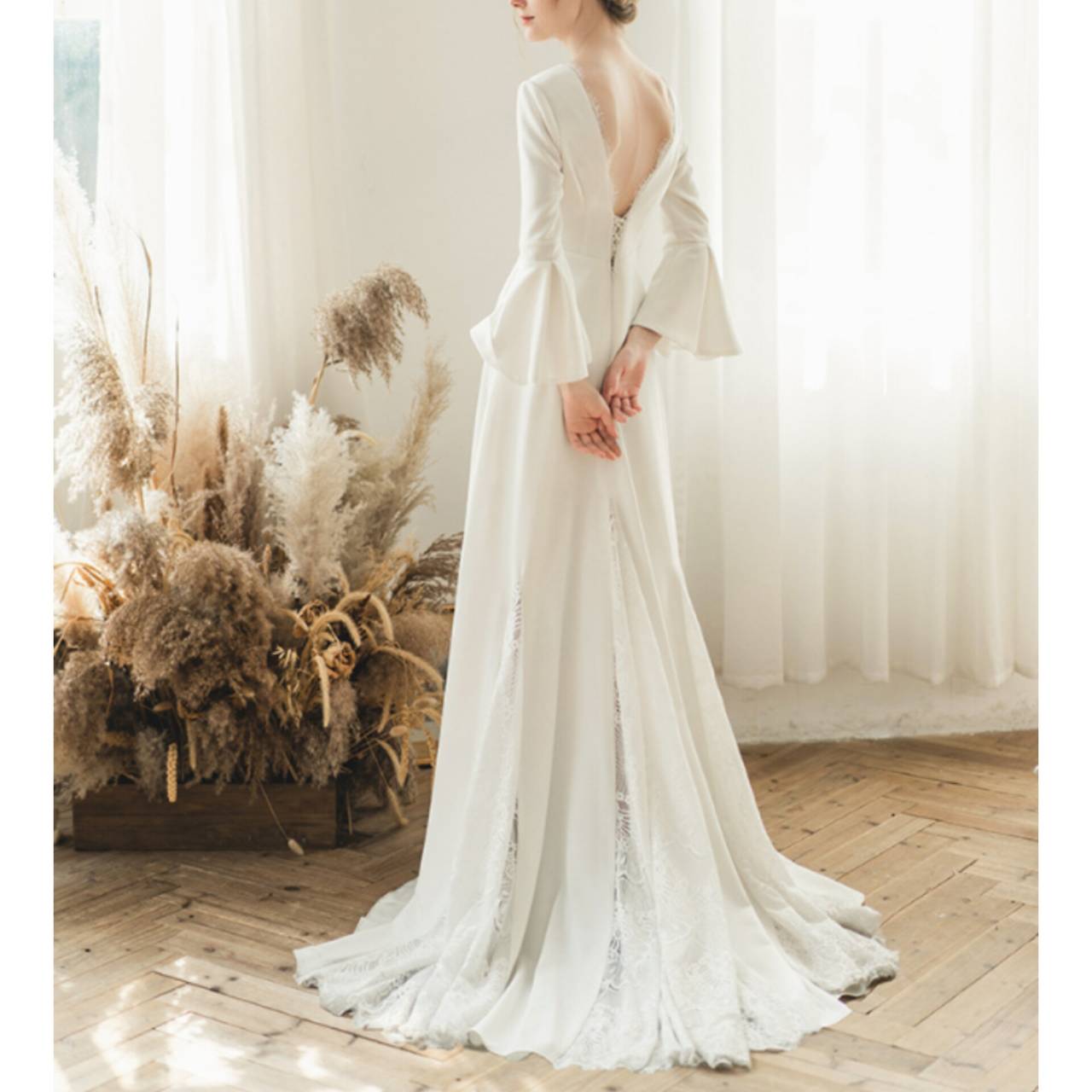 バックレス ウェディングドレス 韓国ドレス Vネックライク クルーネック シアー 長袖 ベルスリーブ レース バックコンシャス バックレースアップ レースアップ バックシャン エンパイアライン Aライン ロングトレーン ロング トレーン 異素材ミックス エレガント XS/3XL 韓国【K7077】