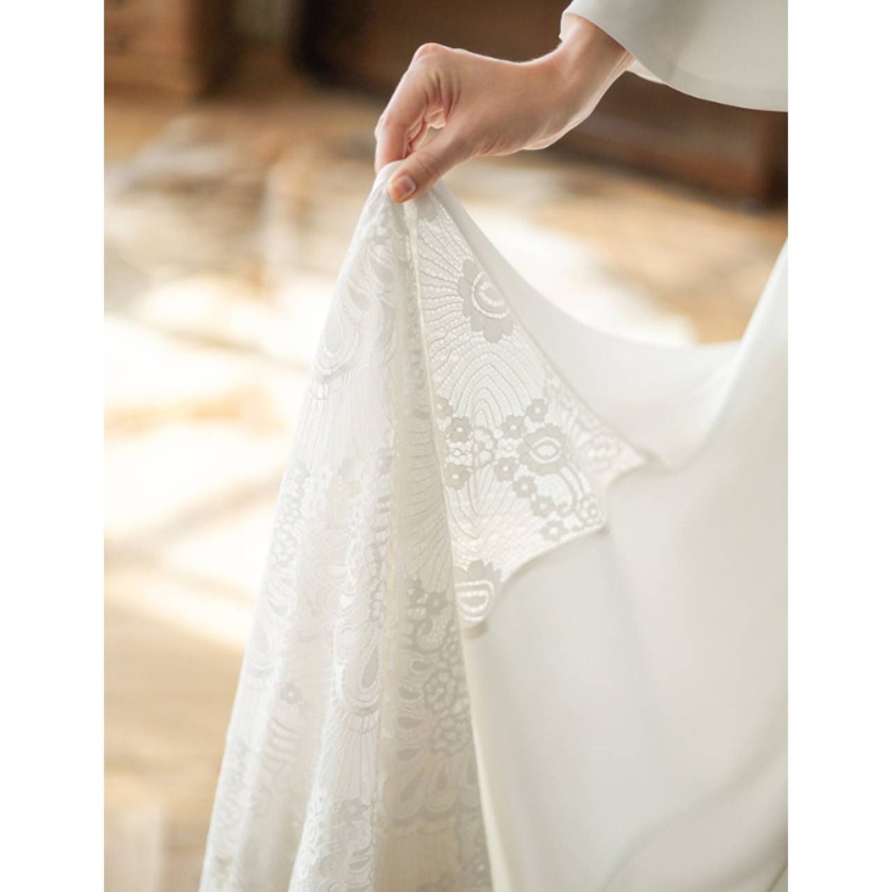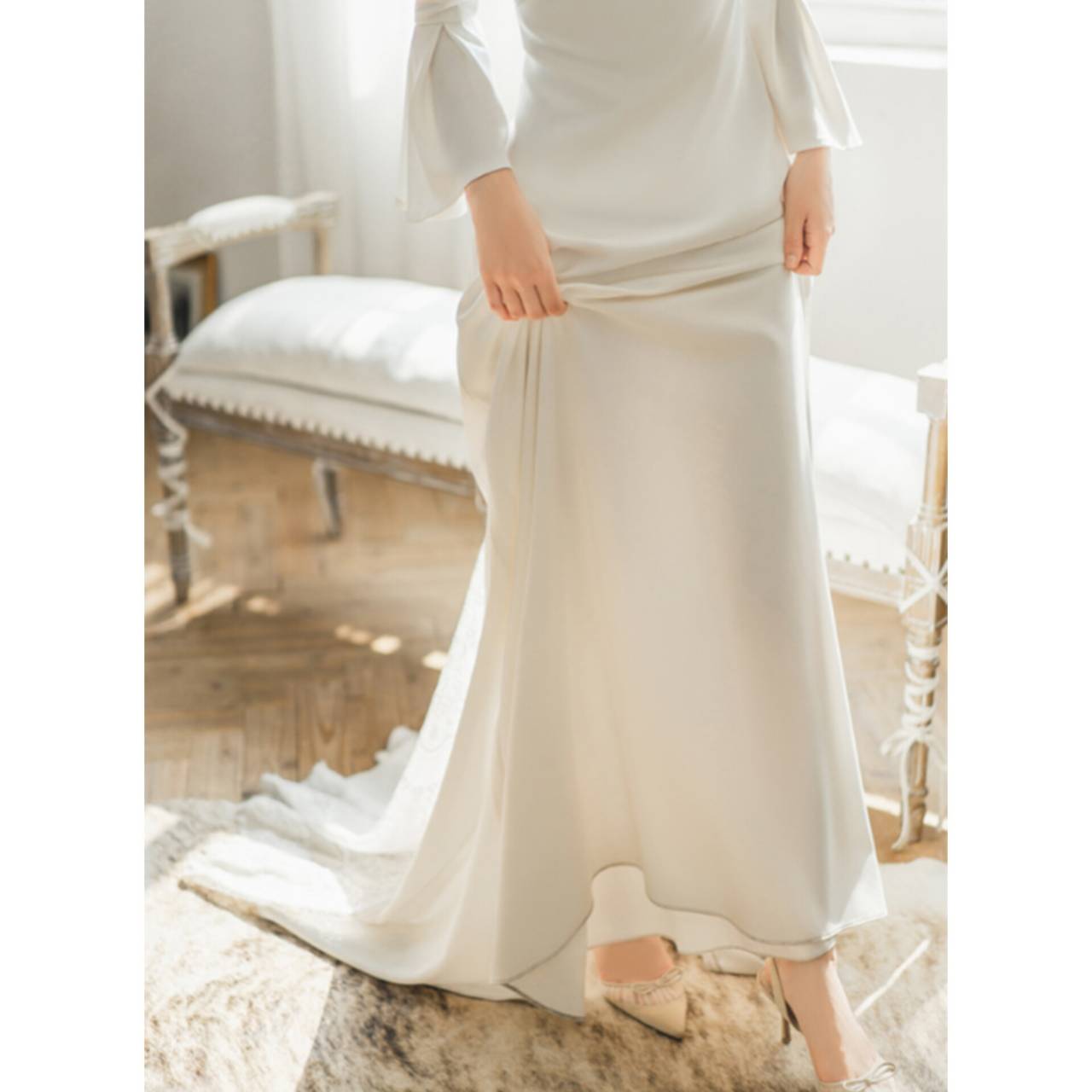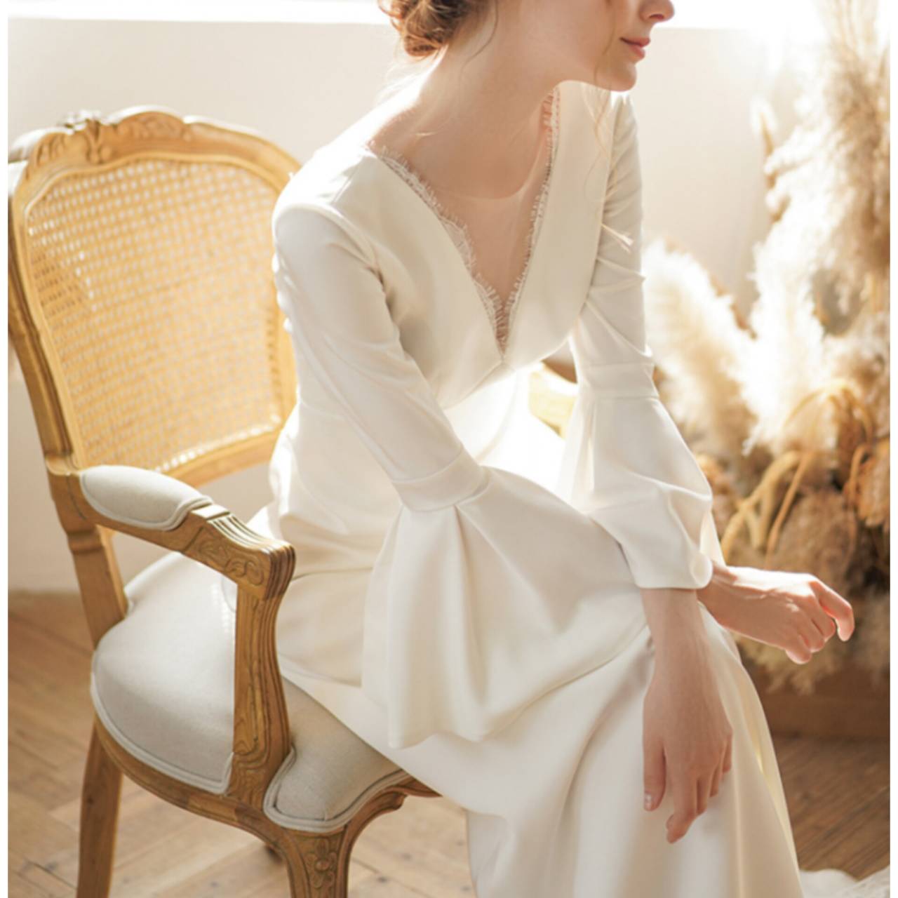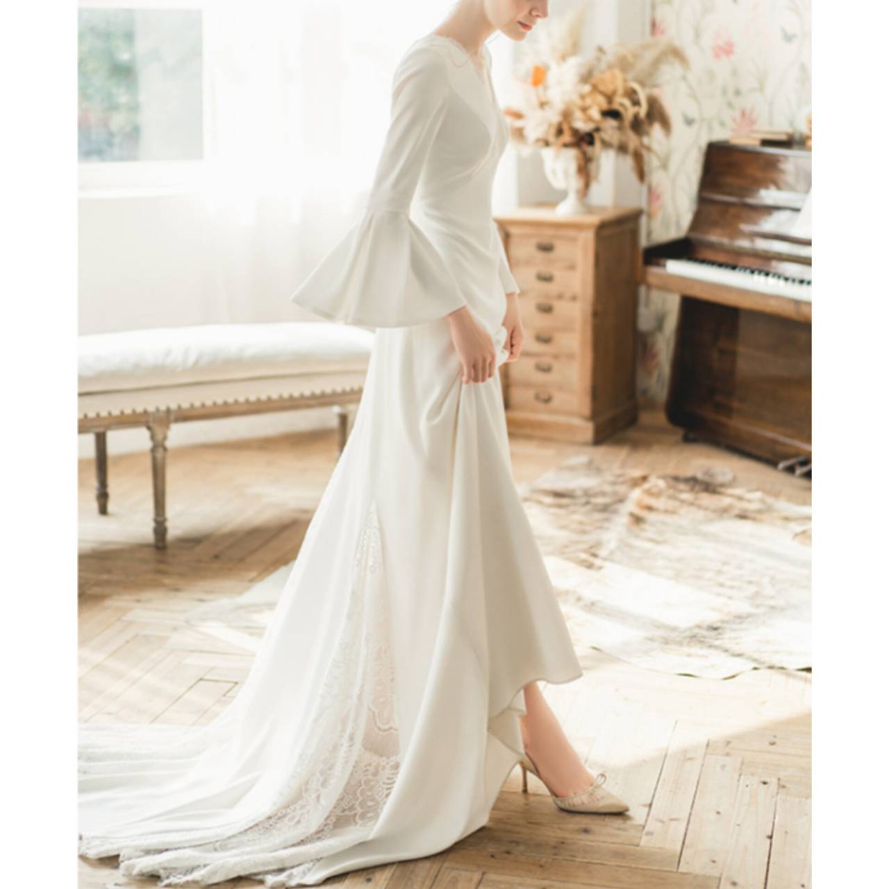 大人の花嫁にこそ選んでほしい、洗練ミニマル・ウェディングドレス。無駄な装飾を削ぎ落とし、シルエットと素材の美しさで魅せる一着。