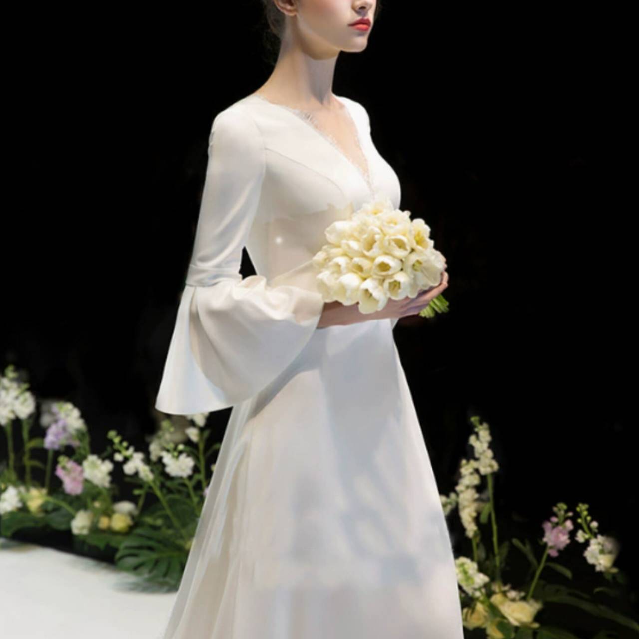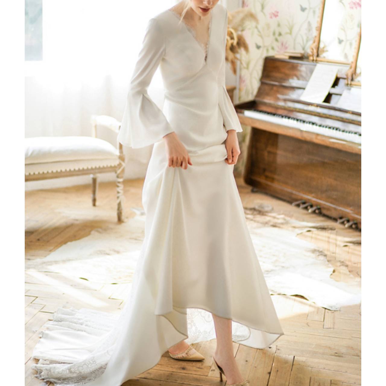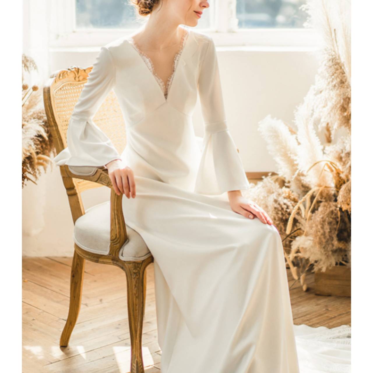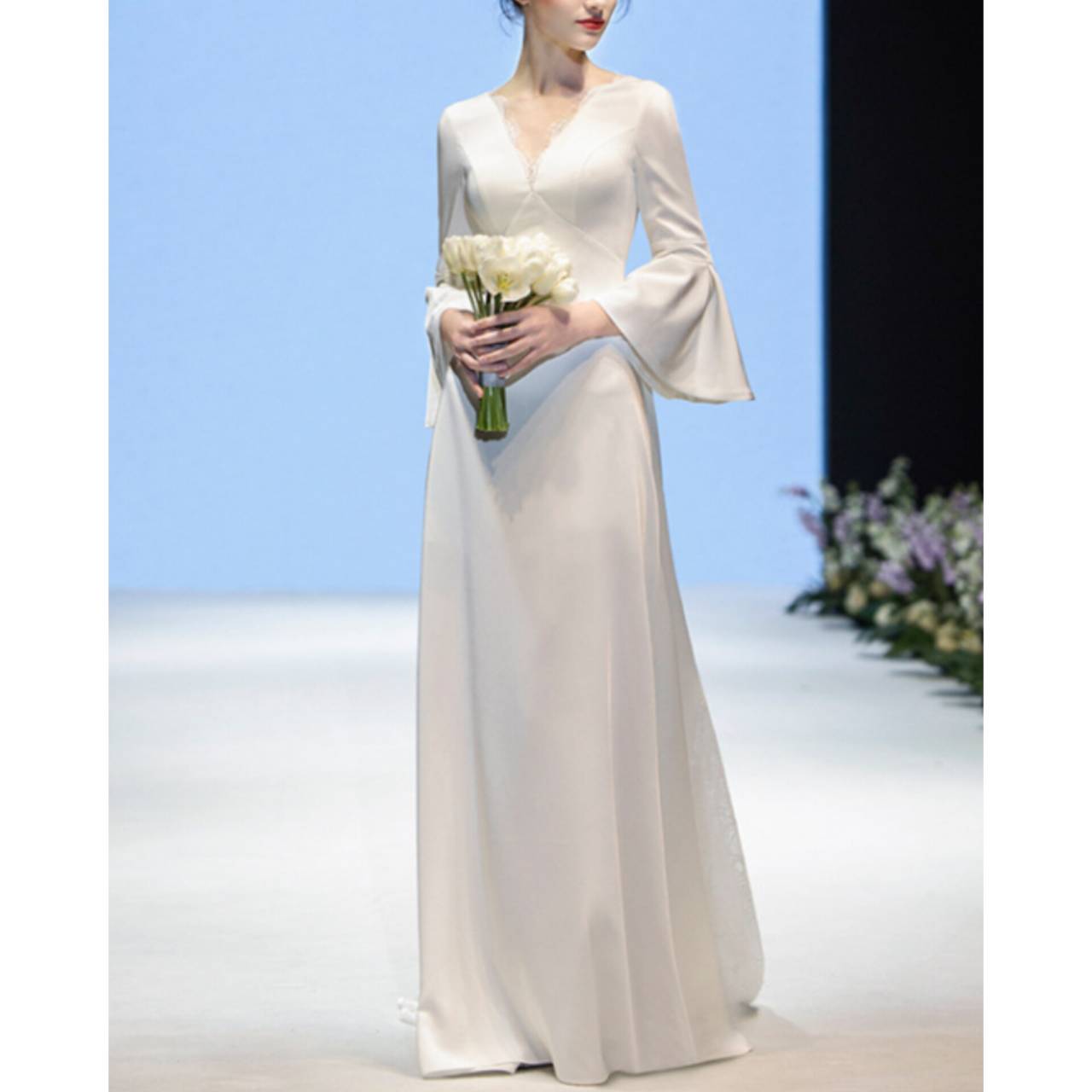 さらに、特徴的なフレアスリーブ(ベルスリーブ)が二の腕を優しくカバーし、動きのあるエレガントな印象に仕上げています。バックスタイルは程よく開いたVラインで、後ろ姿まで計算されたデザイン。