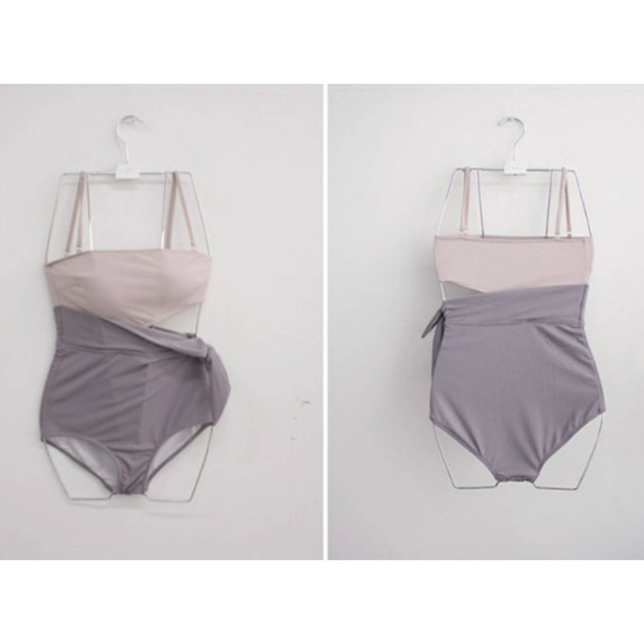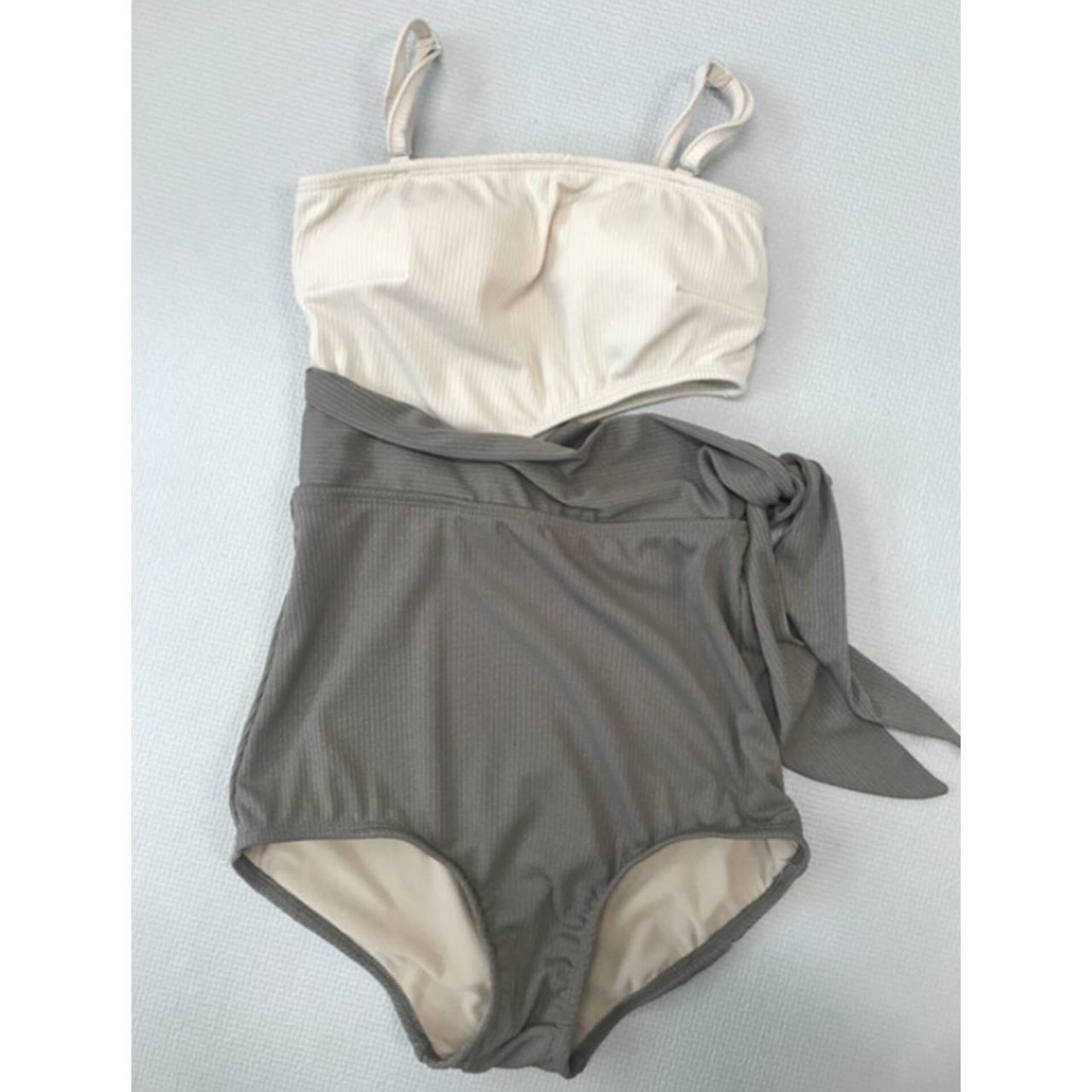 全2色 水着 ワンピース水着 韓国水着 スクエアネック サイドオープン ウエストリボン リボン ウエストマーク ハイウエスト リブ リブ素材 バイカラー アシンメトリー くすみカラー 淡色 スタイルアップ 脚長効果 盛れる水着 M/XL 韓国【B9696】