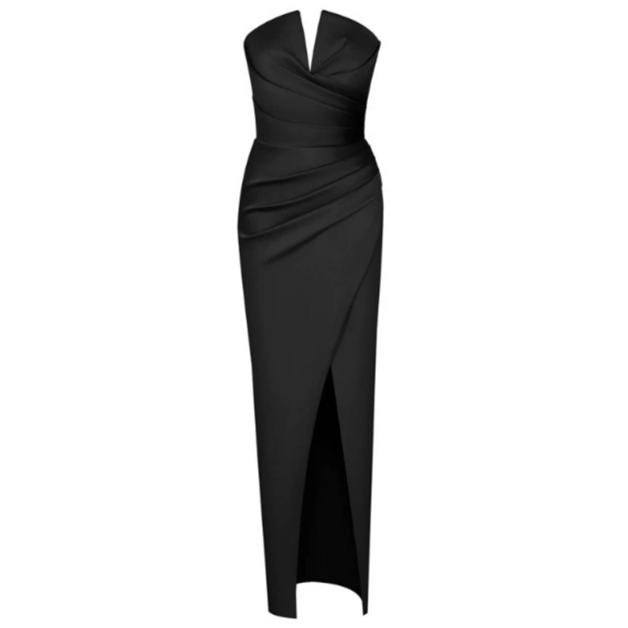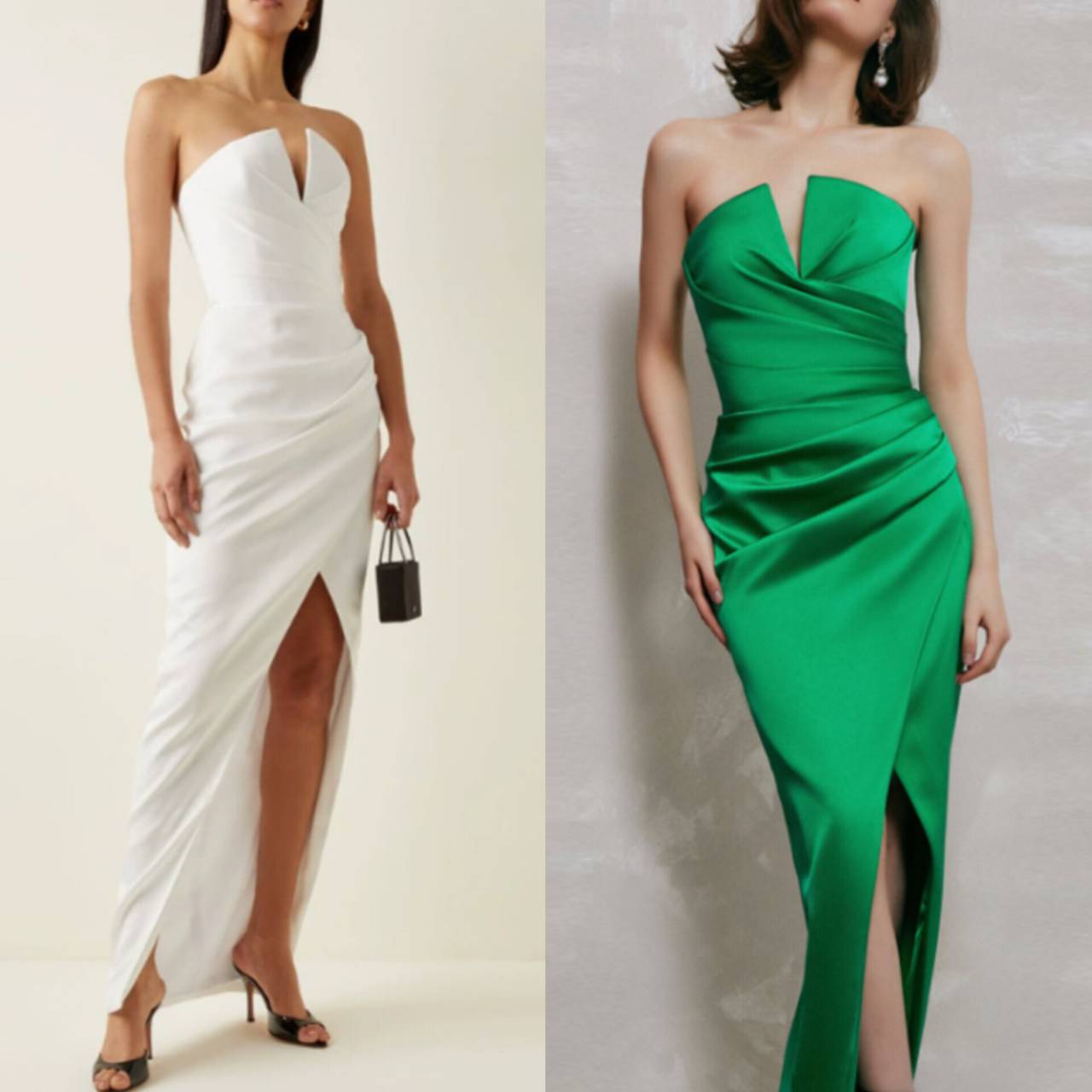 全3色 ドレス イブニングドレス 韓国ドレス ビスチェ 胸元スリット ドレープ ハイウエスト タイト フロントスリット ラップドレス風 ロング 美脚効果 スタイルアップ サテン S/2XL 韓国【K7681】
