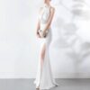 ハイネックデザインがデコルテをすっきりと引き立て、深めのスリットが脚を長く、しなやかに見せます。