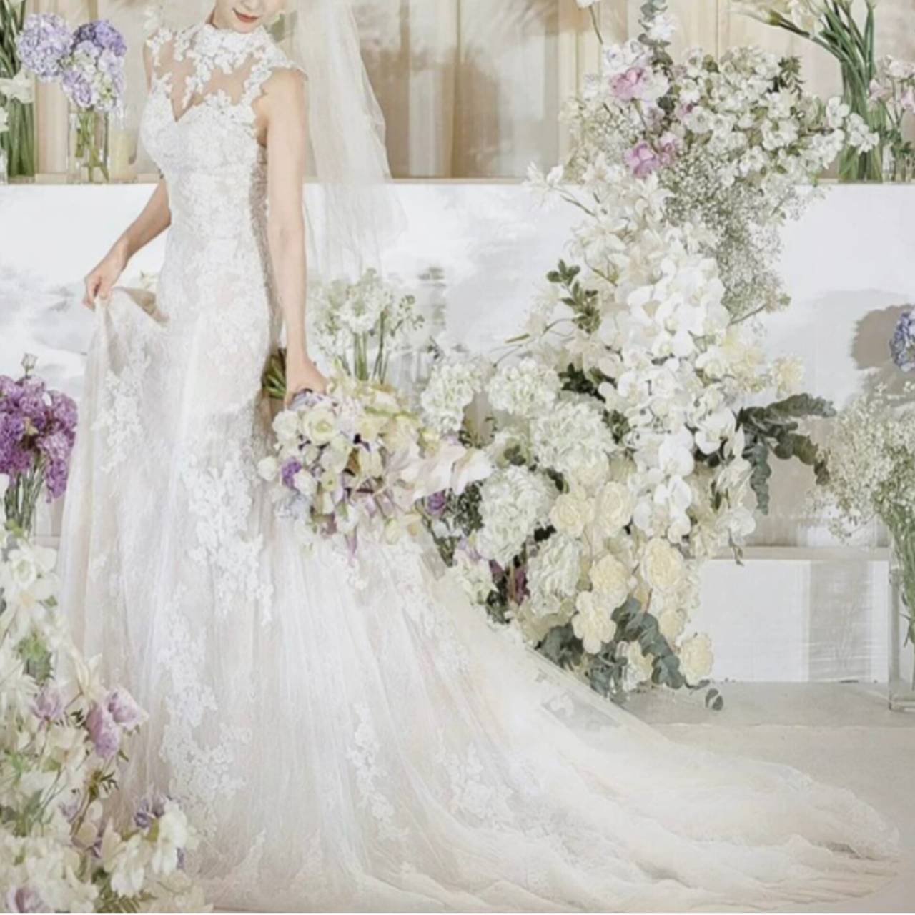 写真だけでは伝えきれない、“一生に一度”を格上げするウェディングドレス。繊細なフラワーモチーフを贅沢にあしらった上質総レース素材を使用。