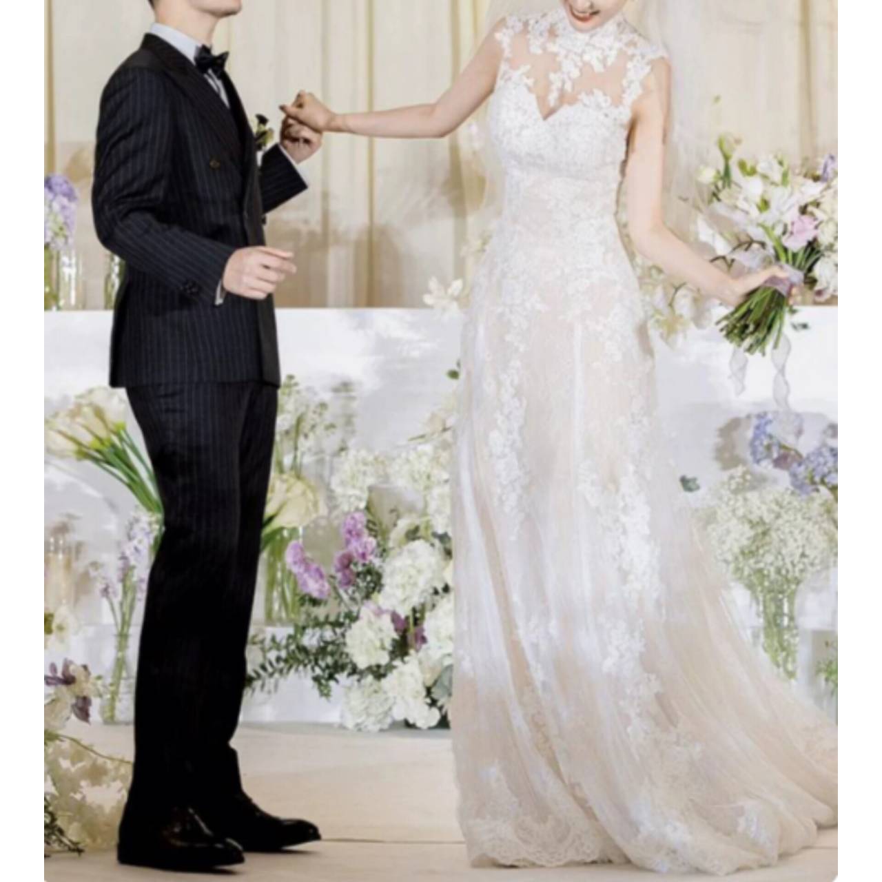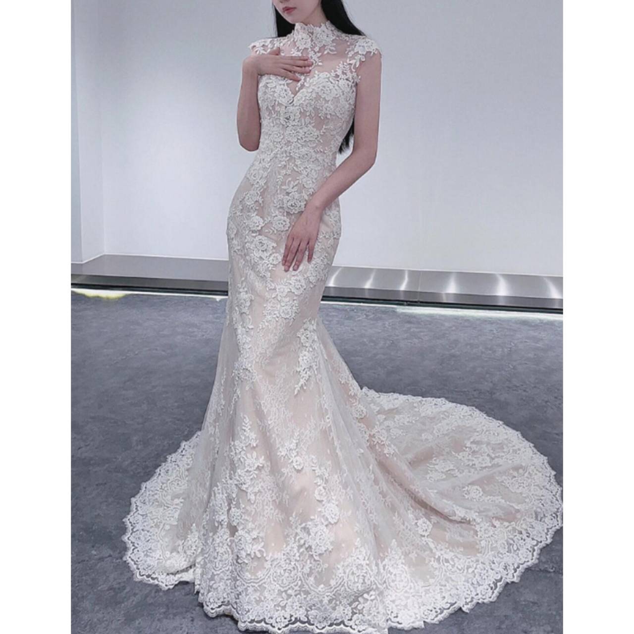 オールレース ウェディングドレス 韓国ドレス 総レース ハイネック ノースリーブ バックシアー シースルー シアー くるみボタン ハイウエスト マーメイド ロング ロングトレーン トレーン 美シルエット エレガント S/2XL 韓国【K6094】