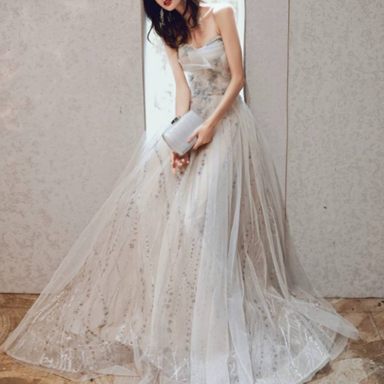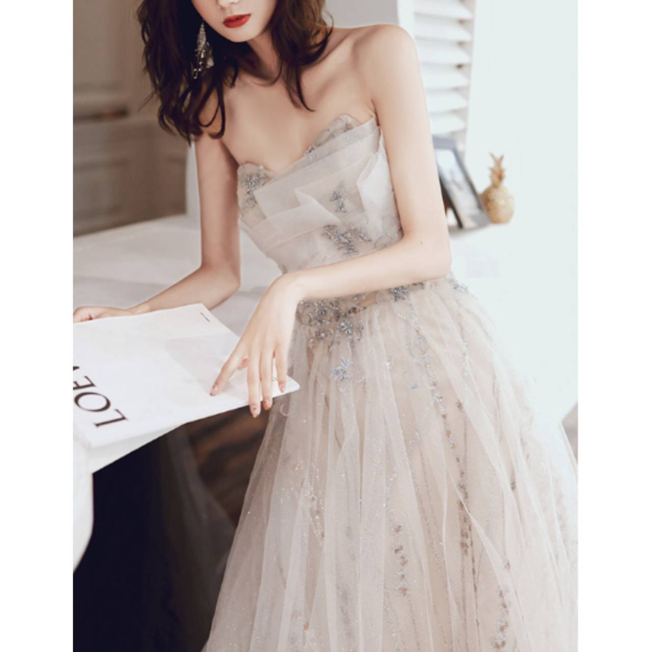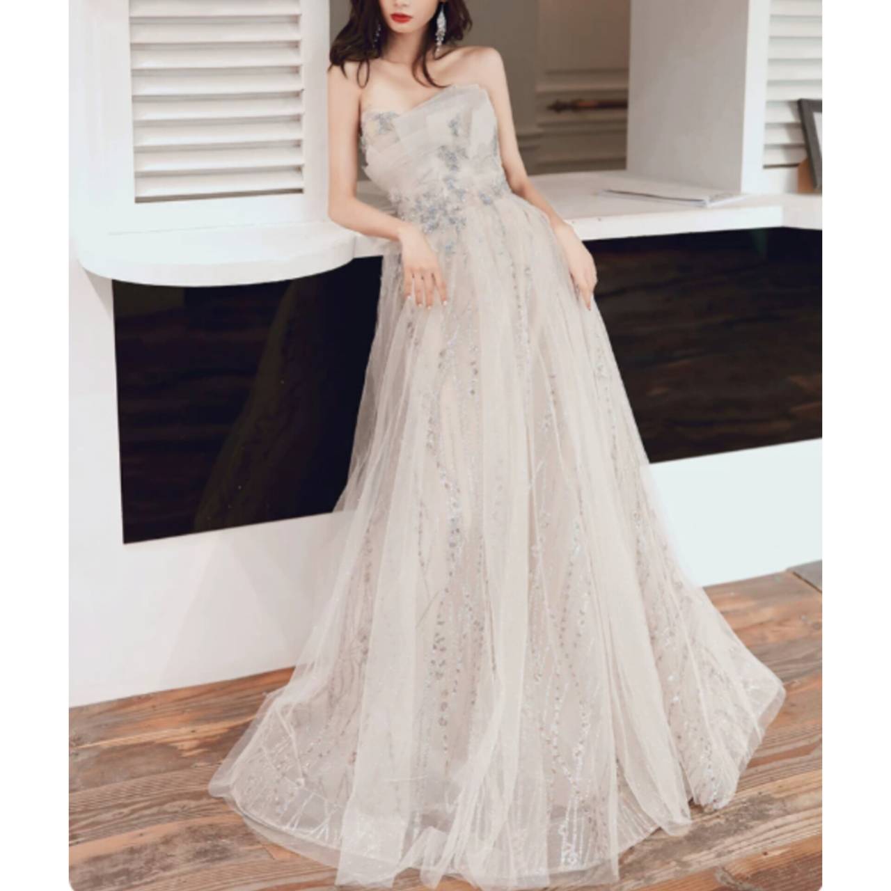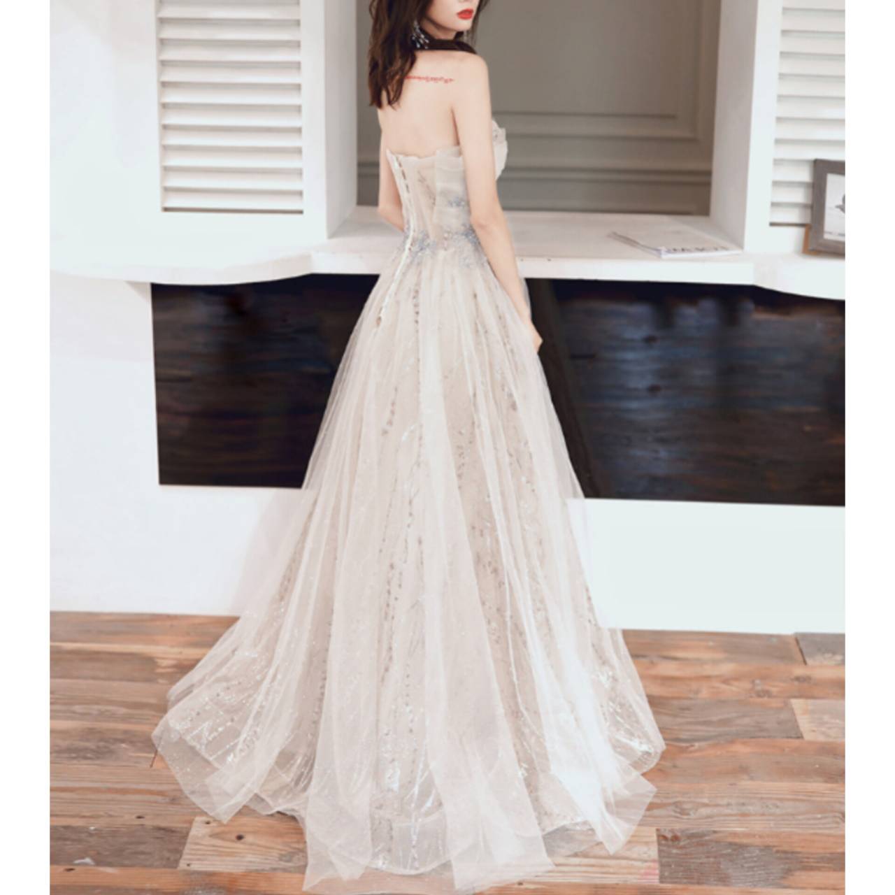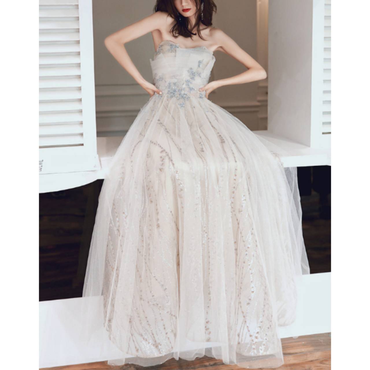 光を受けるたびに控えめに輝き、写真でも肉眼でも“高級感”が際立ちます。胸元はデコルテを美しく見せるビスチェデザイン。