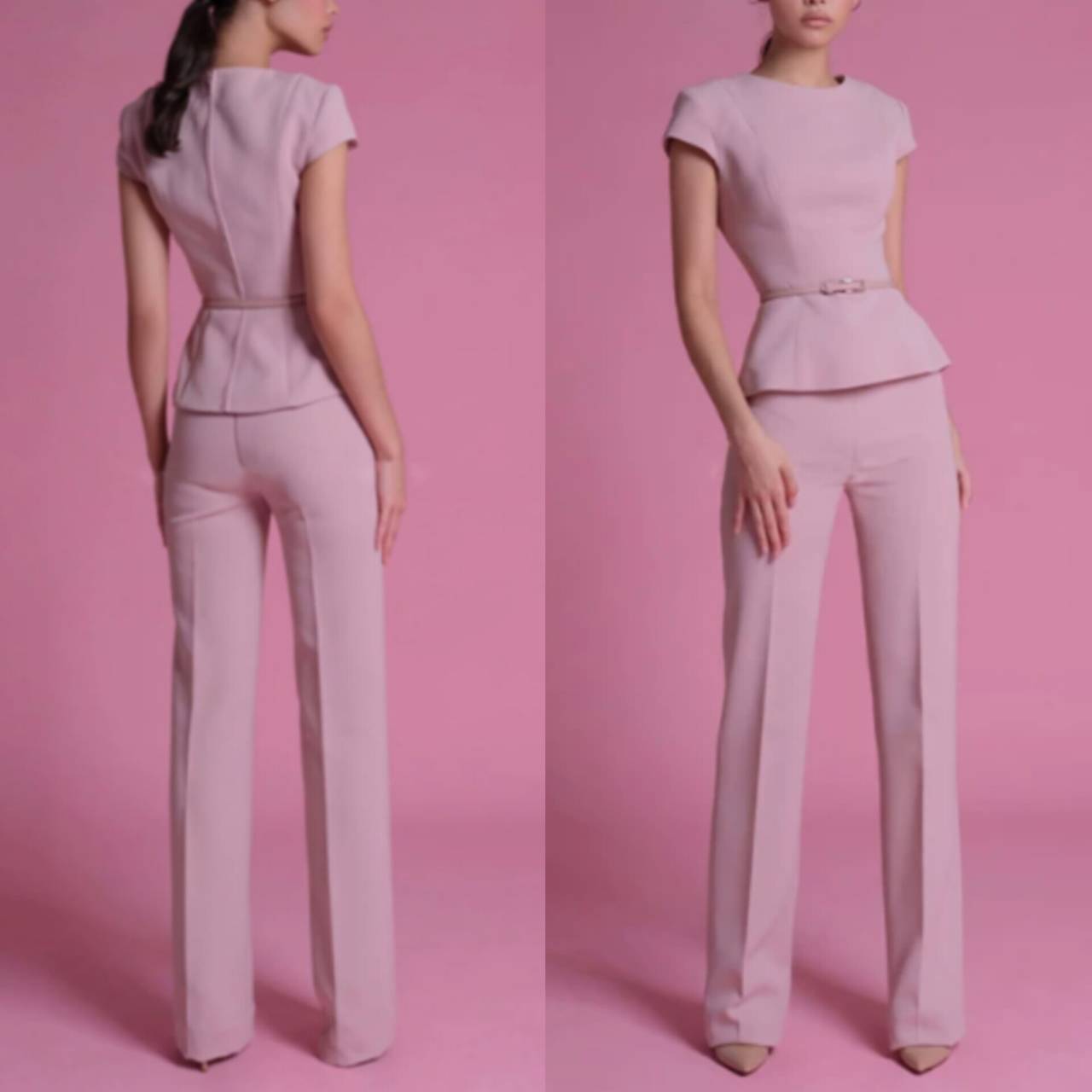セットアップ パンツドレス セットアップドレス トップス 半袖 フレンチスリーブ クルーネック ペプラム ウエストマーク ベルトマーク ハイウエスト スリムパンツ スリムフィット スリム センタープレス ロング 2ピース スタイルアップ 脚長効果 美脚効果 XS/L 韓国【B7202】
