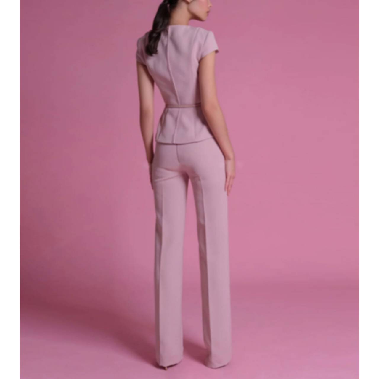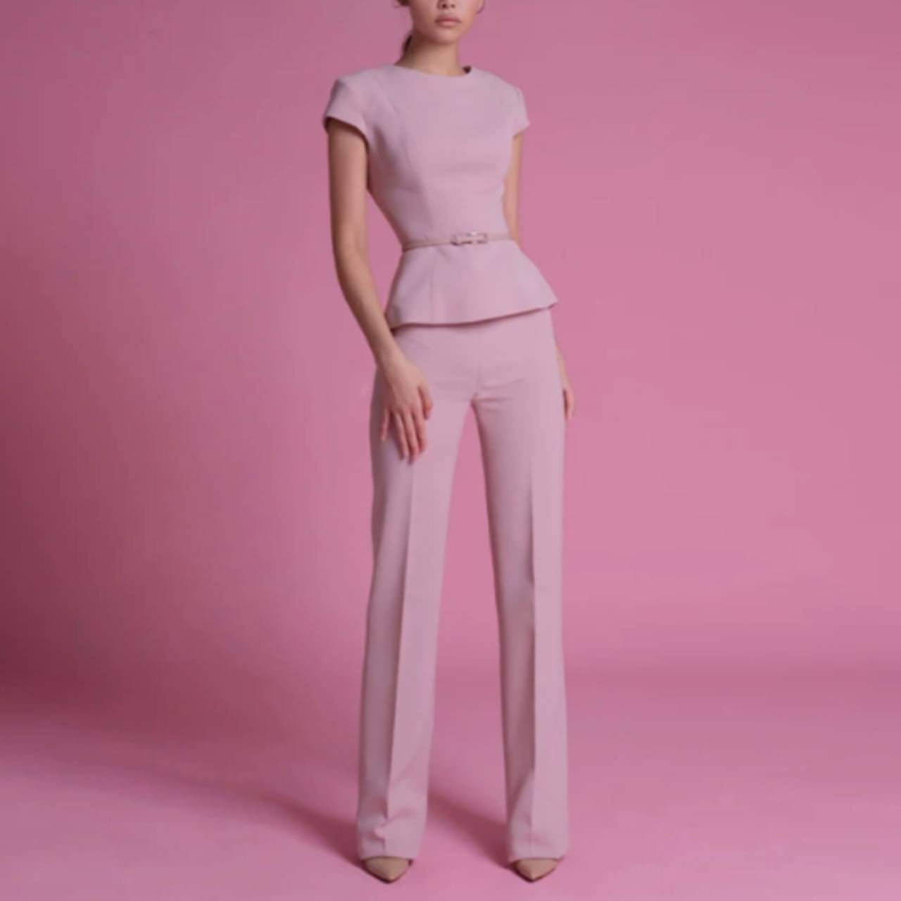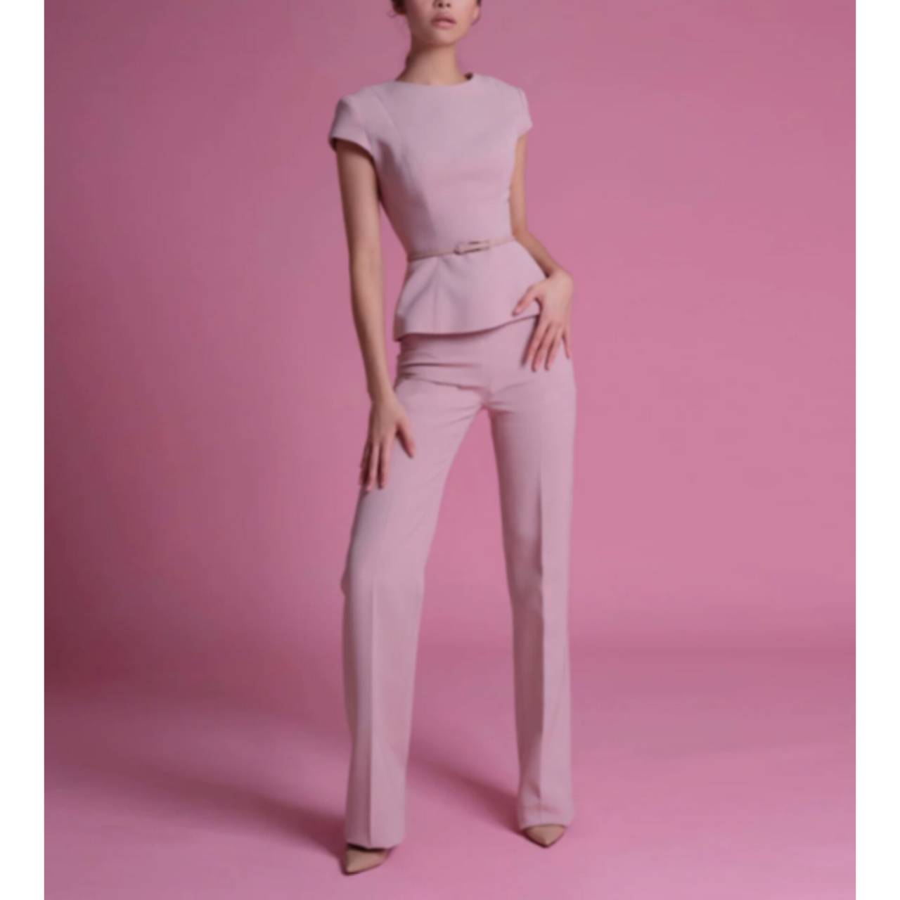 一瞬で“できる女”を演出する、計算された美シルエットセットアップ。」甘さを抑えた上品なピンクトーン。