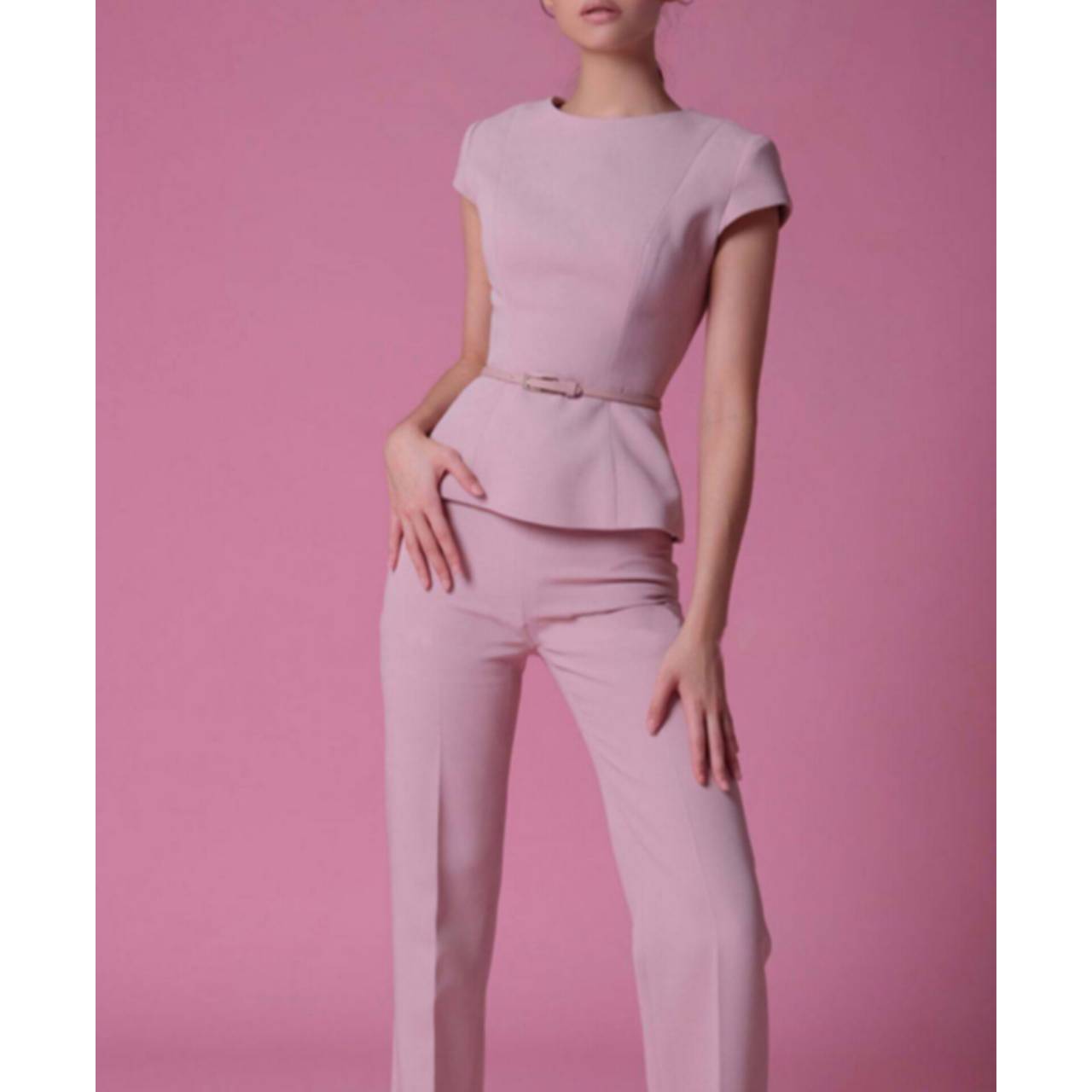 付属の細ベルトが視線をウエストに集め、誰でも簡単に“くびれ”を演出します。パンツはセンターライン入りのストレートシルエット。