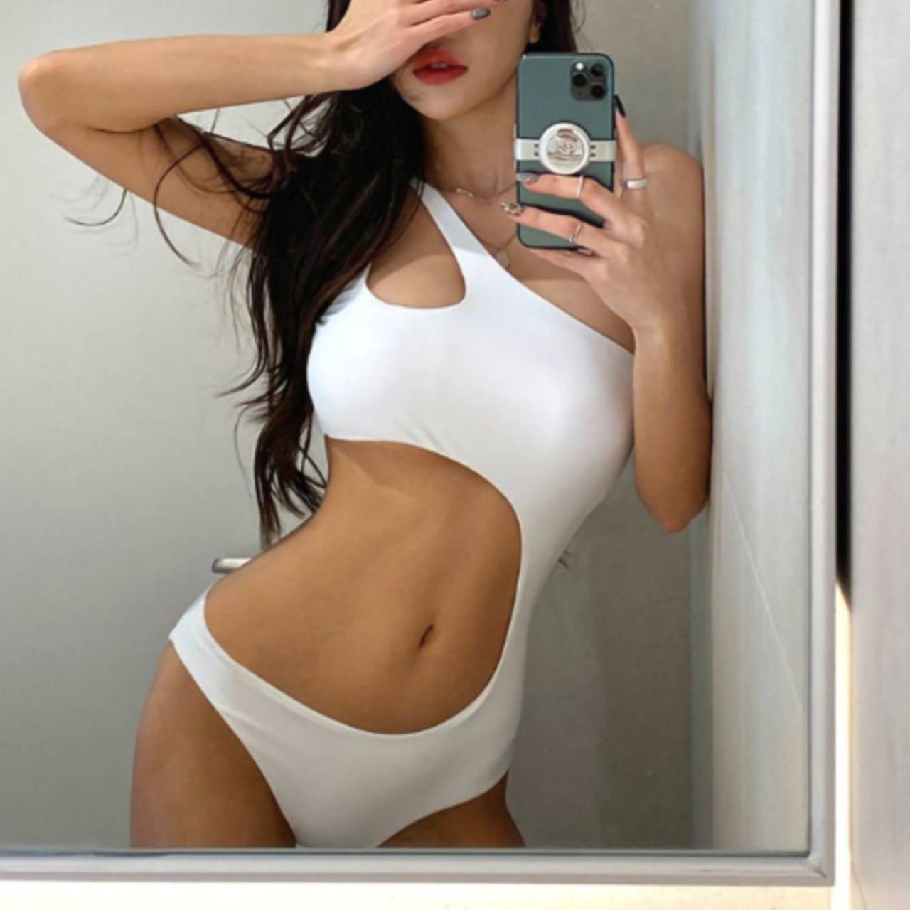 全2色 水着 ワンピース水着 韓国水着 ワンショルダー ワンショル サイドオープン 胸元オープン 大胆カットアウト ハイウエスト アシンメトリー 無地 スタイルアップ 脚長効果 盛れる水着 M/XL 韓国【K7398】