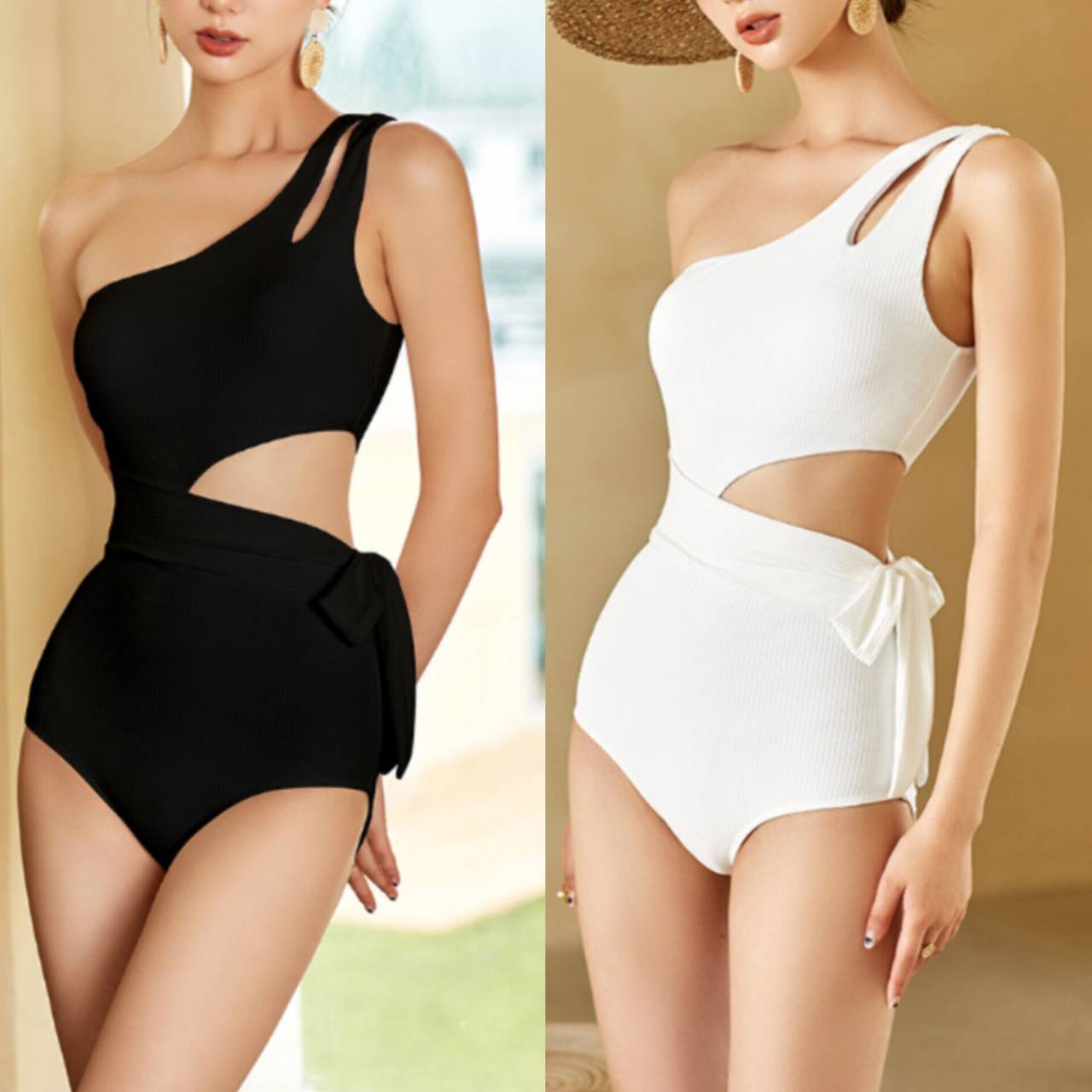 全2色 水着 ワンピース水着 韓国水着 ワンショルダー ワンショル サイドオープン リボン リボンマーク サイドリボン 大胆カットアウト ハイウエスト リブ リブ素材 無地 アシンメトリー スタイルアップ 脚長効果 盛れる水着 S/XL 韓国【B5709】