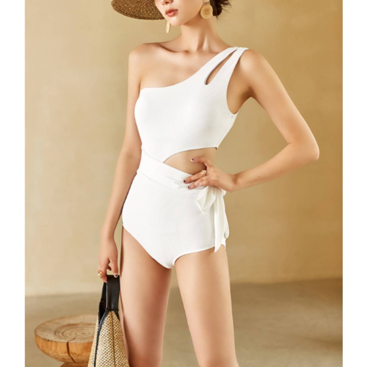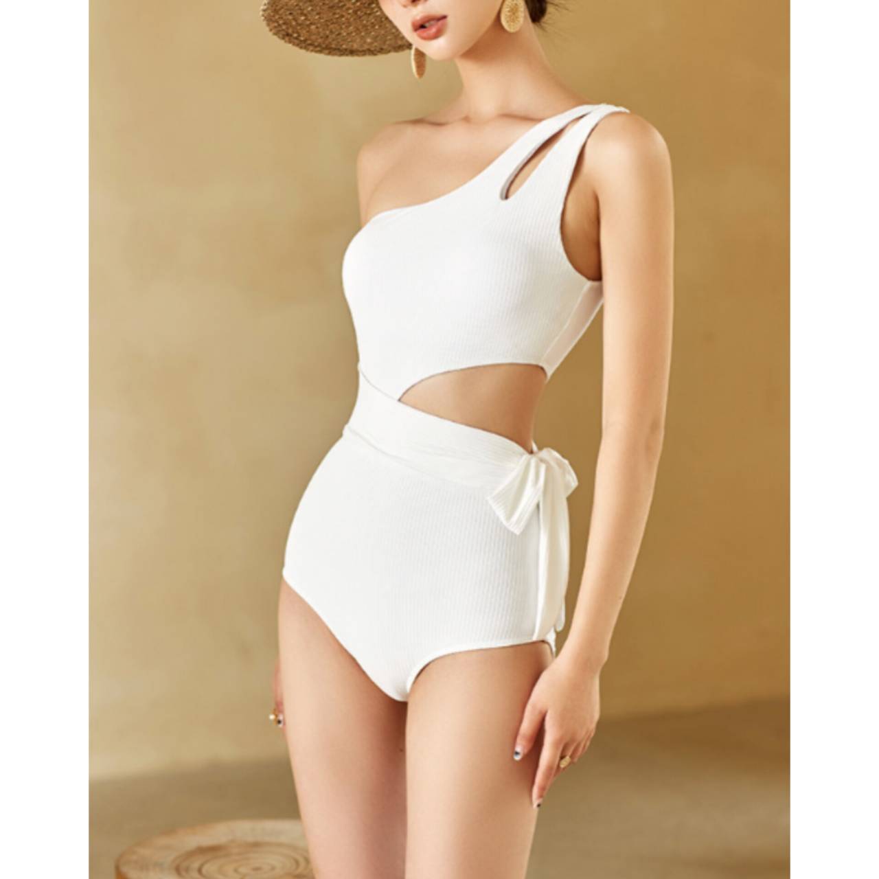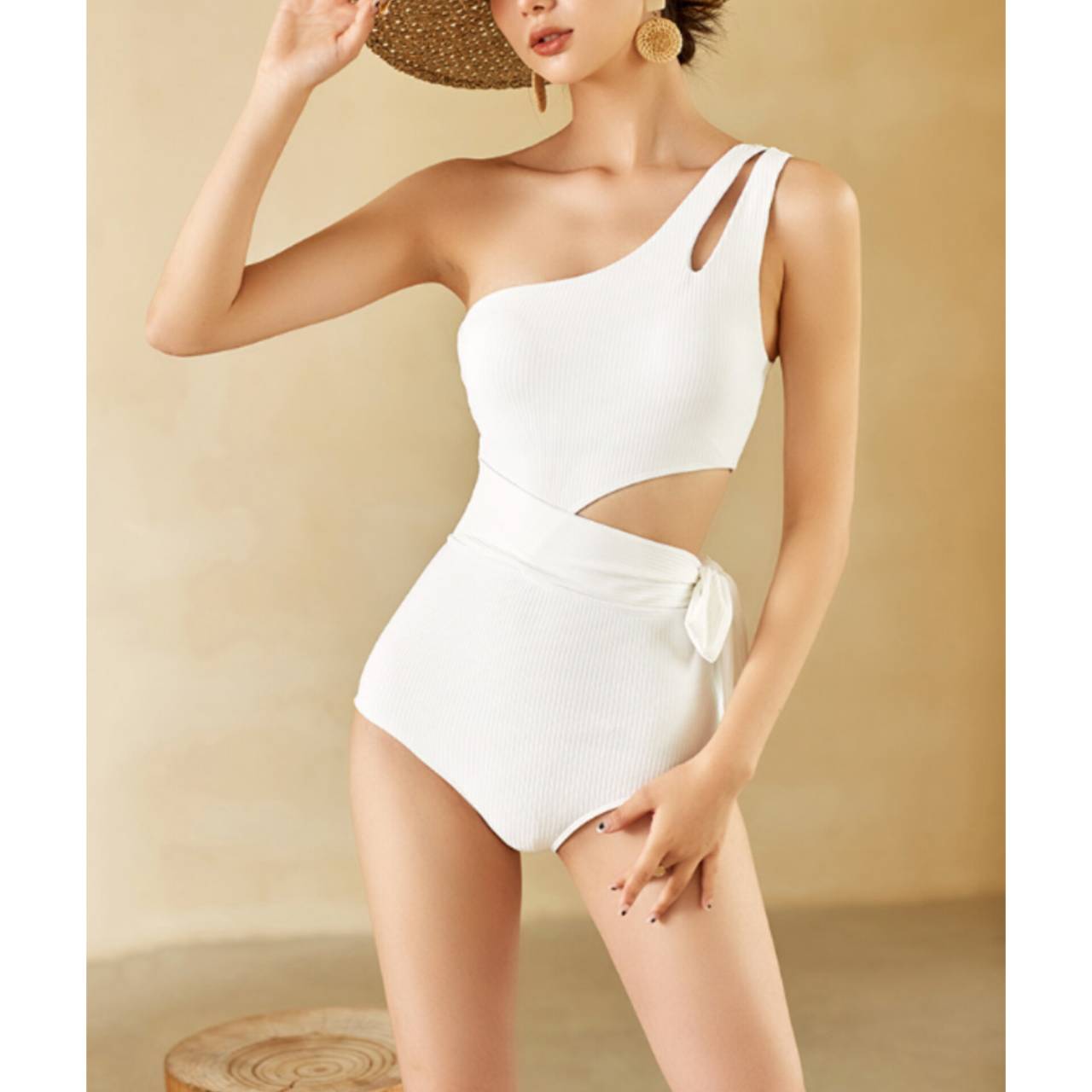 大人の余裕を纏う、計算されたワンショルダー。ただの水着ではなく、