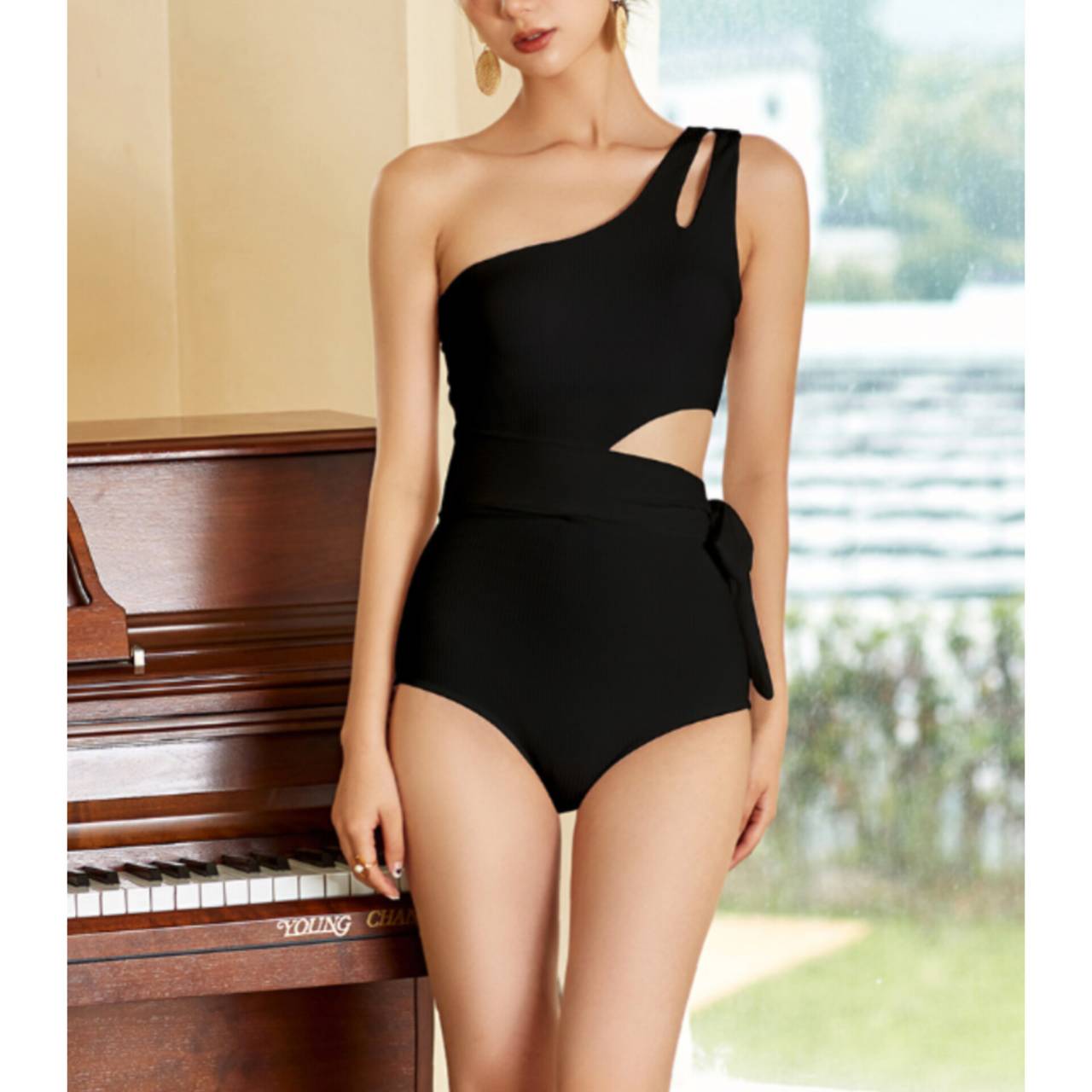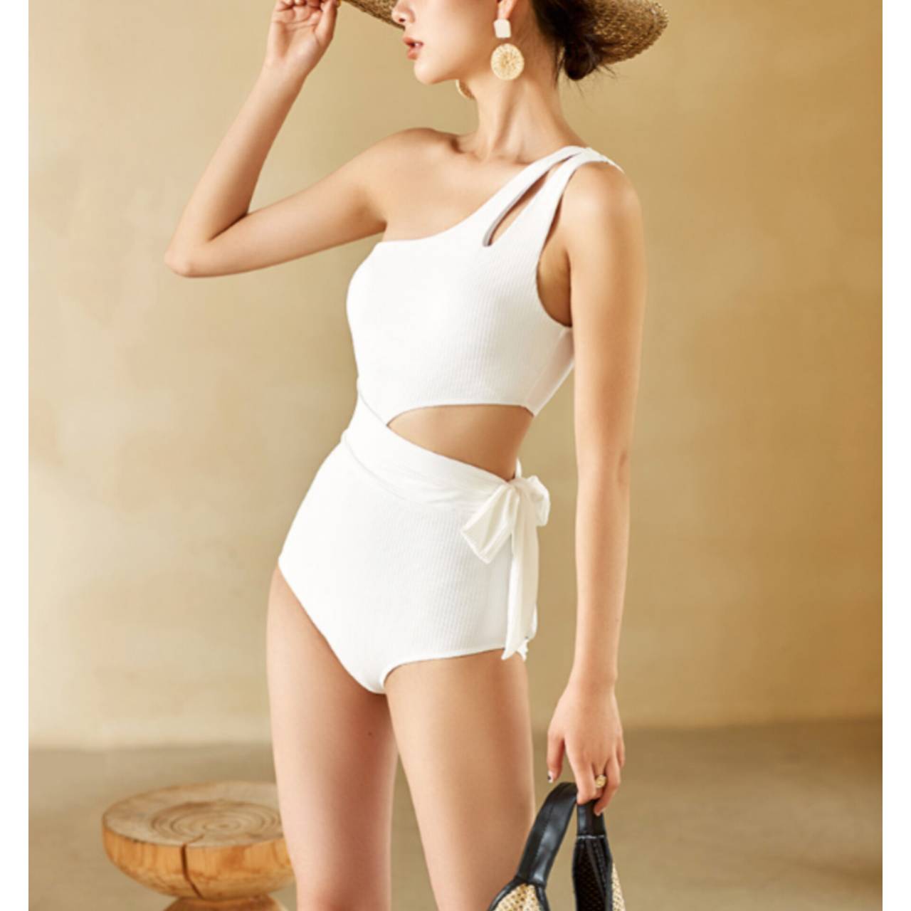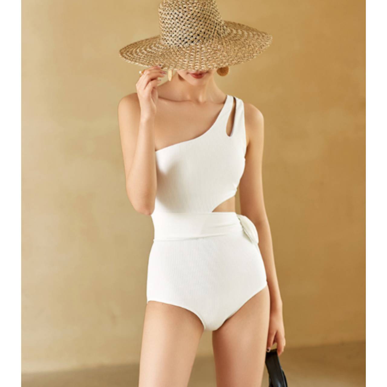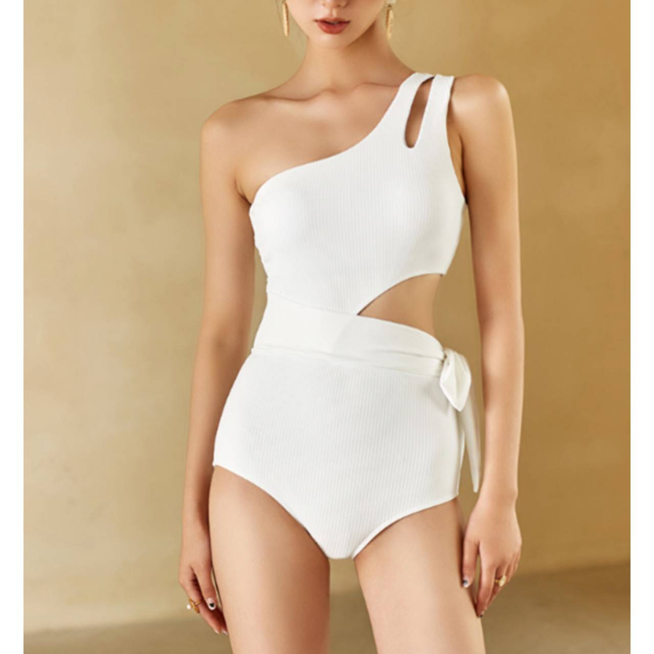 大人の余裕を纏う、計算されたワンショルダー。ただの水着ではなく、