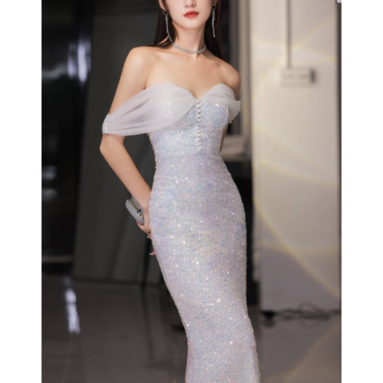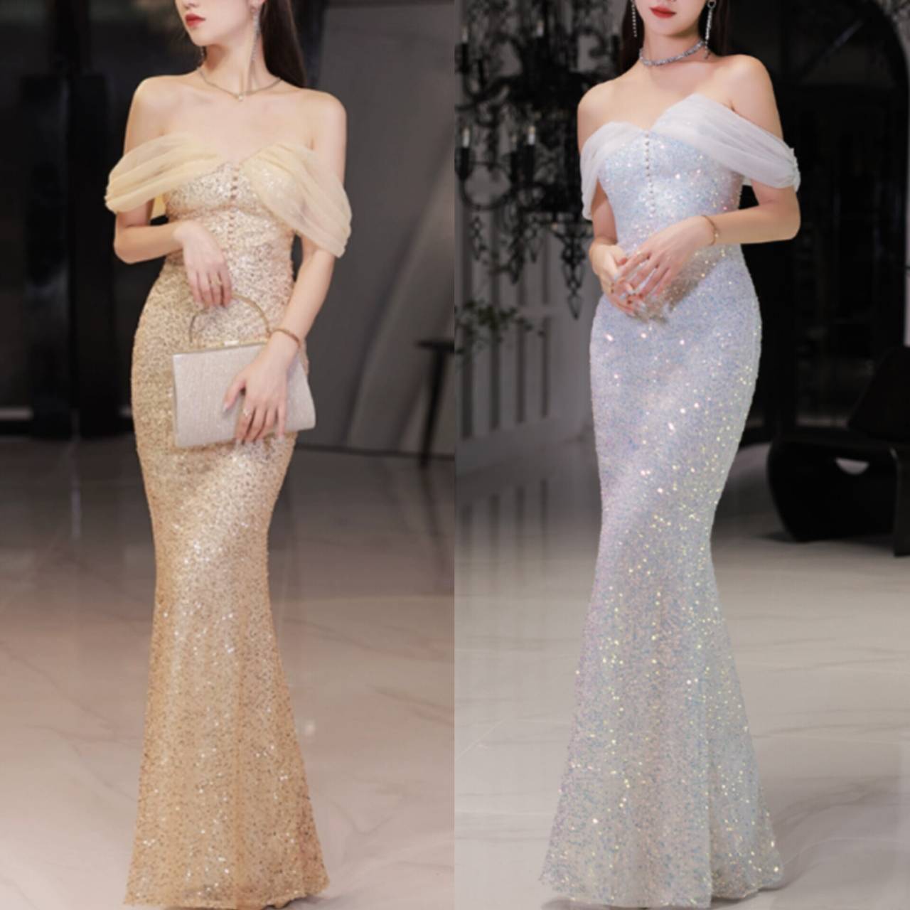 全2色 ドレス イブニングドレス 韓国ドレス キラキラ スパンコール オフショルダー オフショル シアースリーブ オーガンジー くるみボタン ハイウエスト マーメイド ロング グリッター 美シルエット S/2XL 韓国【K3281】