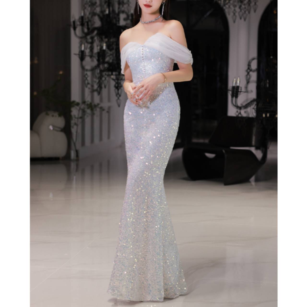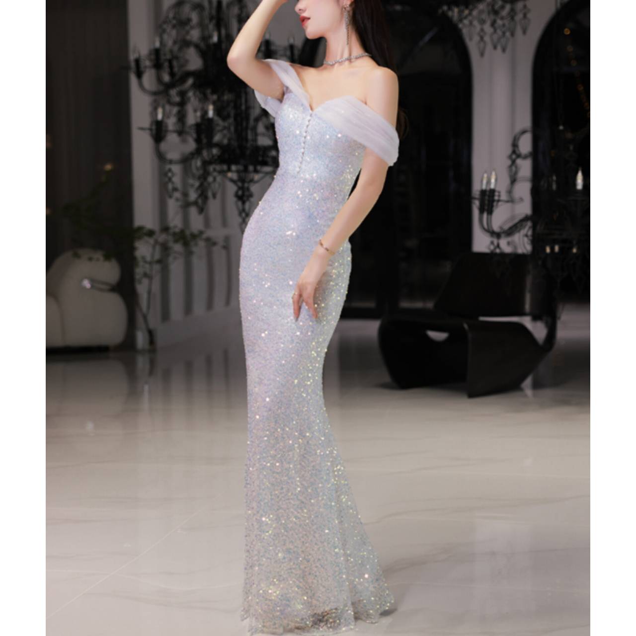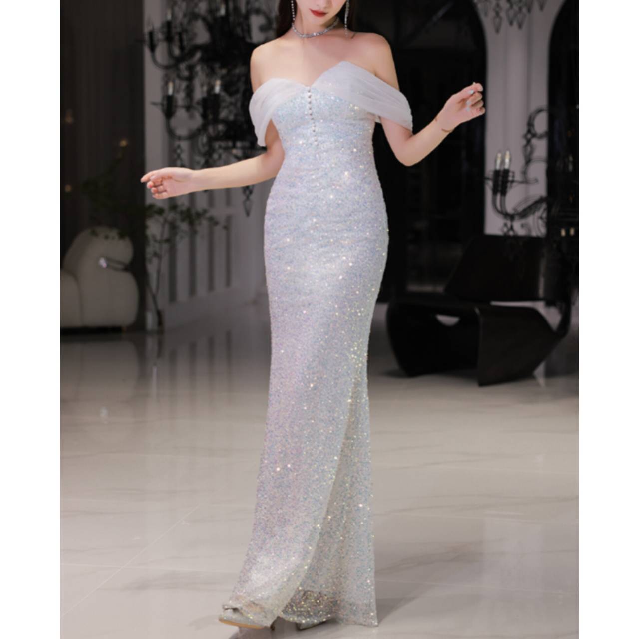 ひと目で心を奪う、光のマーメイドドレス。ラグジュアリーな輝きで、まるでシャンデリアの光を纏うような華やかさ。