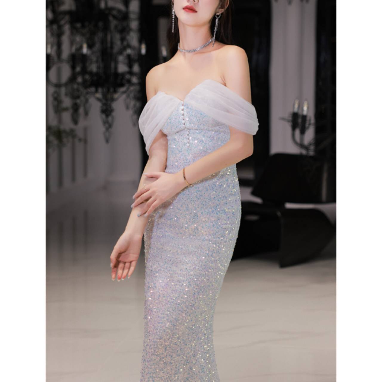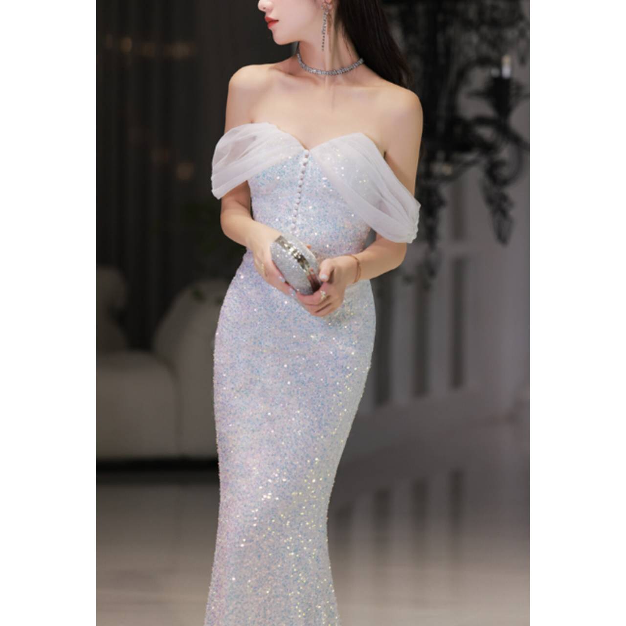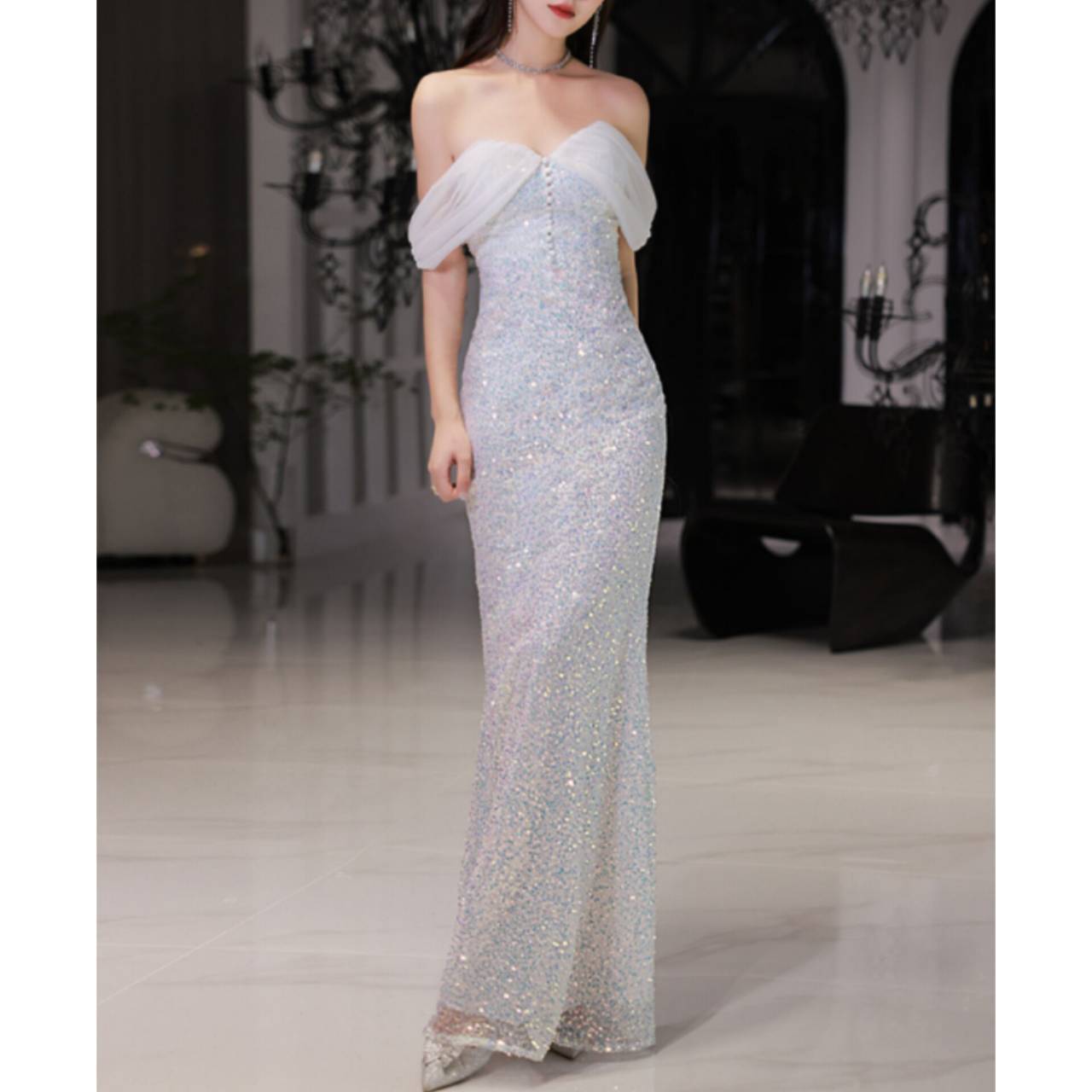 ひと目で心を奪う、光のマーメイドドレス。ラグジュアリーな輝きで、まるでシャンデリアの光を纏うような華やかさ。