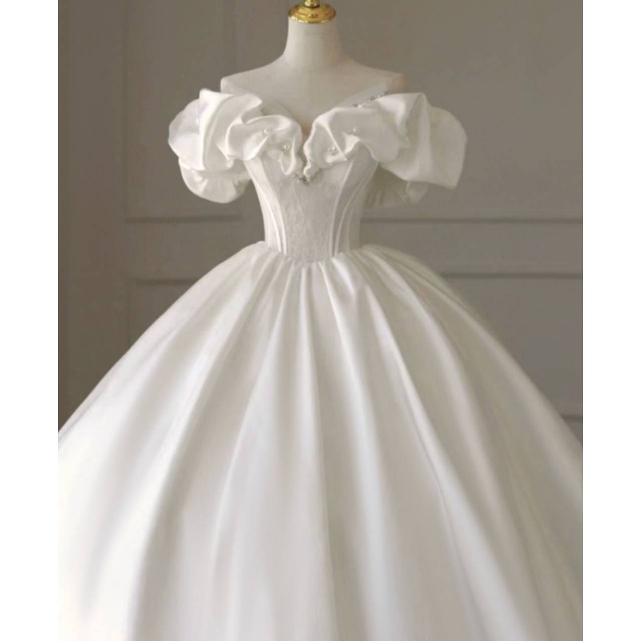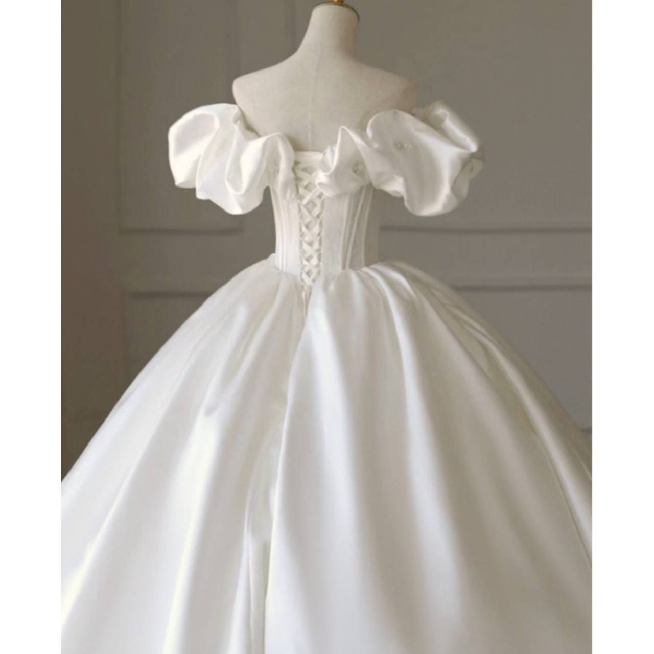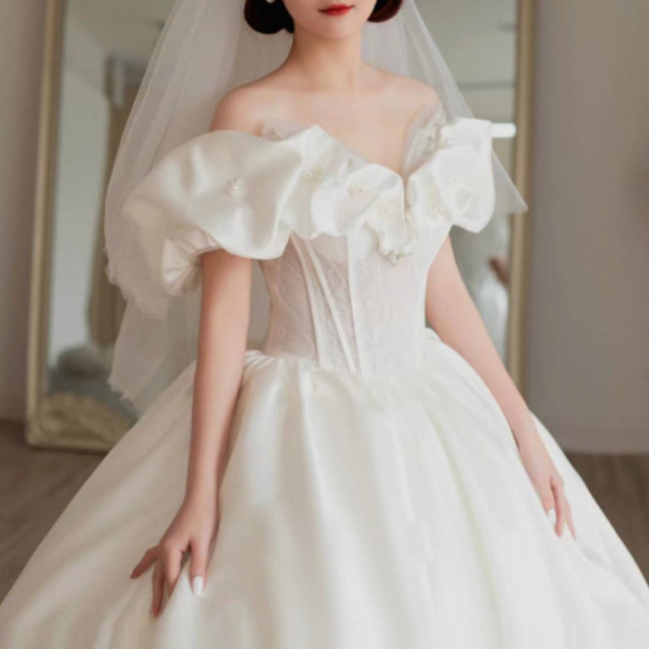 オフショルダー ウェディングドレス 韓国ドレス サテン オフショル フリルスリーブ 立体フリル 立体袖 ボリューム袖 レース パール ビジュー ラメ キラキラ バックレースアップ ハイウエスト プリンセスライン ロング 異素材ミックス エレガント S/2XL 韓国【K7658】