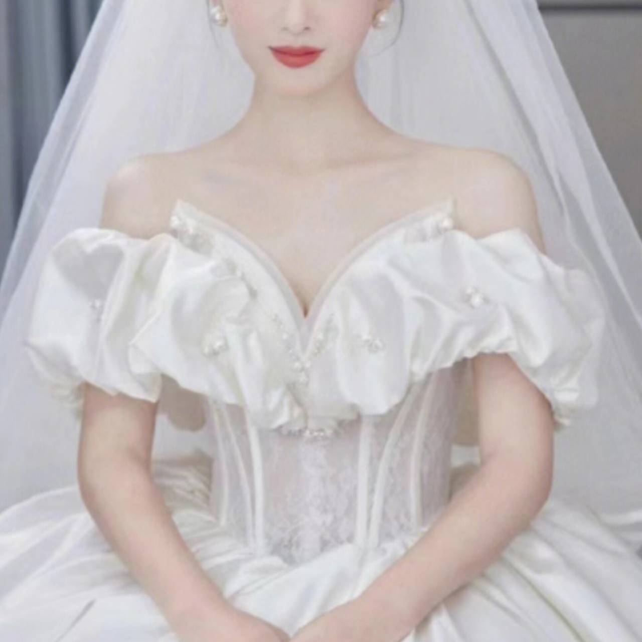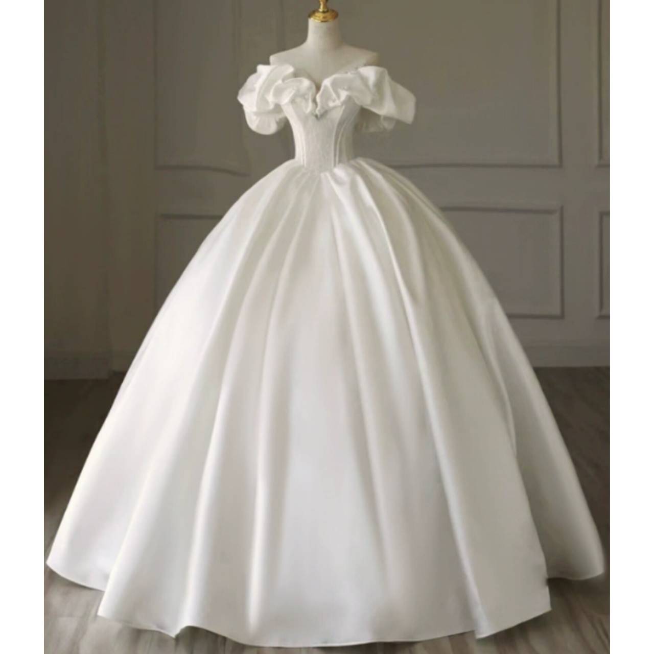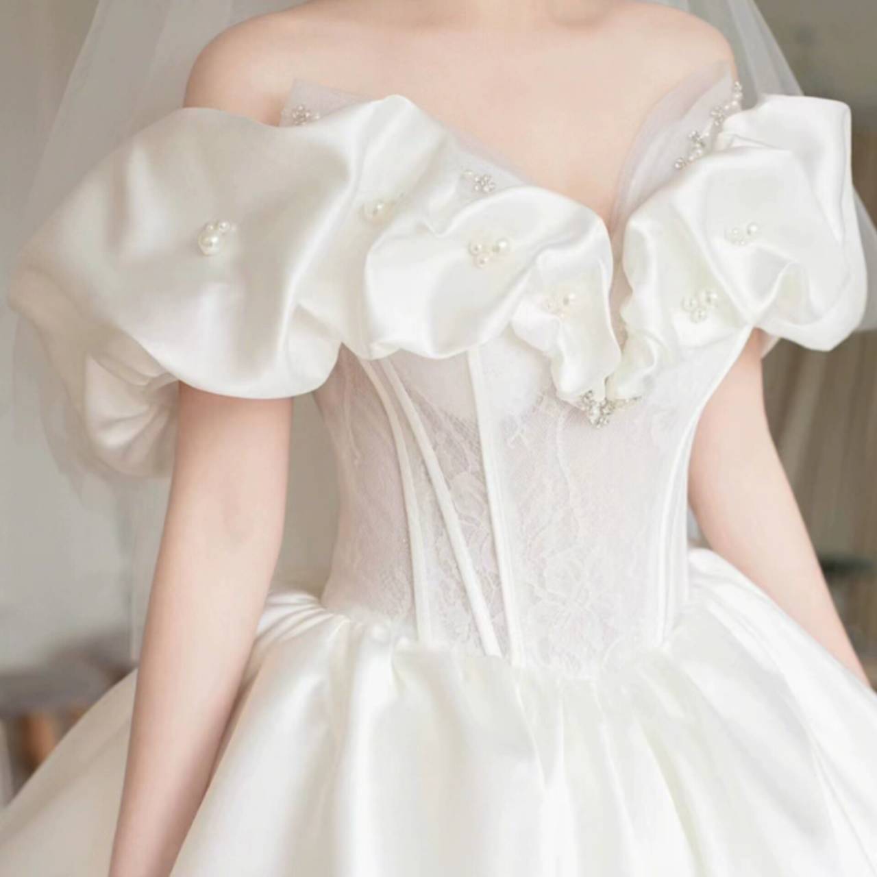 オフショルダー ウェディングドレス 韓国ドレス サテン オフショル フリルスリーブ 立体フリル 立体袖 ボリューム袖 レース パール ビジュー ラメ キラキラ バックレースアップ ハイウエスト プリンセスライン ロング 異素材ミックス エレガント S/2XL 韓国【K7658】