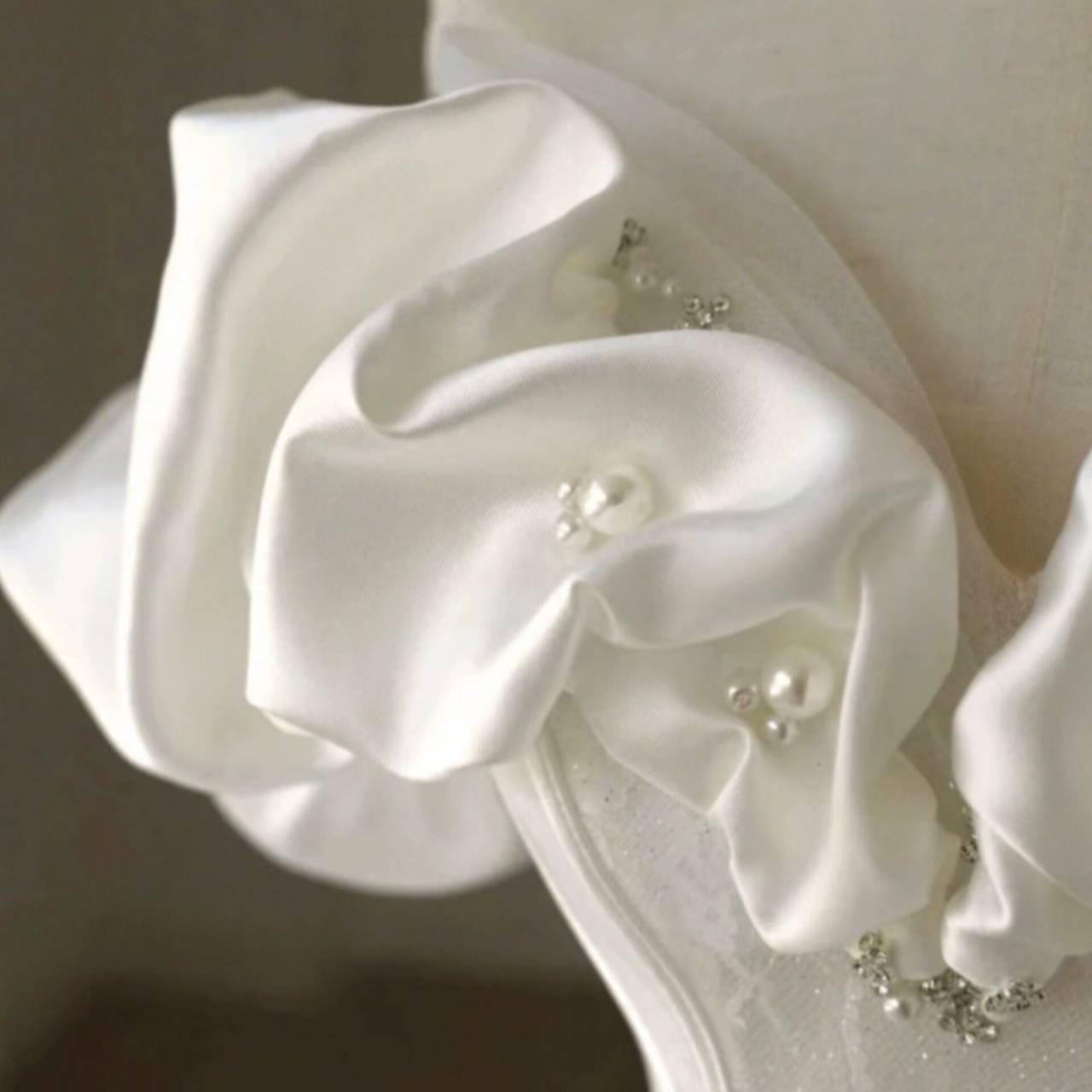 “可憐”と“気品”を極めた、物語のヒロインドレス。上質なハリ感のあるサテン×繊細チュールレースを贅沢に使用した、クラシカルなオフショルダーウェディングドレス。