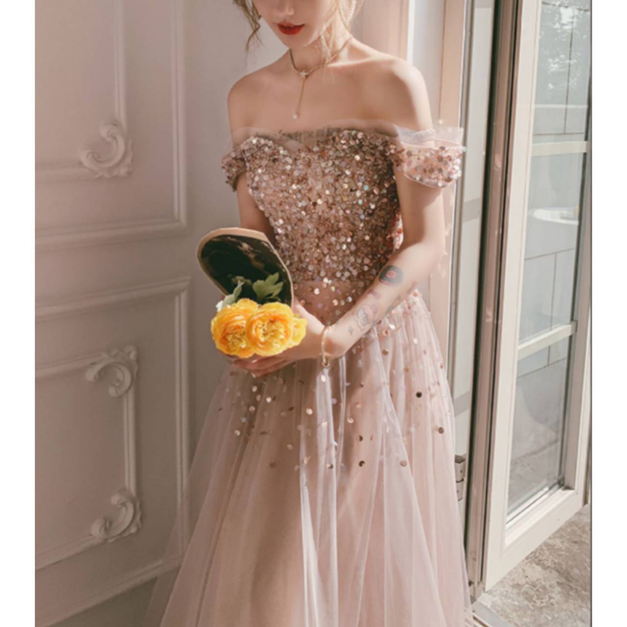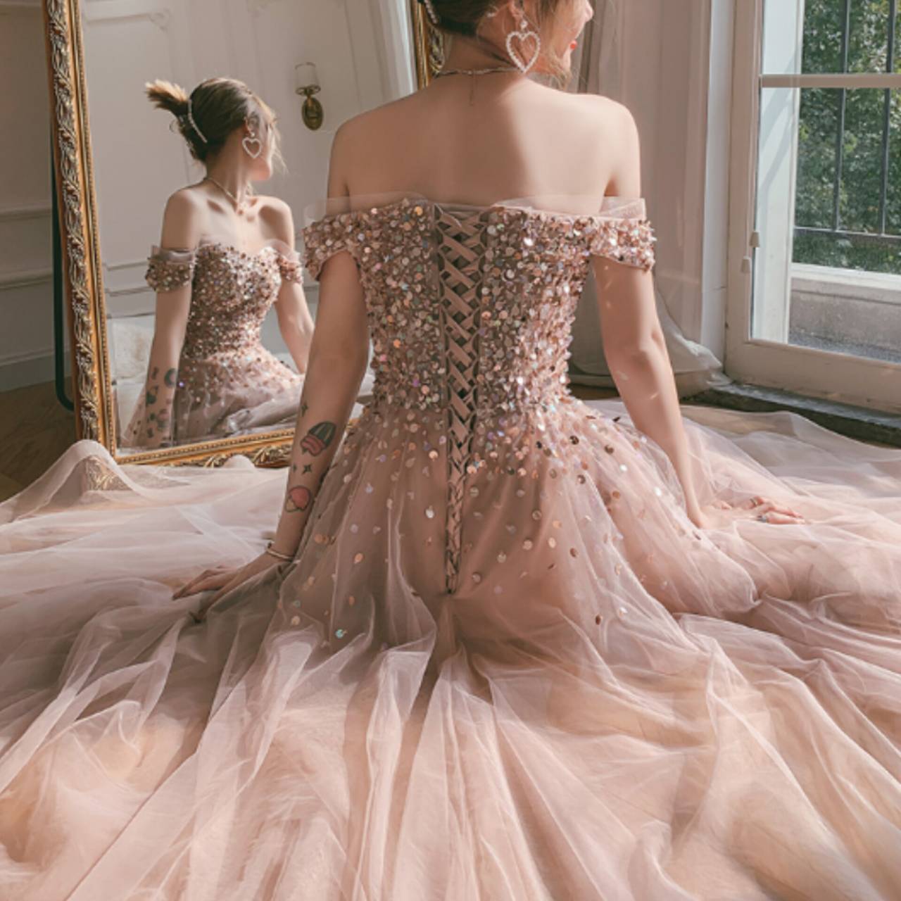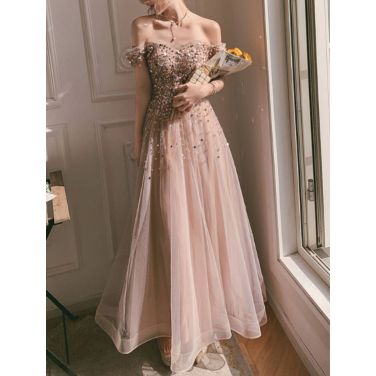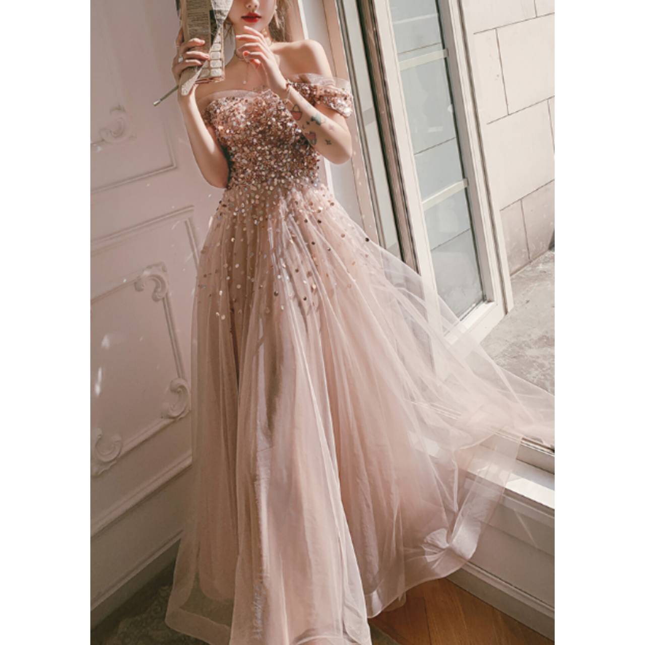 ひと目で心を奪う、ロマンティックな輝きドレス。上質なスパンコール刺繍と柔らかなチュール素材を贅沢に重ねた、オフショルダーのロングドレス。