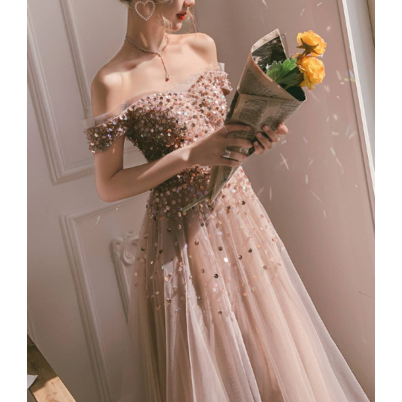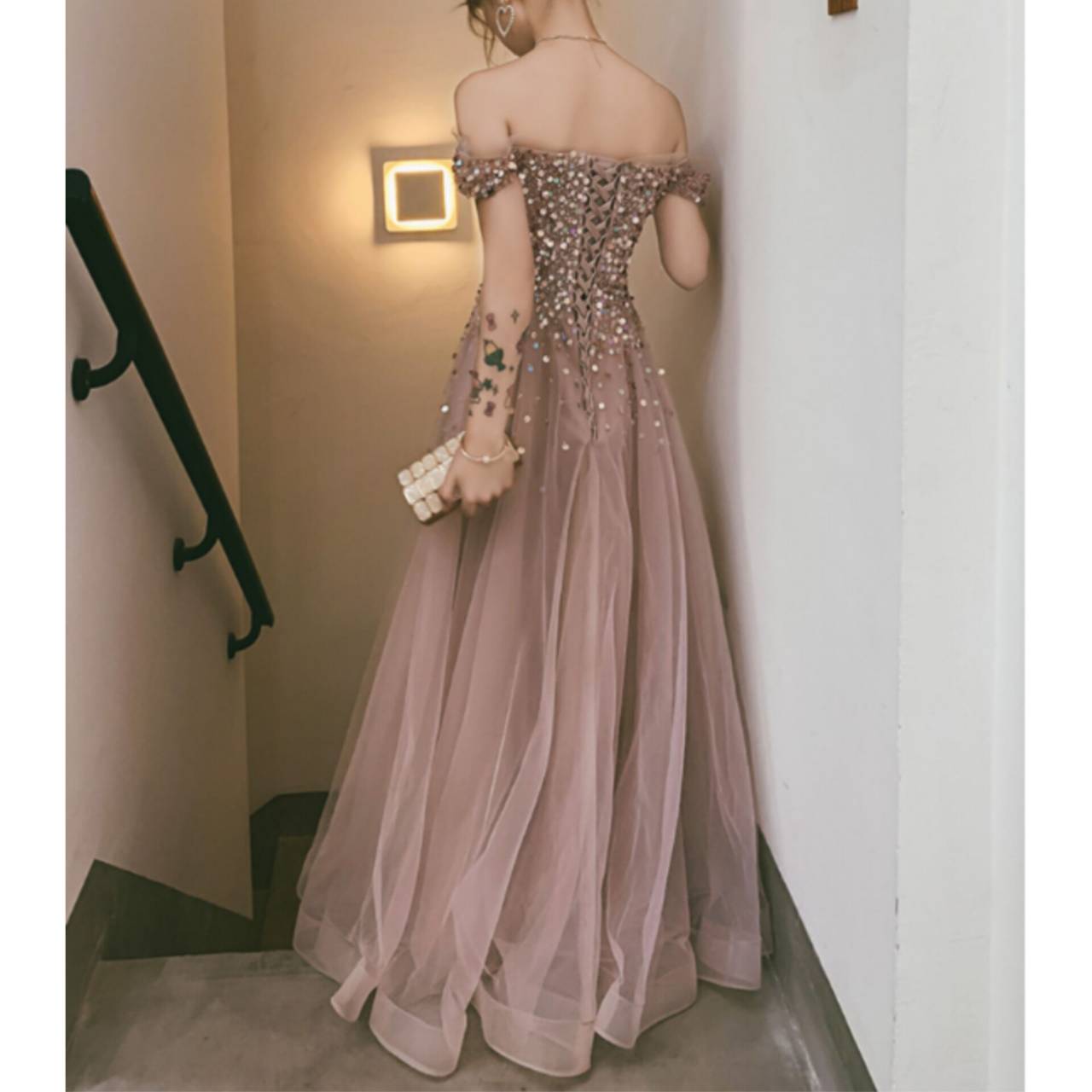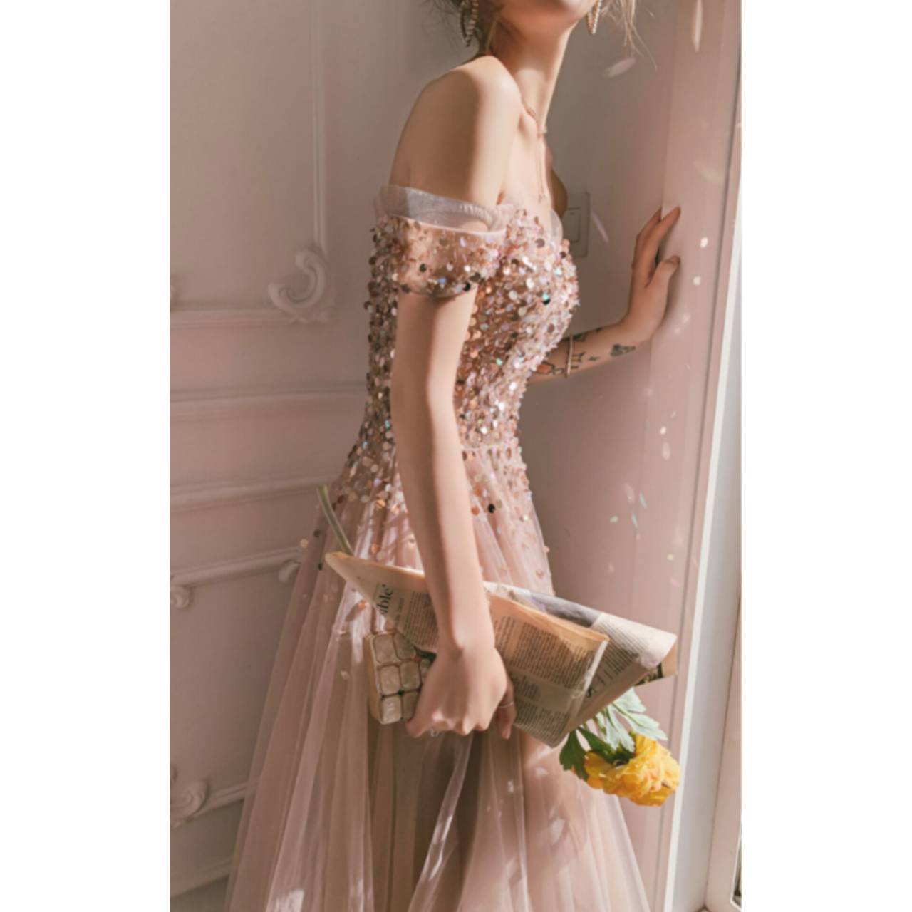 ひと目で心を奪う、ロマンティックな輝きドレス。上質なスパンコール刺繍と柔らかなチュール素材を贅沢に重ねた、オフショルダーのロングドレス。