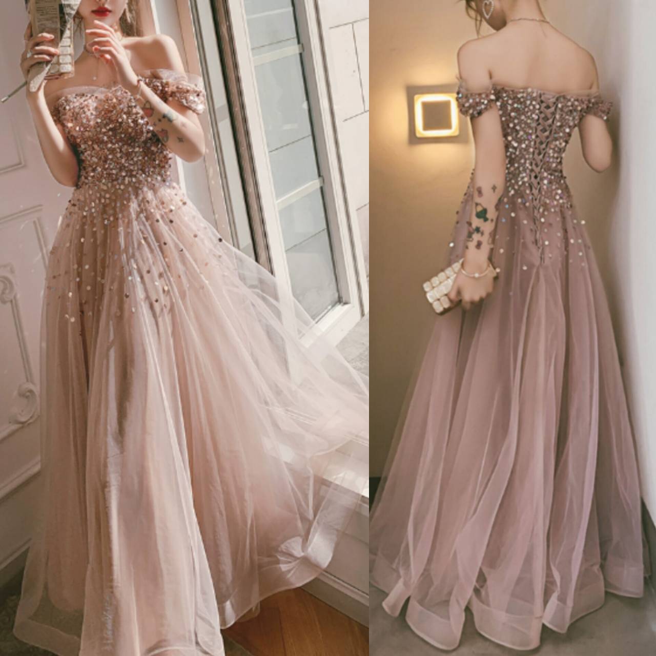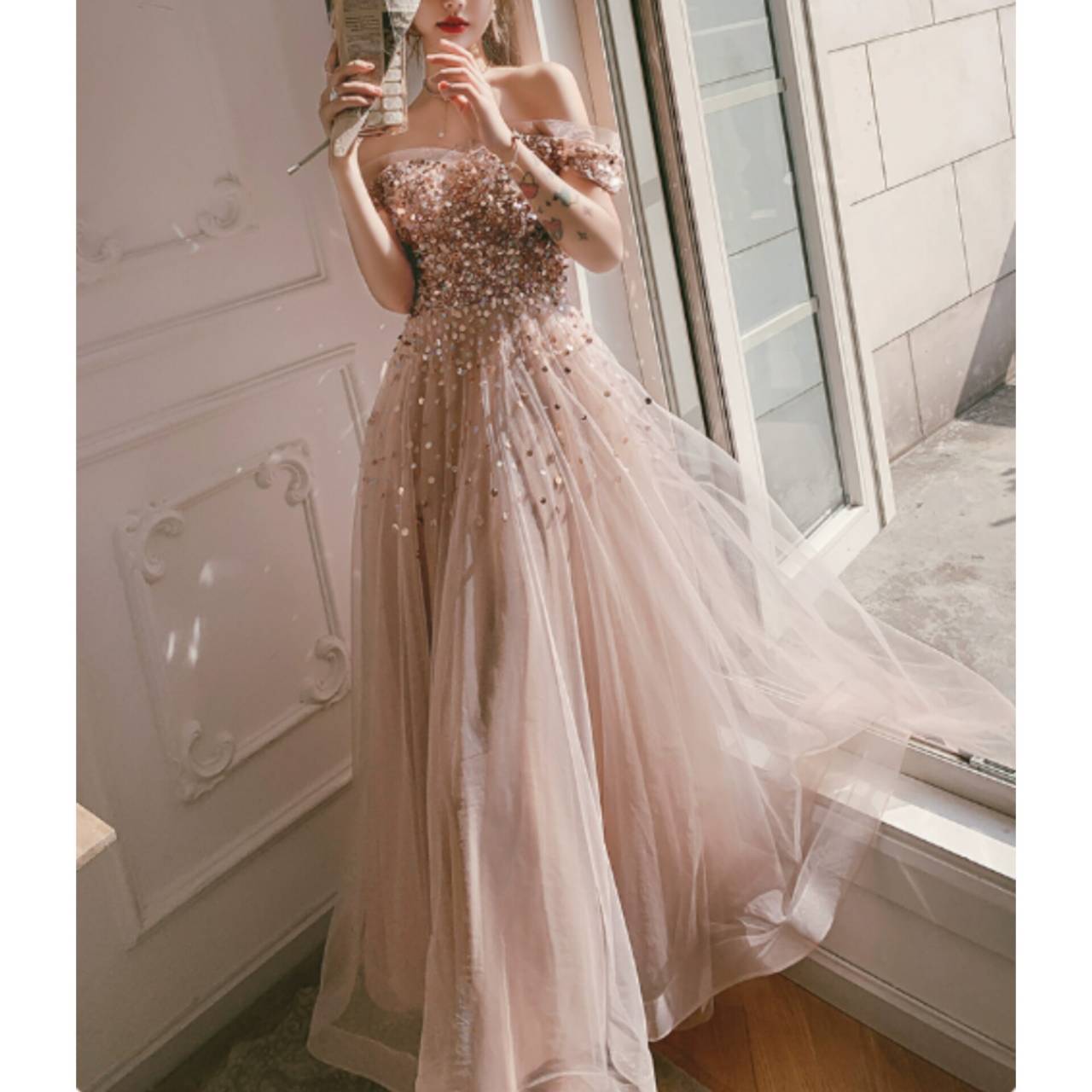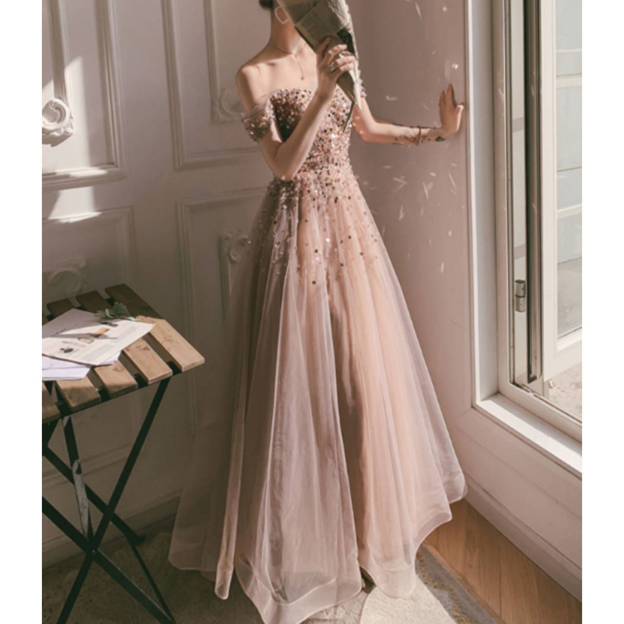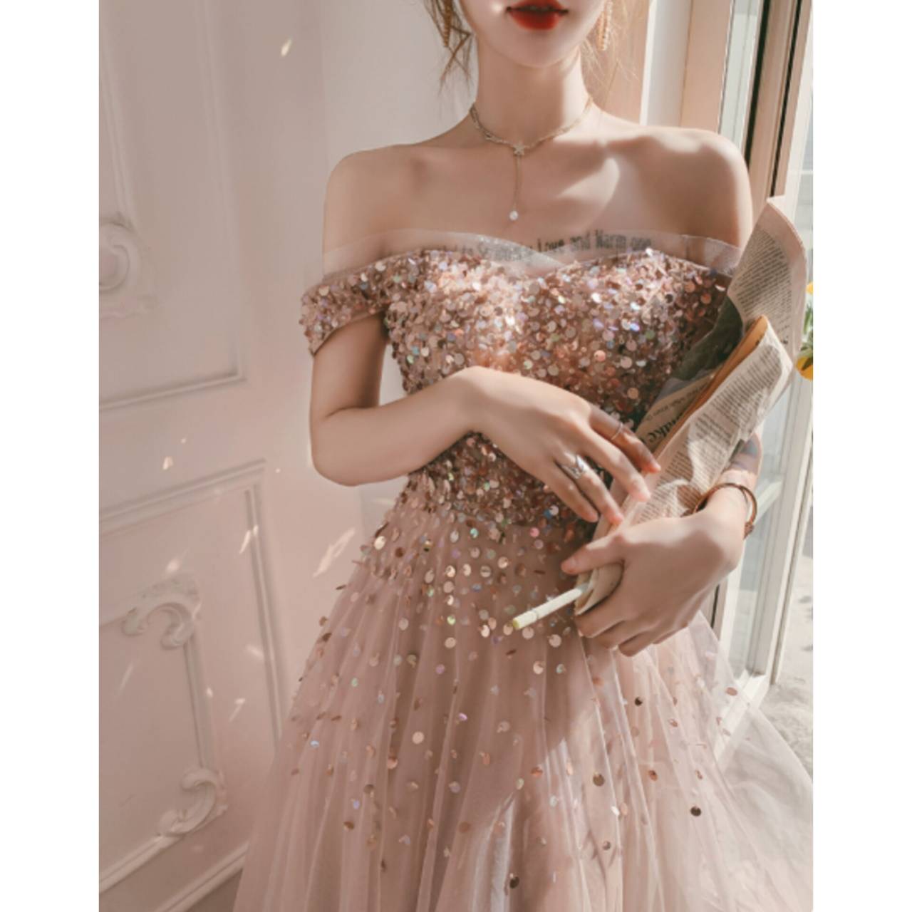 ひと目で心を奪う、ロマンティックな輝きドレス。上質なスパンコール刺繍と柔らかなチュール素材を贅沢に重ねた、オフショルダーのロングドレス。