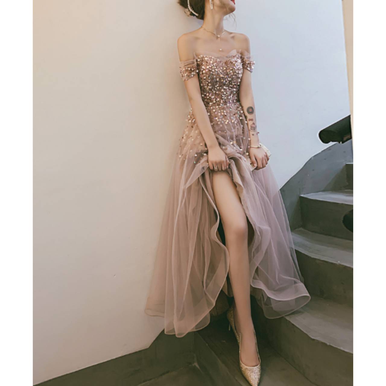 オフショルダー ドレス イブニングドレス バースデードレス 韓国ドレス キラキラ オフショル スパンコール バックレースアップ ハイウエスト Aライン フレア チュール オーバースカート レイヤード シアー グリッター プリンセス エレガント XS/2XL 韓国【K1420】