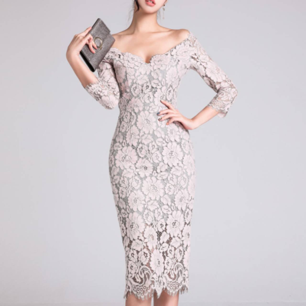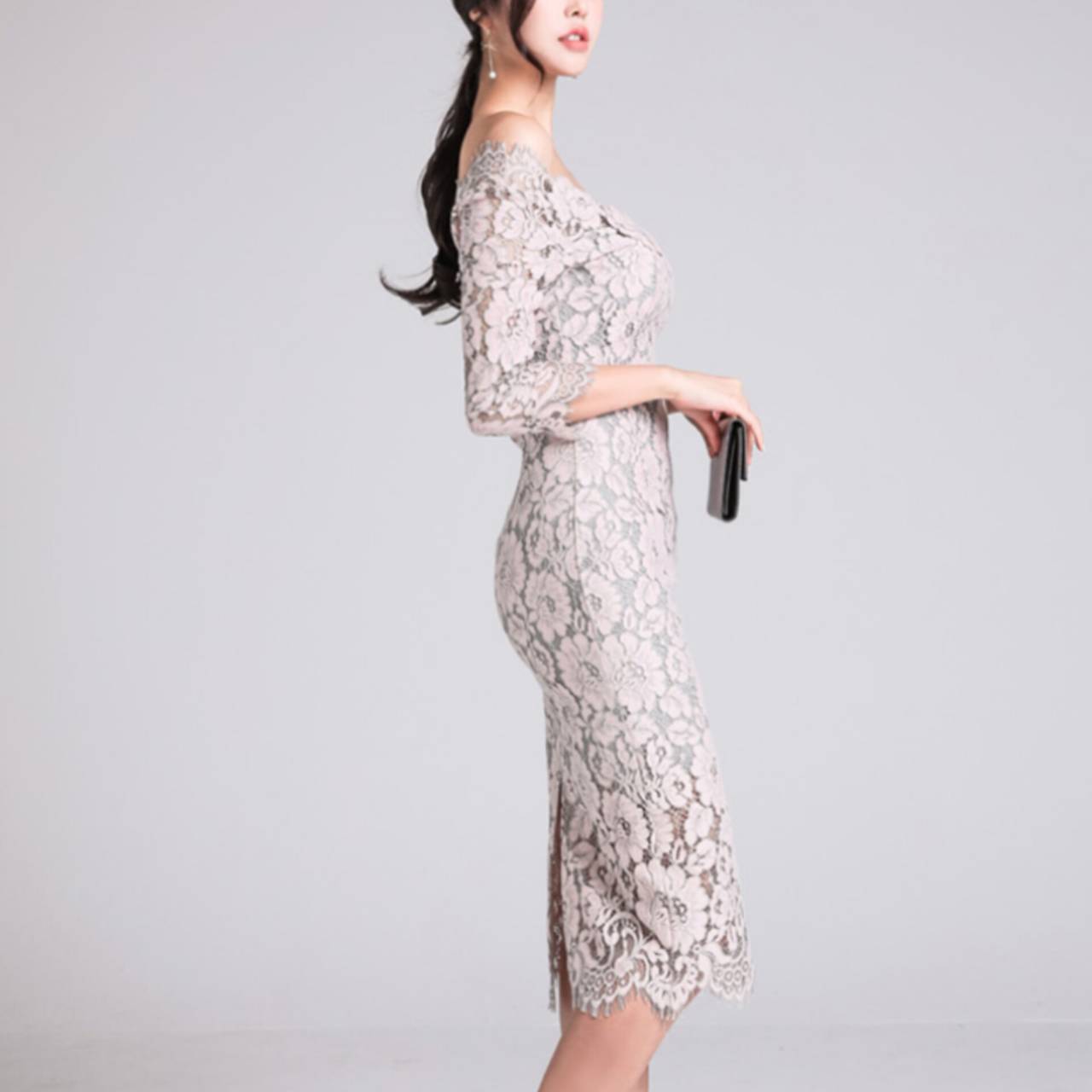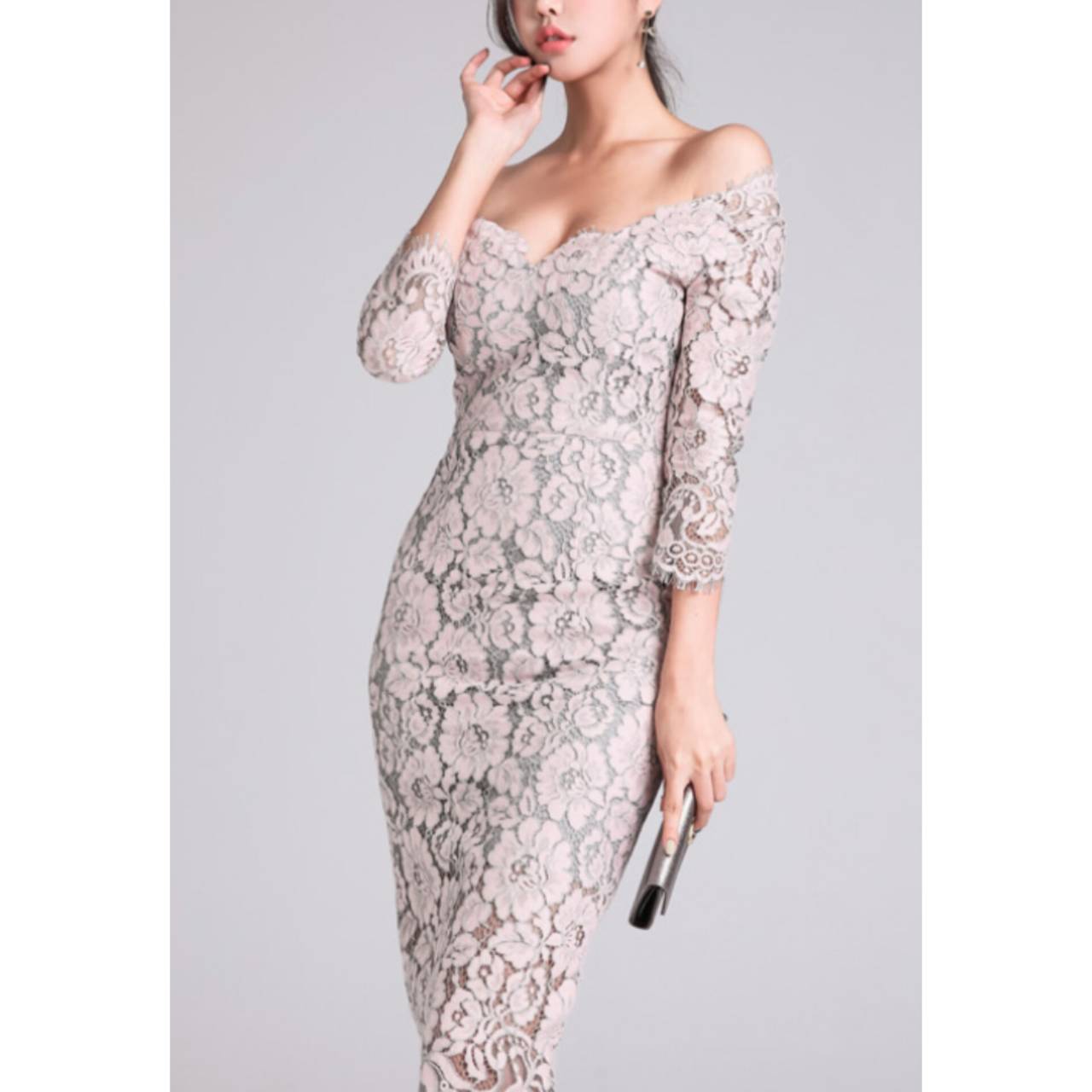 オールレース ドレス 韓国ドレス キャバドレス ナイトドレス オフショルダー オフショル お花 花柄 総レース Vネック 7分袖 ハイウエスト ミディアム丈 膝丈 タイト バックスリット 美シルエット 脚長効果 スタイルアップ S/XL 韓国【K8504】