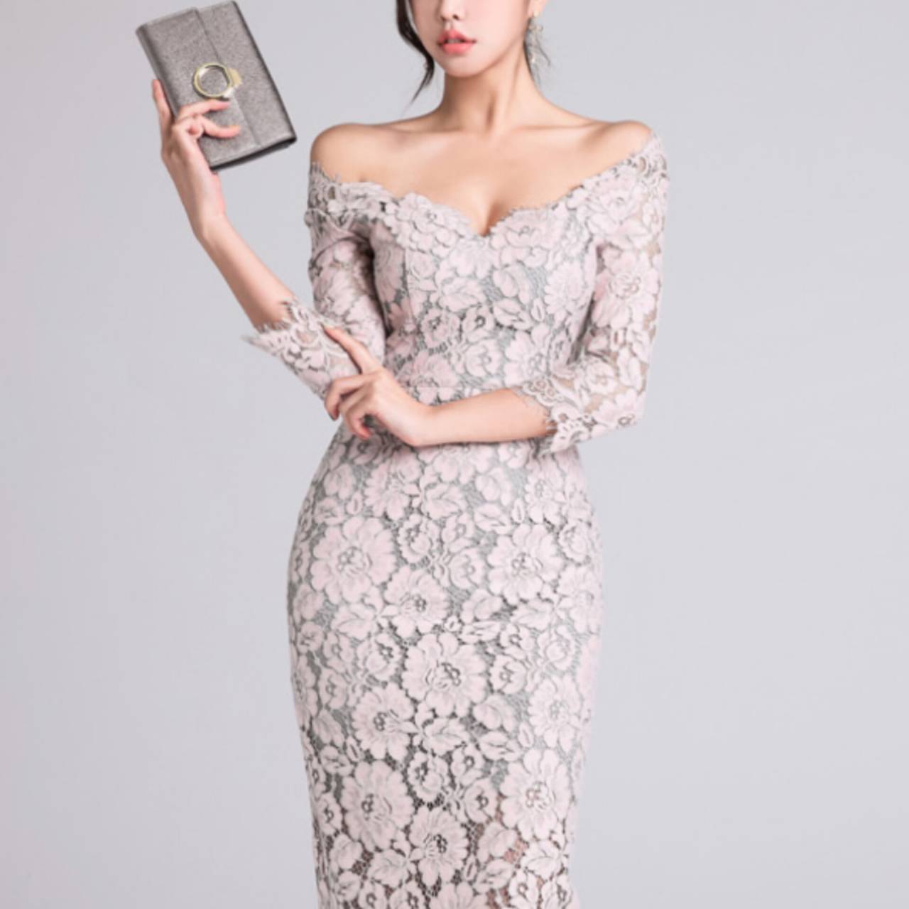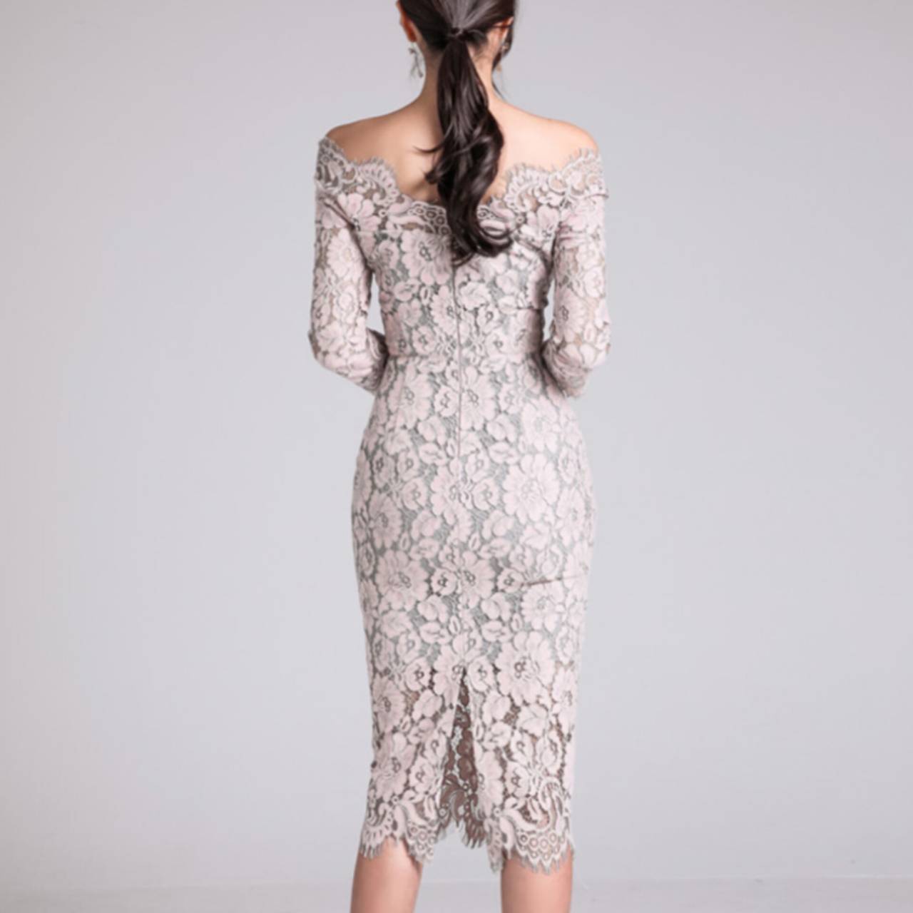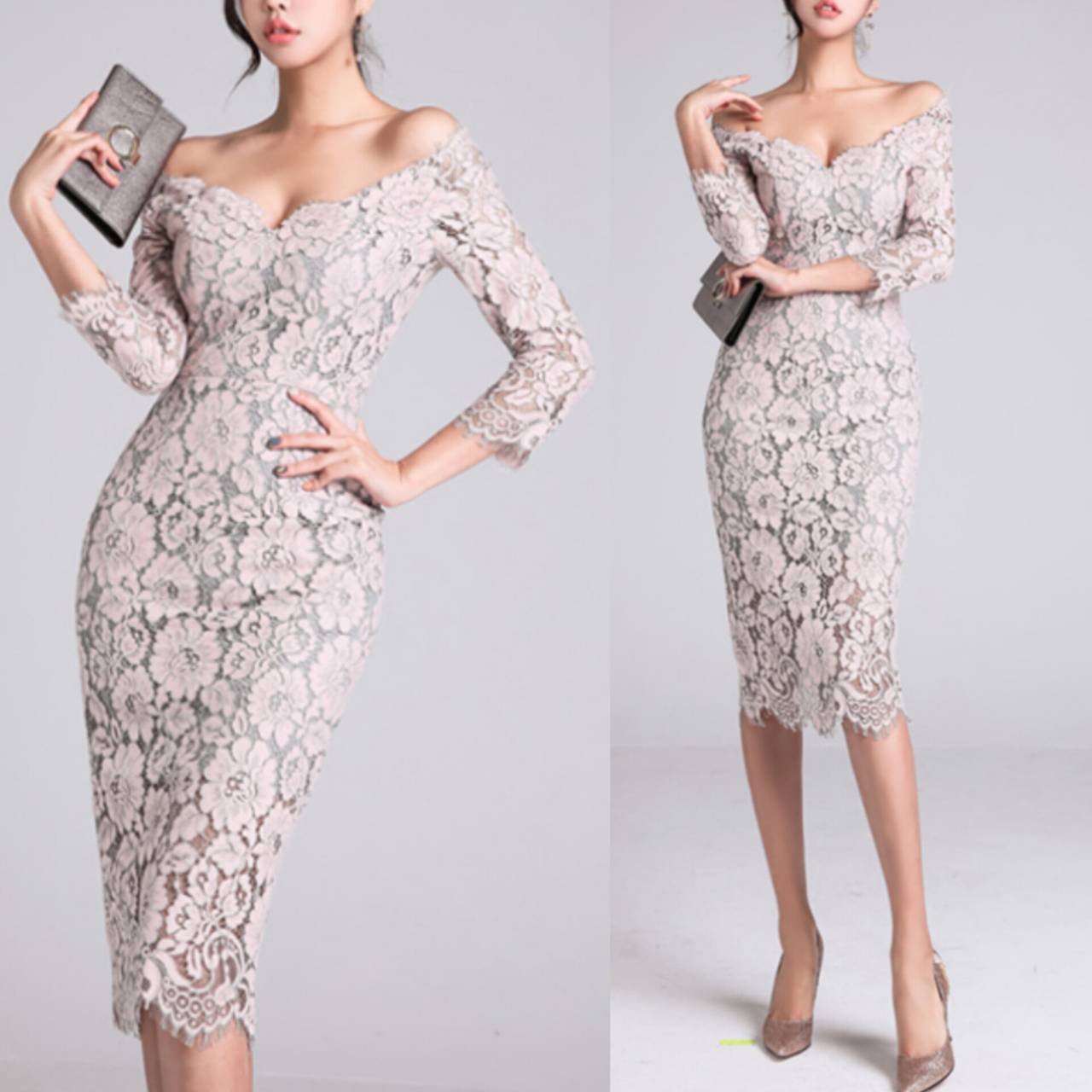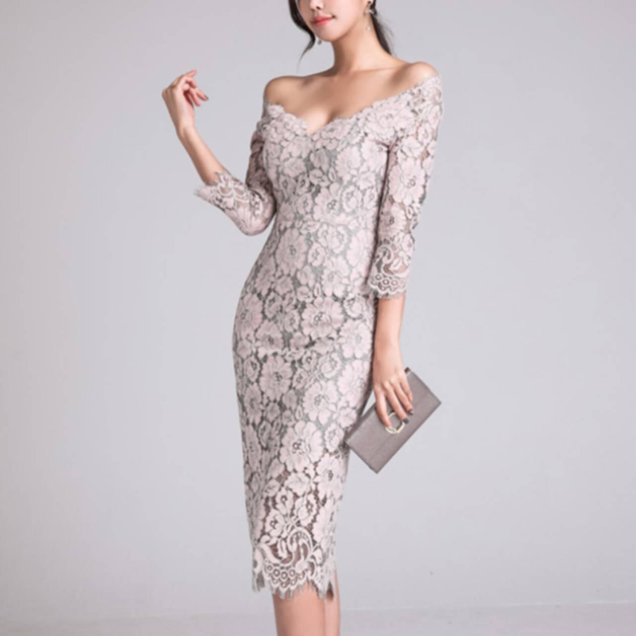 オールレース ドレス 韓国ドレス キャバドレス ナイトドレス オフショルダー オフショル お花 花柄 総レース Vネック 7分袖 ハイウエスト ミディアム丈 膝丈 タイト バックスリット 美シルエット 脚長効果 スタイルアップ S/XL 韓国【K8504】