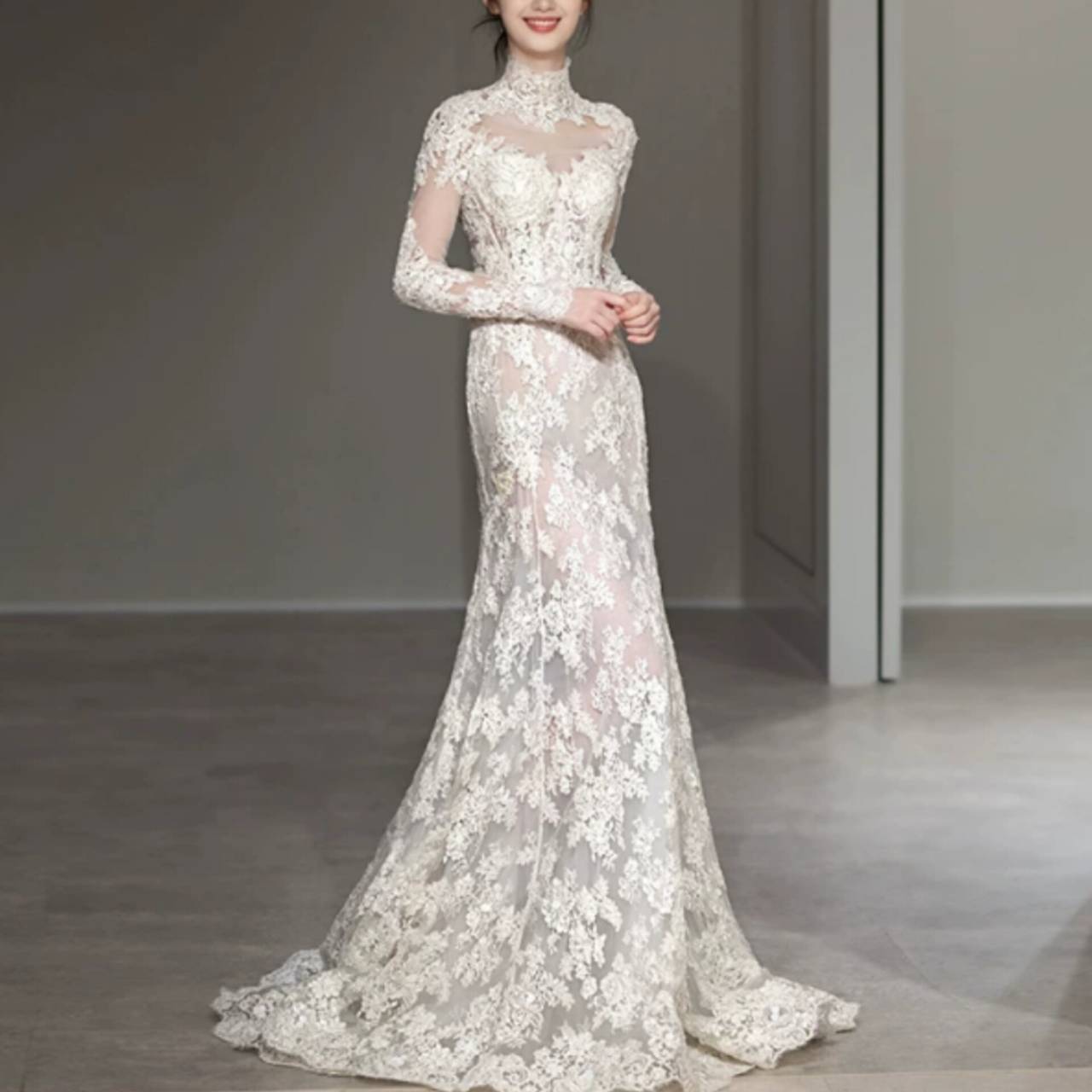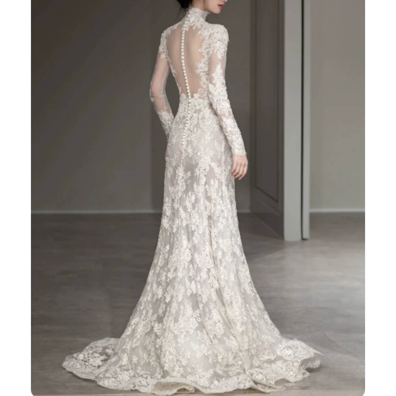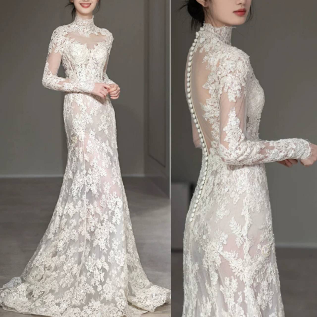 ハイネック ウェディングドレス 韓国ドレス オールレース 総レース レース シアー 花柄 お花 くるみボタン バックシアー シースルー バックコンシャス バックシャン ハイウエスト マーメイド ロング クラシック エレガント 美シルエット S/2XL 韓国【K9592】