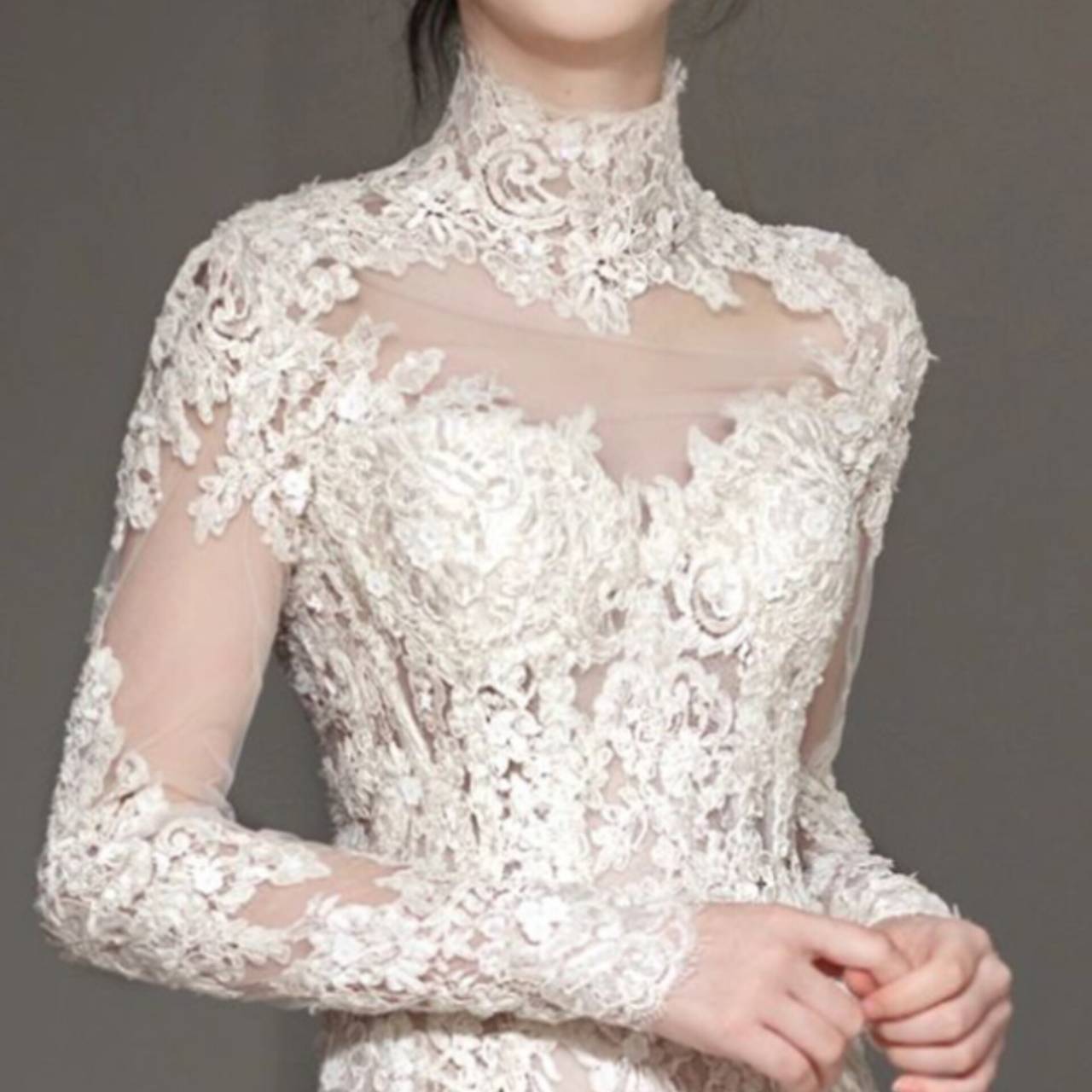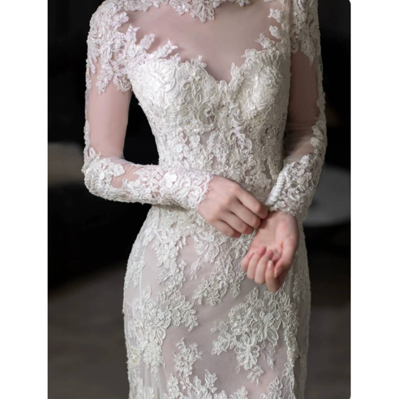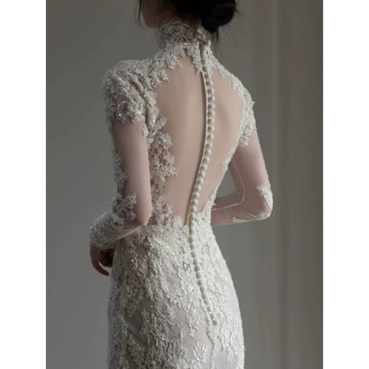 ハイネック ウェディングドレス 韓国ドレス オールレース 総レース レース シアー 花柄 お花 くるみボタン バックシアー シースルー バックコンシャス バックシャン ハイウエスト マーメイド ロング クラシック エレガント 美シルエット S/2XL 韓国【K9592】