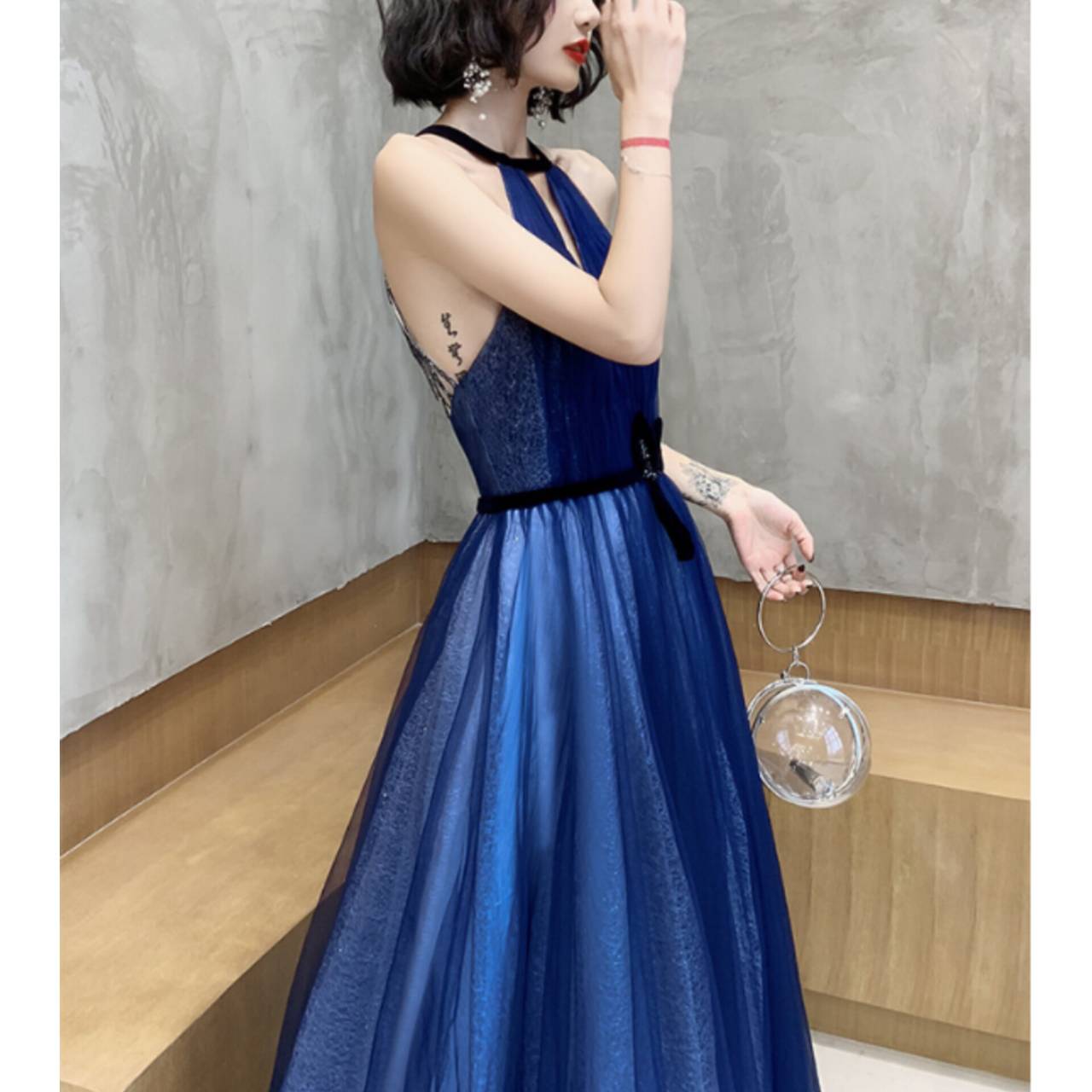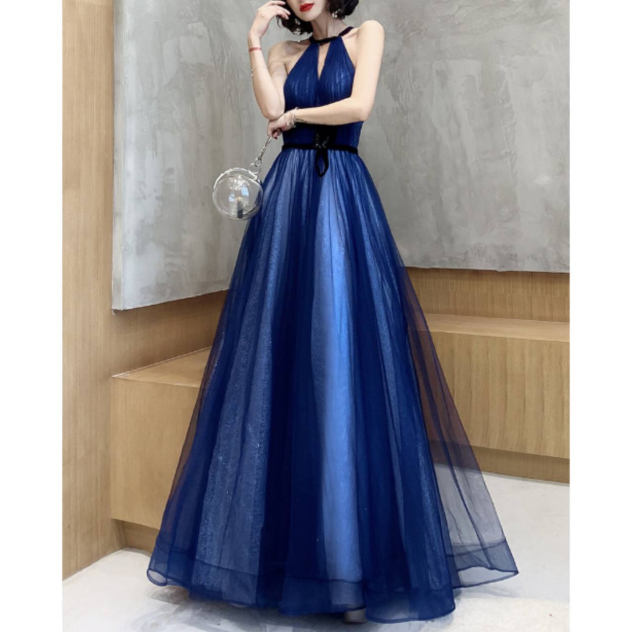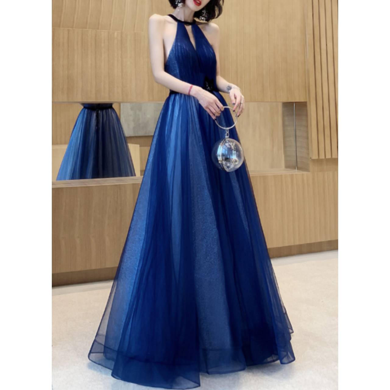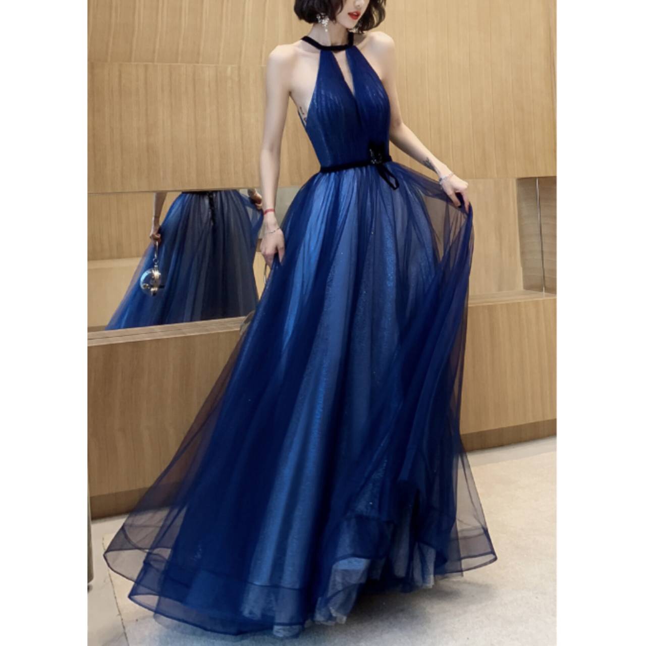 全3色 ドレス イブニングドレス 韓国ドレス ホルターネック バックオープン リボン バックコンシャス バックシャン ビジュー ラメ キラキラ ハイウエスト ウエストマーク Aライン フレア チュール ロング シアー グリッター エレガント 大人 XS/3XL 韓国【B7152】