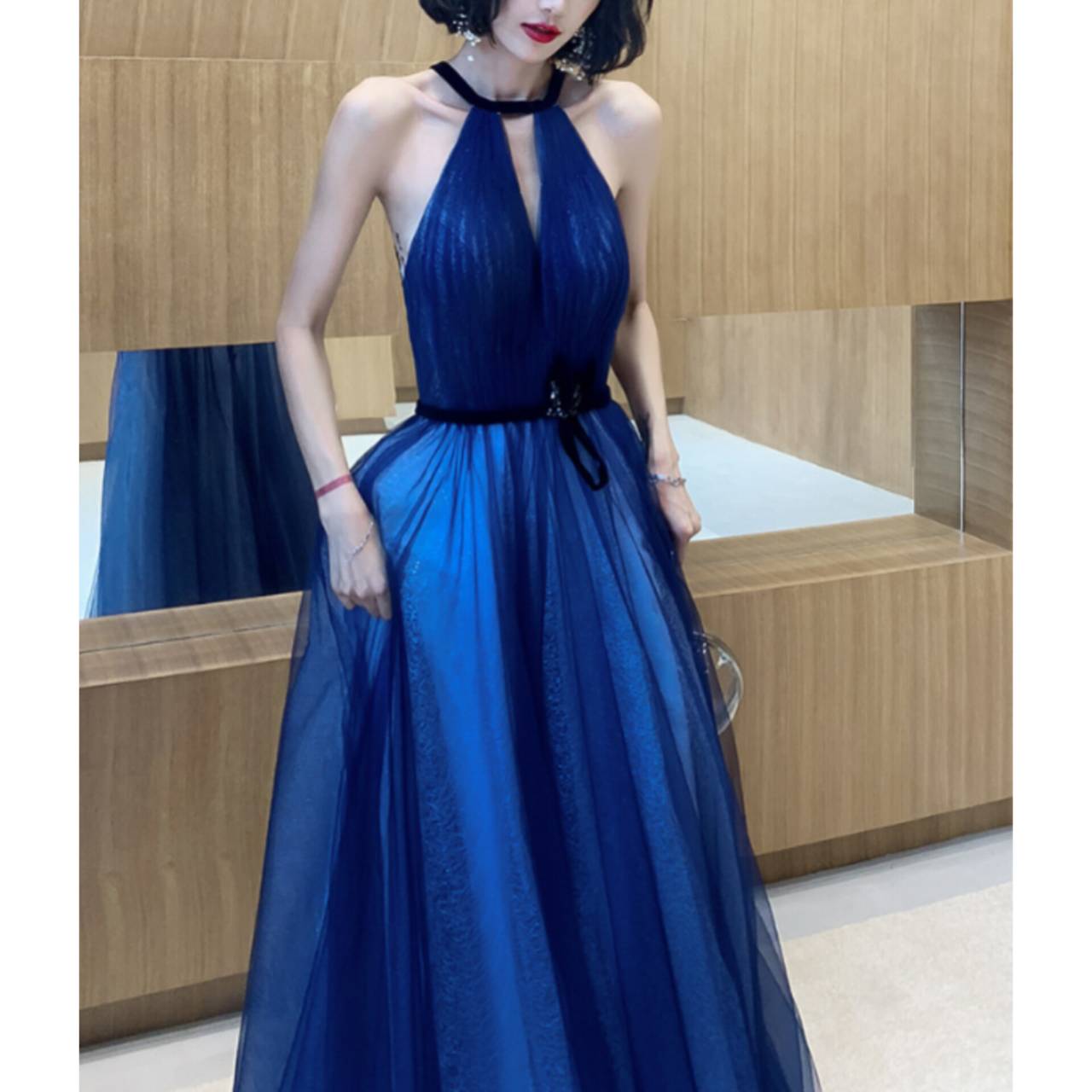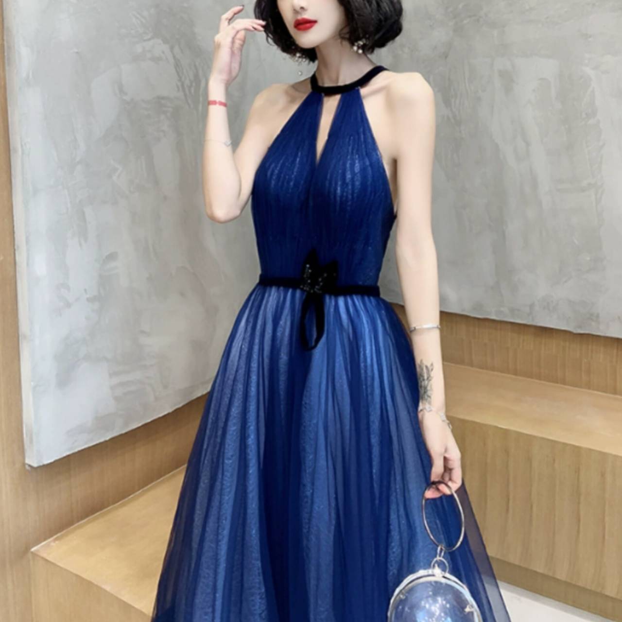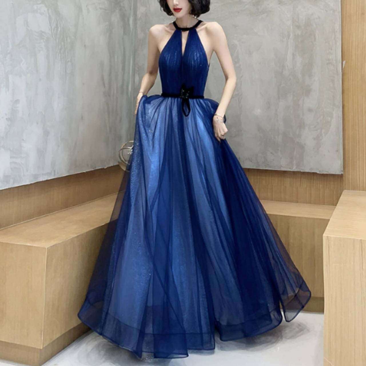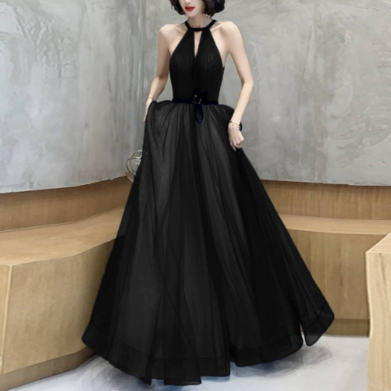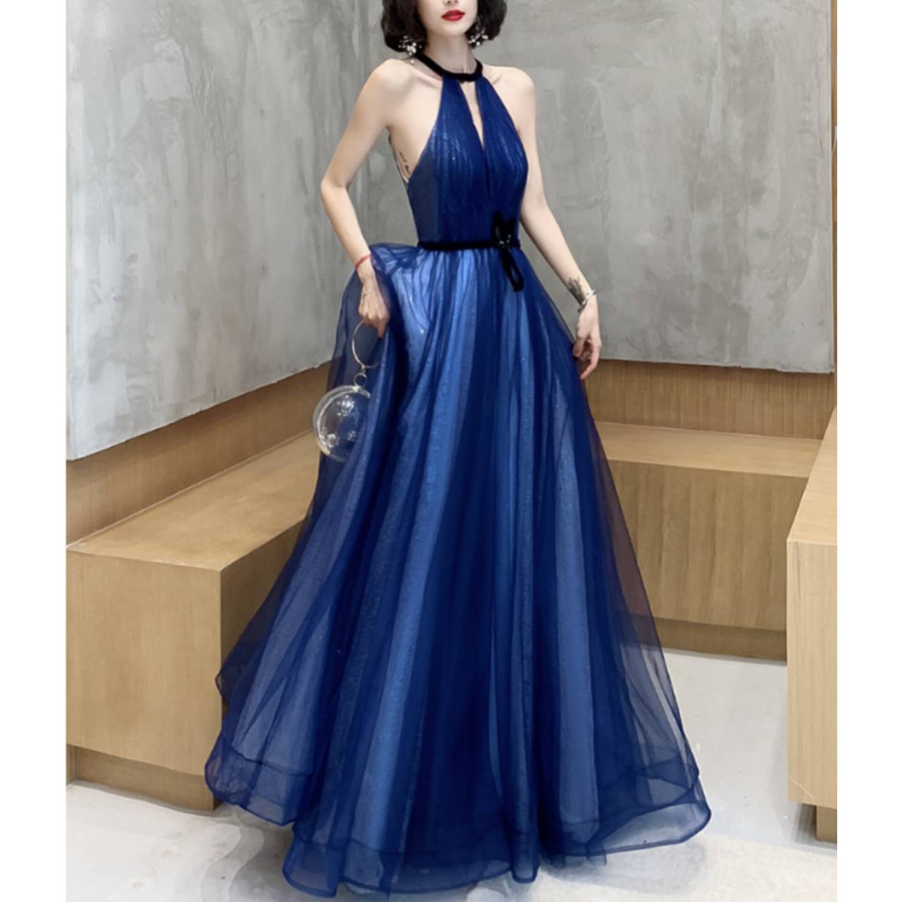 全3色 ドレス イブニングドレス 韓国ドレス ホルターネック バックオープン リボン バックコンシャス バックシャン ビジュー ラメ キラキラ ハイウエスト ウエストマーク Aライン フレア チュール ロング シアー グリッター エレガント 大人 XS/3XL 韓国【B7152】