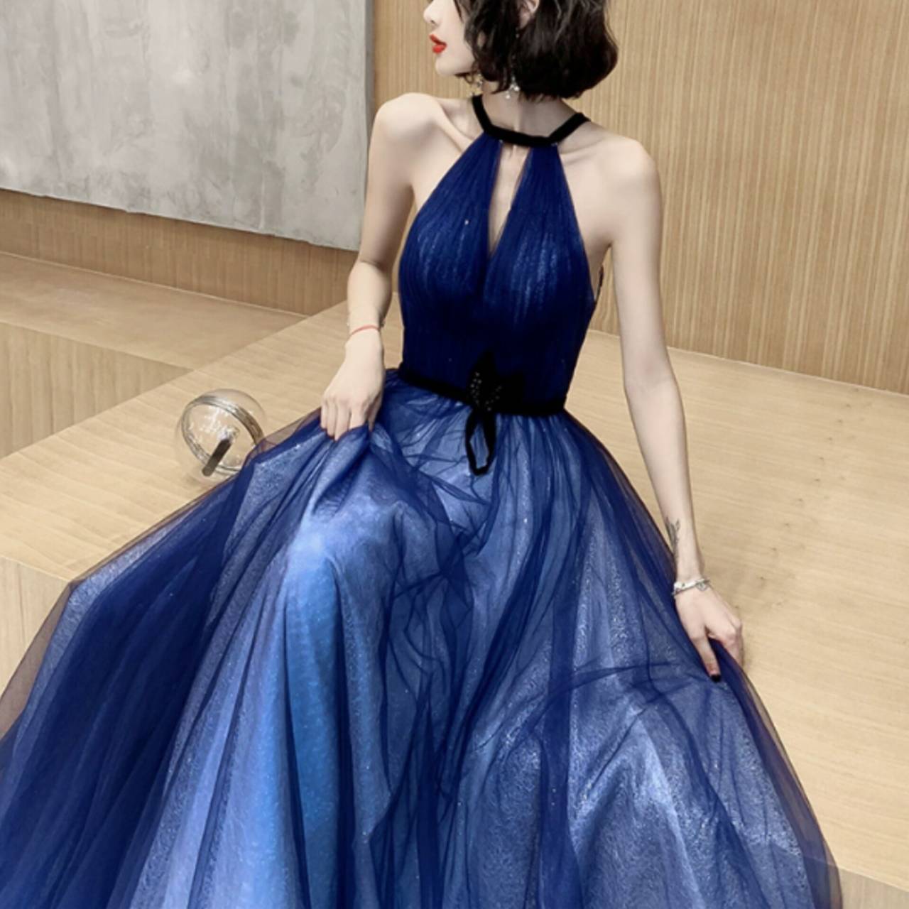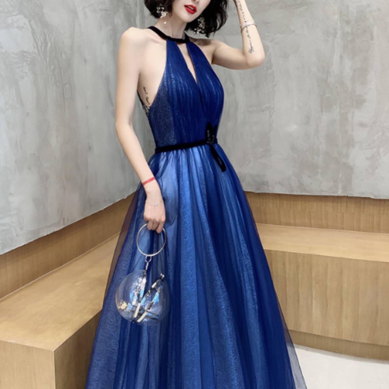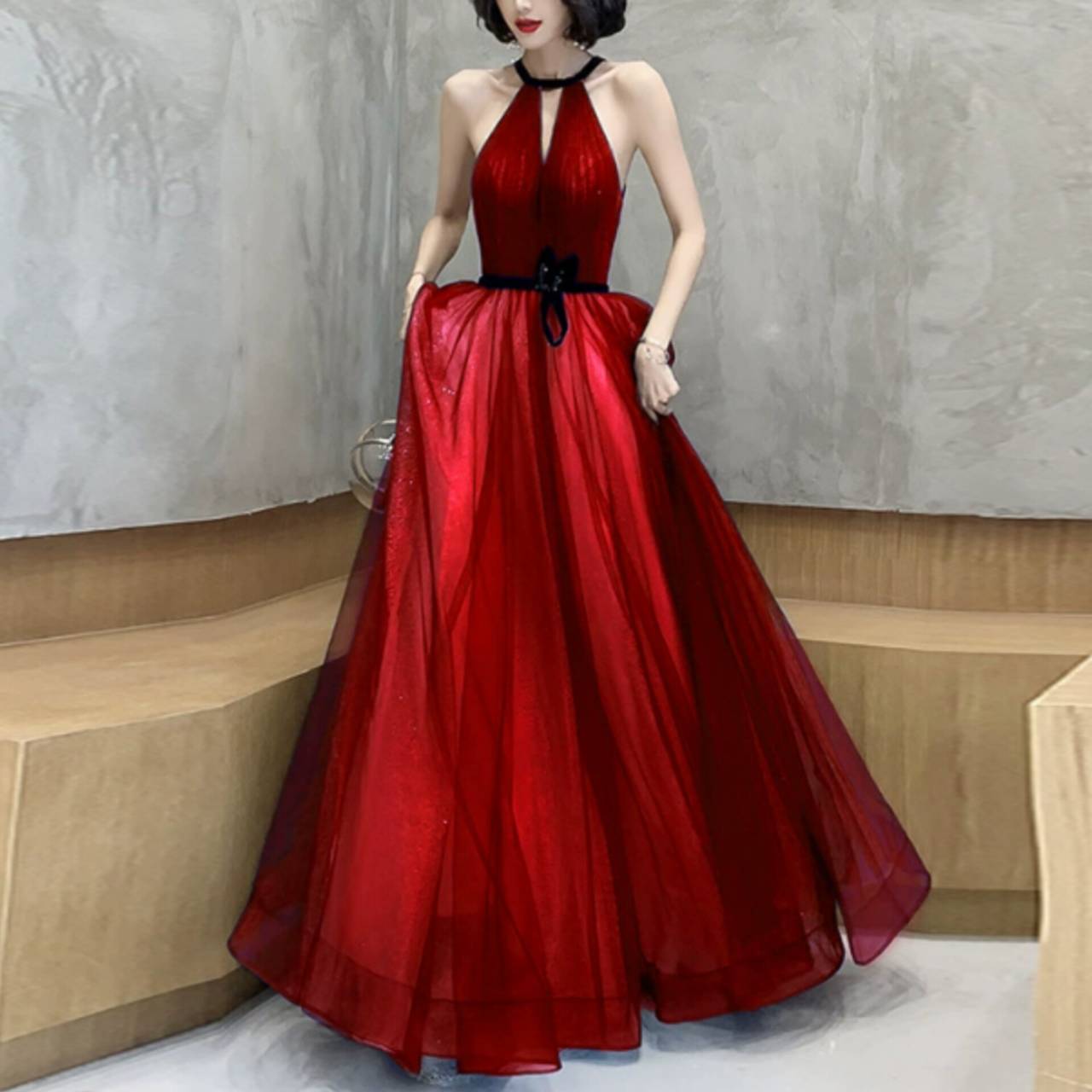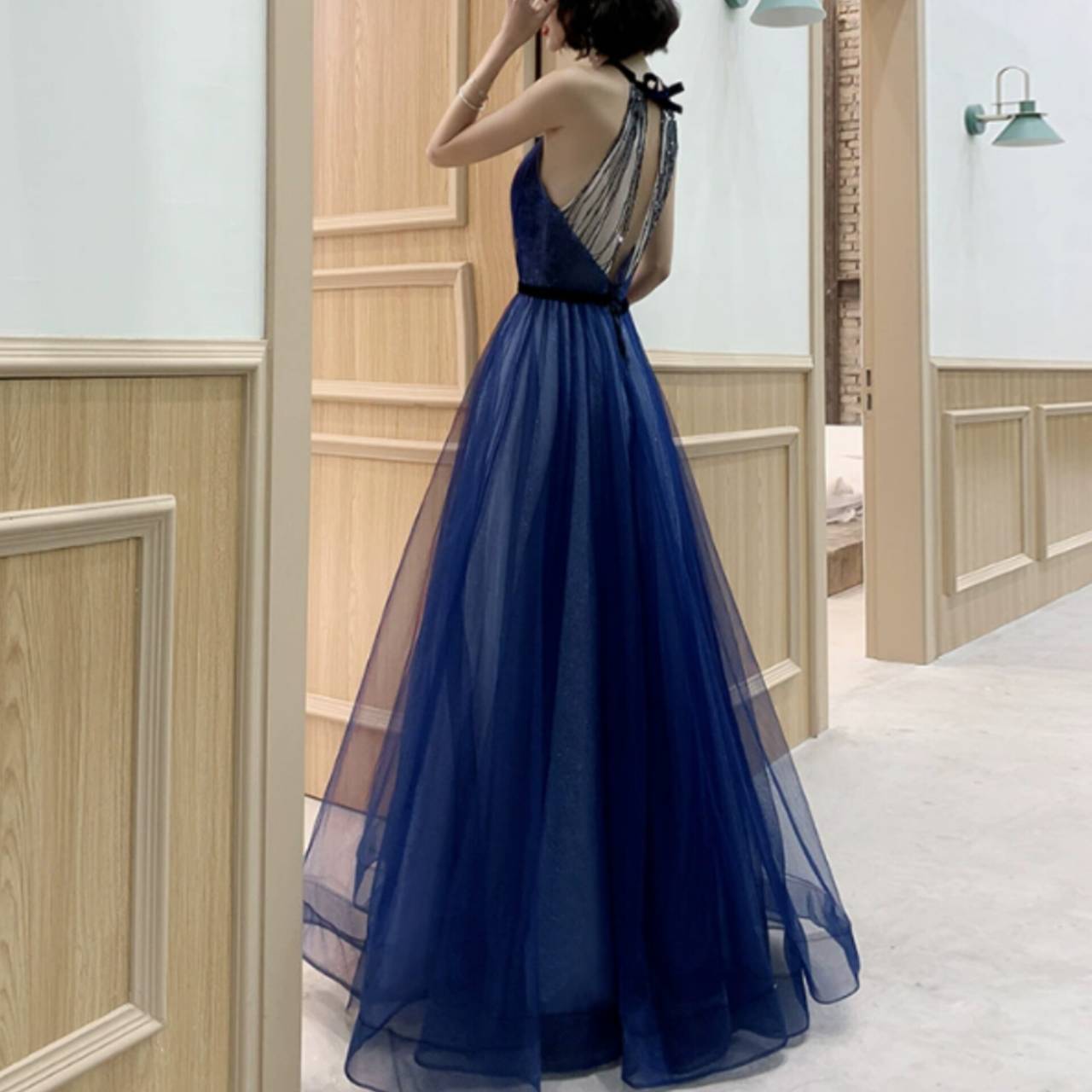 全3色 ドレス イブニングドレス 韓国ドレス ホルターネック バックオープン リボン バックコンシャス バックシャン ビジュー ラメ キラキラ ハイウエスト ウエストマーク Aライン フレア チュール ロング シアー グリッター エレガント 大人 XS/3XL 韓国【B7152】